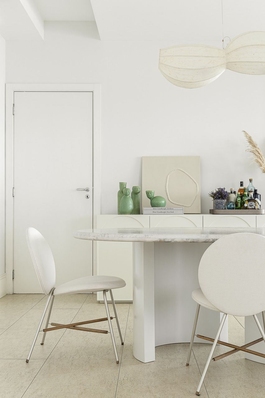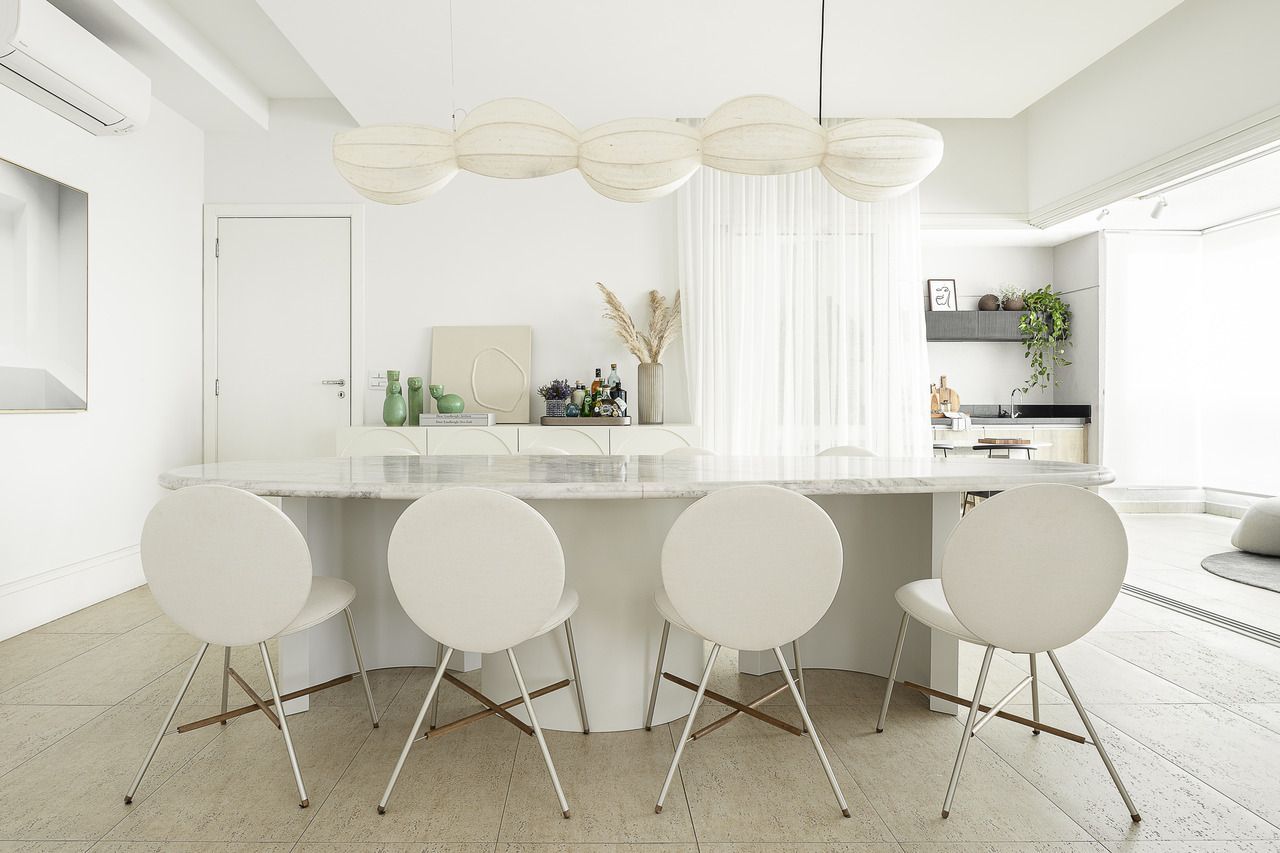 A área social, abrangendo o living, a sala de jantar e a varanda gourmet, foram integradas. A moradora tinha o desejo de ambientes com poucos móveis, muita luz natural. O projeto incorporou móveis soltos, linhas orgânicas, peças de design, arte e artesanato.