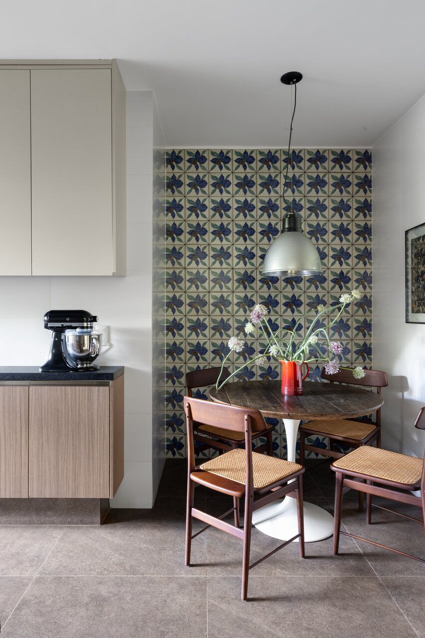Um dos destaques do projeto é o painel cerâmico, que foi incorporado à cozinha a pedido do casal. Na copa, foi criado um espaço aconchegante para refeições rápidas, com uma mesa redonda e cadeiras desenhadas, peças que reforçam a estética moderna e funcional do projeto.