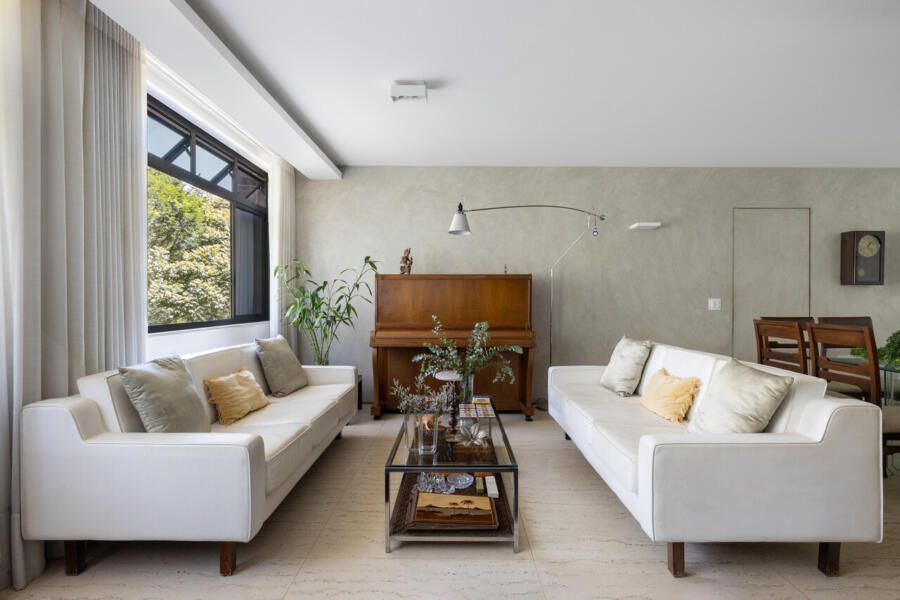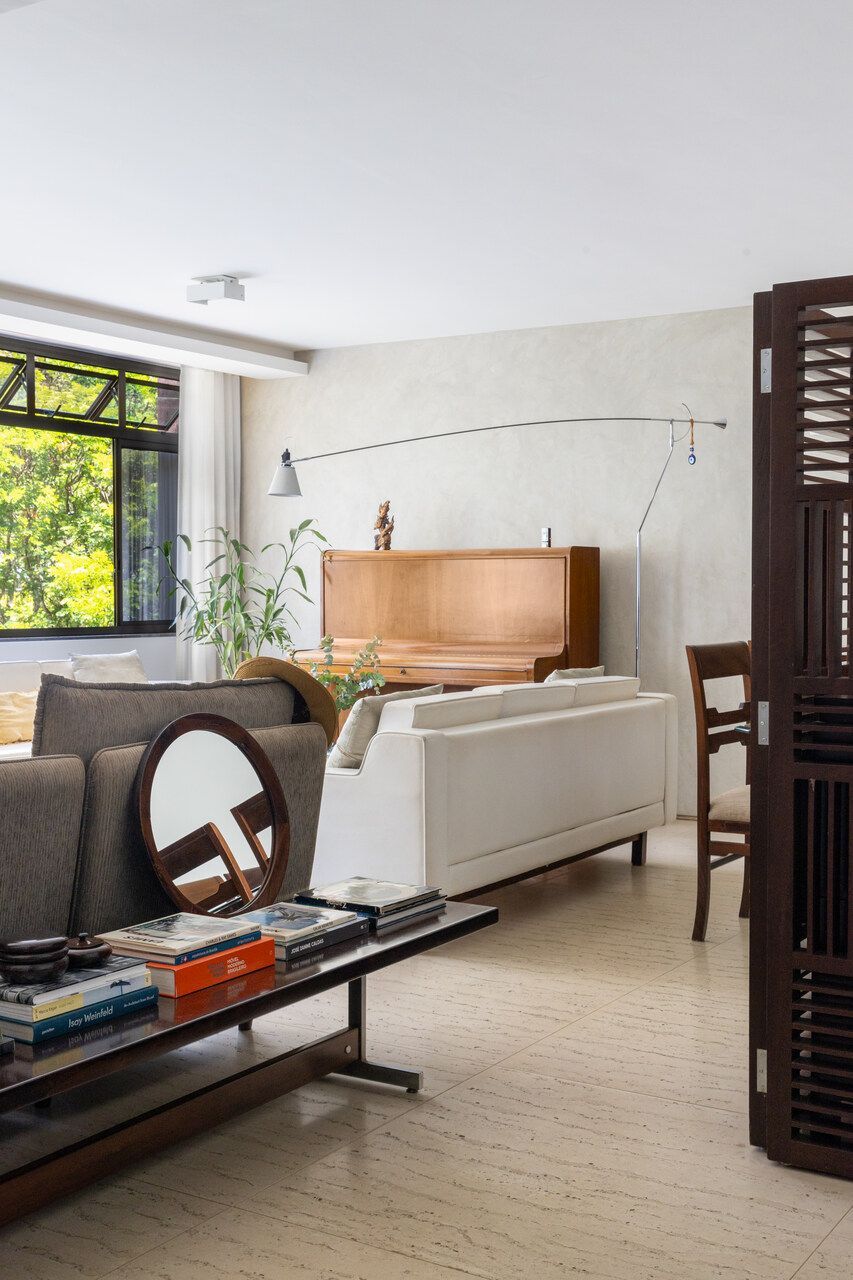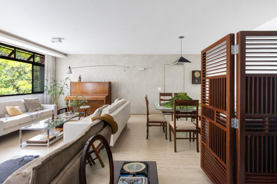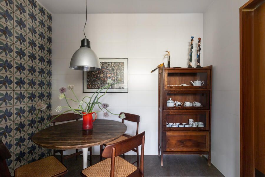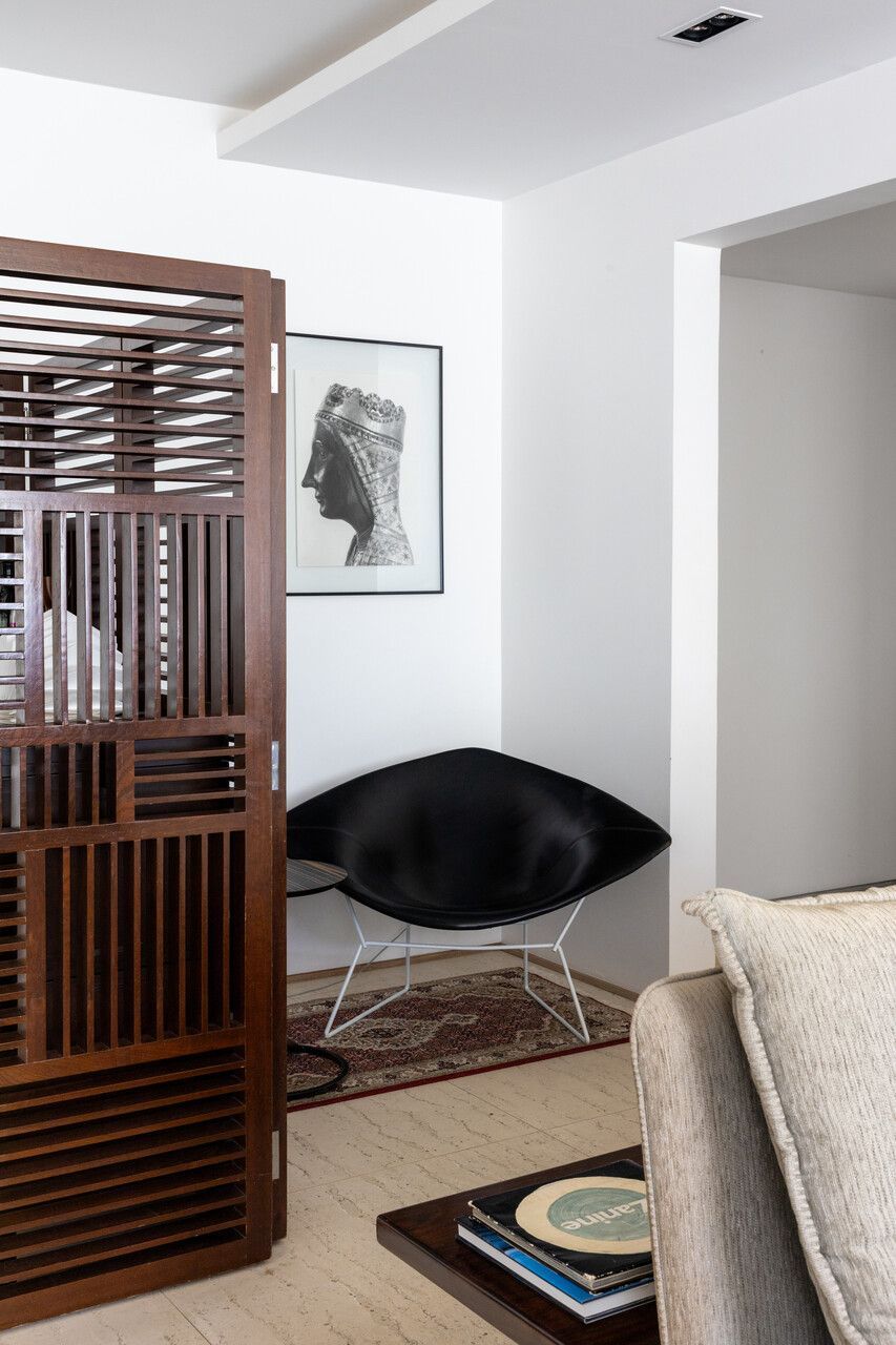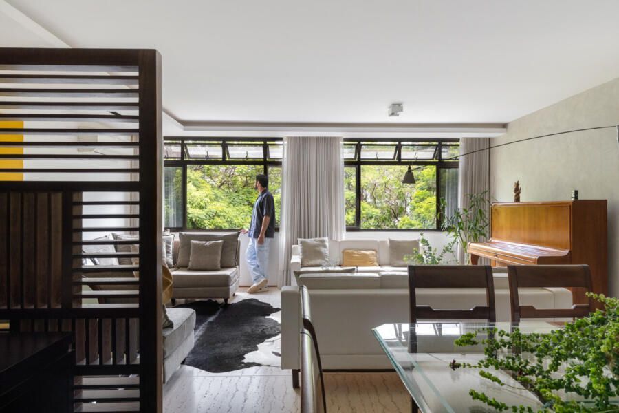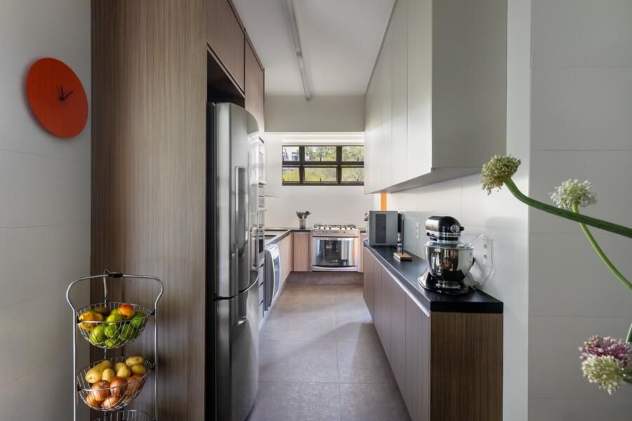 Um dos principais pedidos dos moradores foi manter a cozinha isolada da área social, algo pouco comum nos projetos atuais. Esse pedido abriu espaço para novas opções de distribuição do ambiente, sem abrir mão da funcionalidade. O casal queria criar um ambiente que resgatasse memórias afetivas e que fosse confortável para o dia a dia, trazendo também peças de mobiliário de grande valor sentimental, adquiridas no final dos anos 1960. Essas peças ajudaram a criar uma atmosfera modernista única no apartamento.