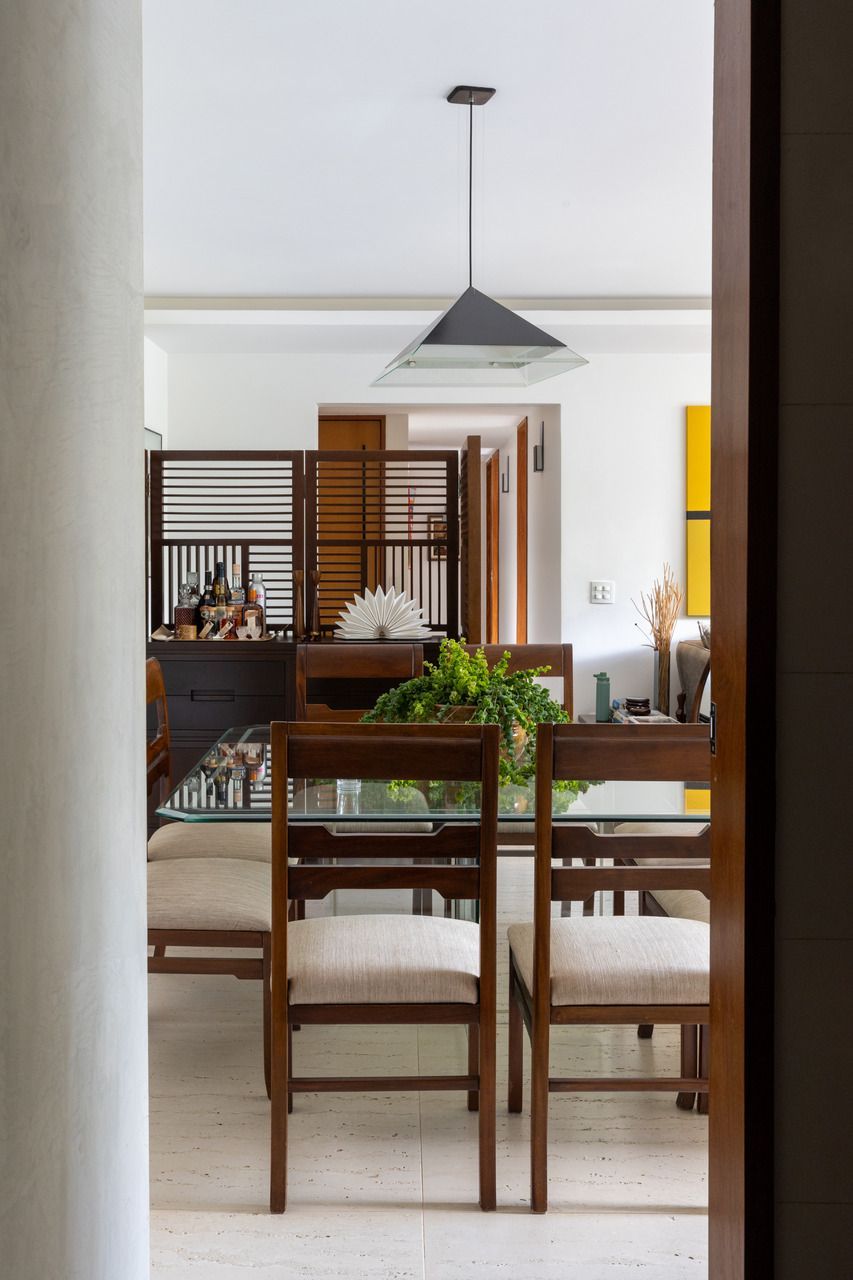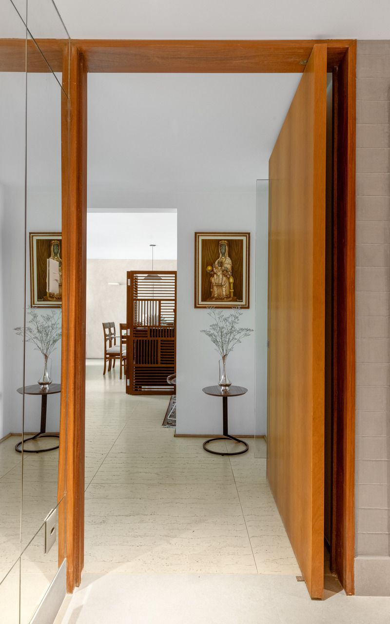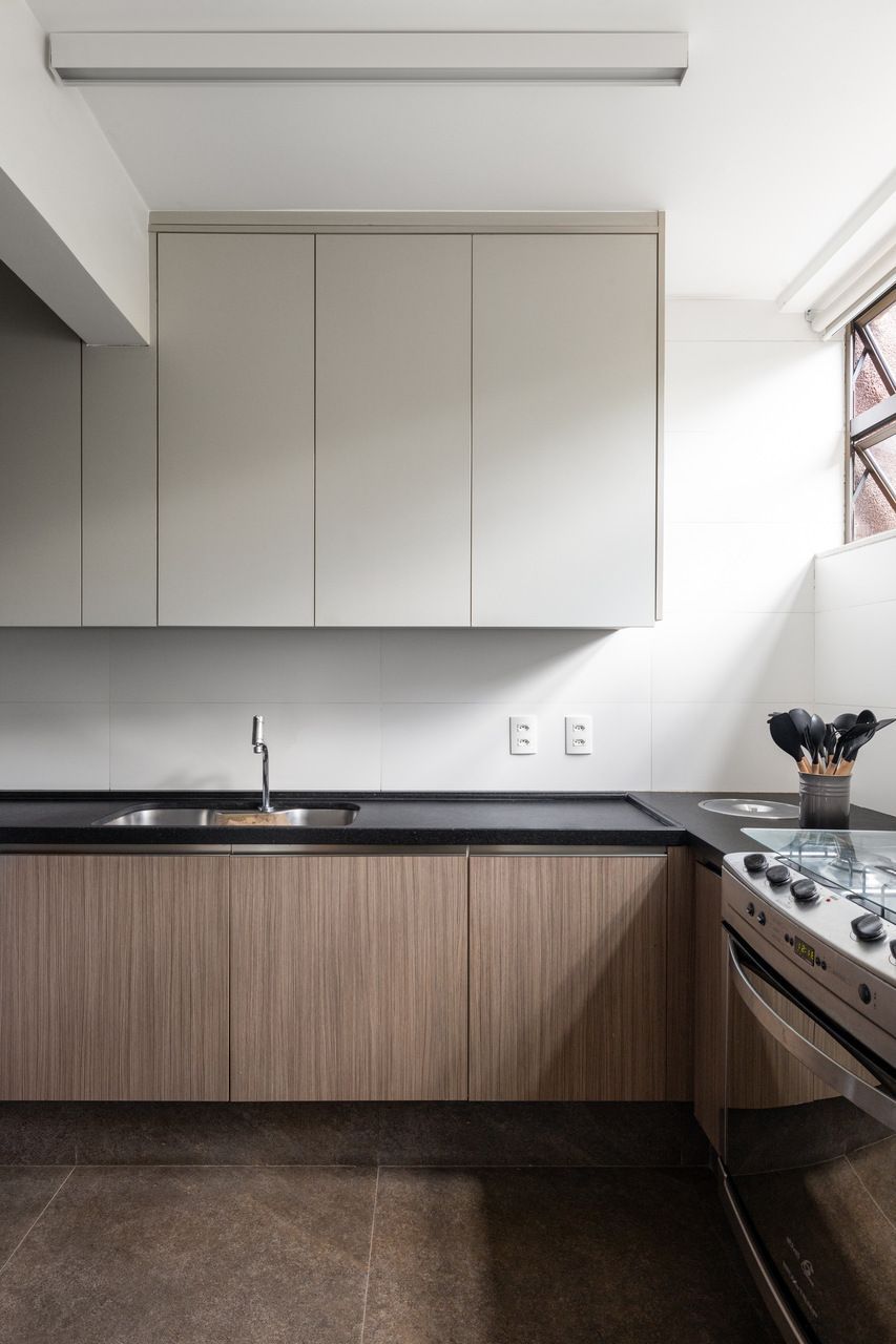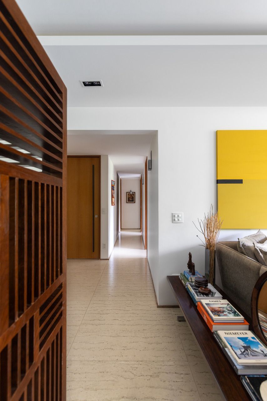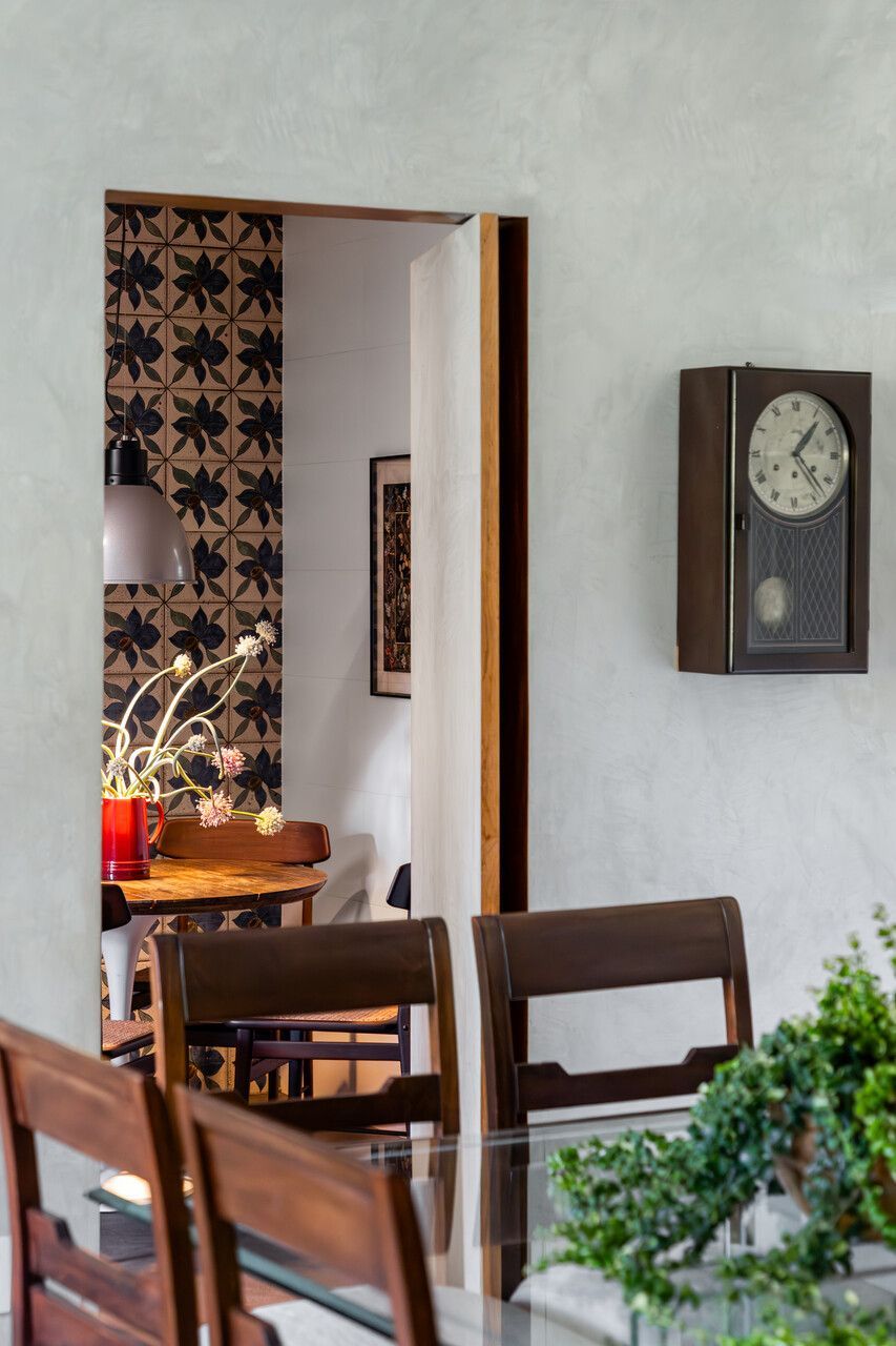 Um dos principais pedidos dos moradores foi manter a cozinha isolada da área social, algo pouco comum nos projetos atuais. Esse pedido abriu espaço para novas opções de distribuição do ambiente, sem abrir mão da funcionalidade. O casal queria criar um ambiente que resgatasse memórias afetivas e que fosse confortável para o dia a dia, trazendo também peças de mobiliário de grande valor sentimental, adquiridas no final dos anos 1960. Essas peças ajudaram a criar uma atmosfera modernista única no apartamento.