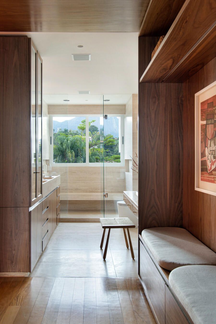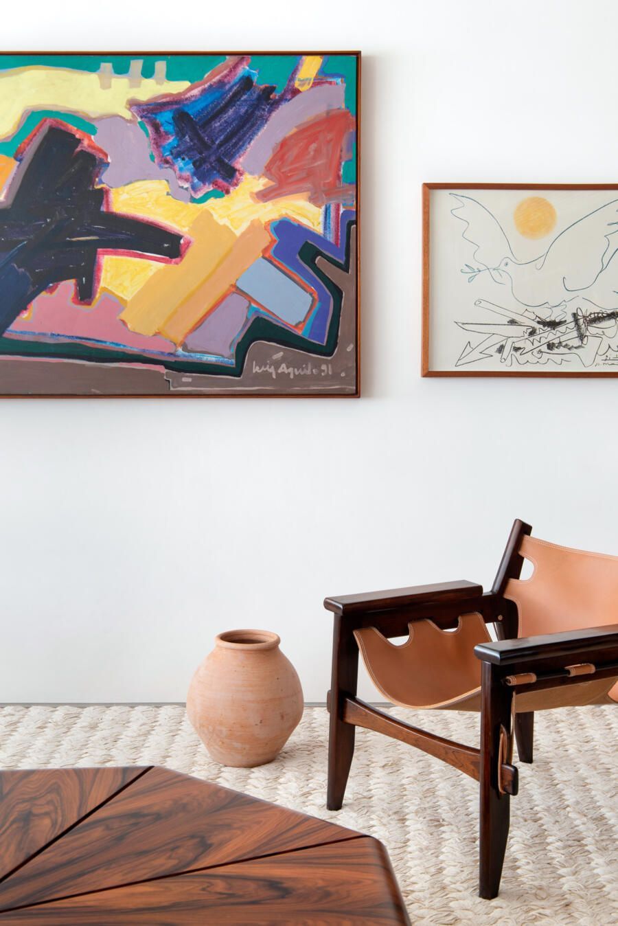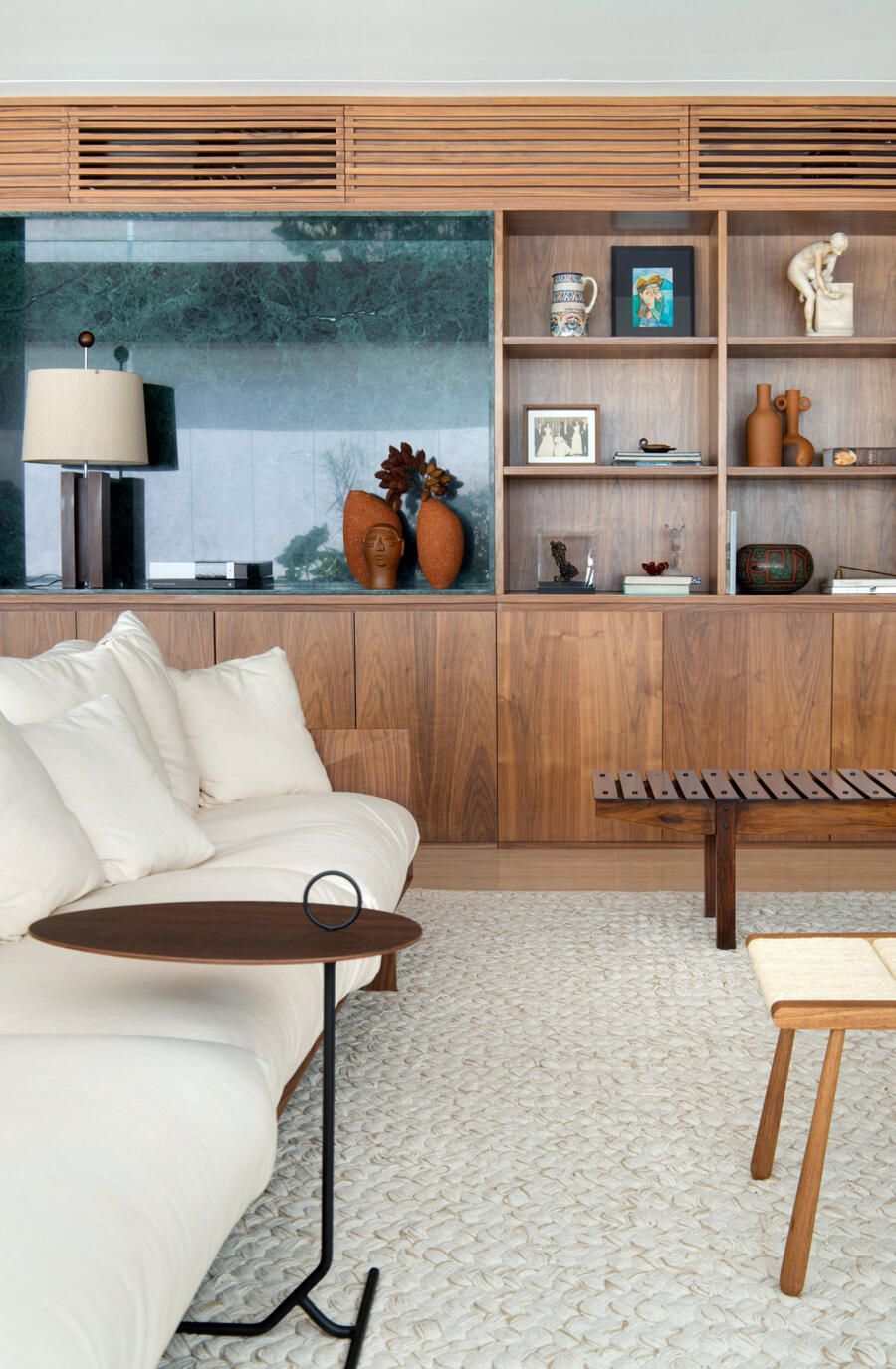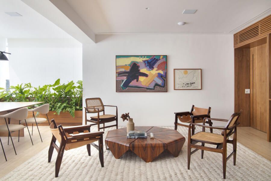 Para o acabamento, apenas três materiais: mármore travertino no piso, madeira nogueira na marcenaria e paredes brancas. Entre o acervo, obras de Luiz Aquila, Picasso e Burle Marx, e mobiliário de Jorge Zaslzupin, Sergio Rodrigues e Jader Almeida.