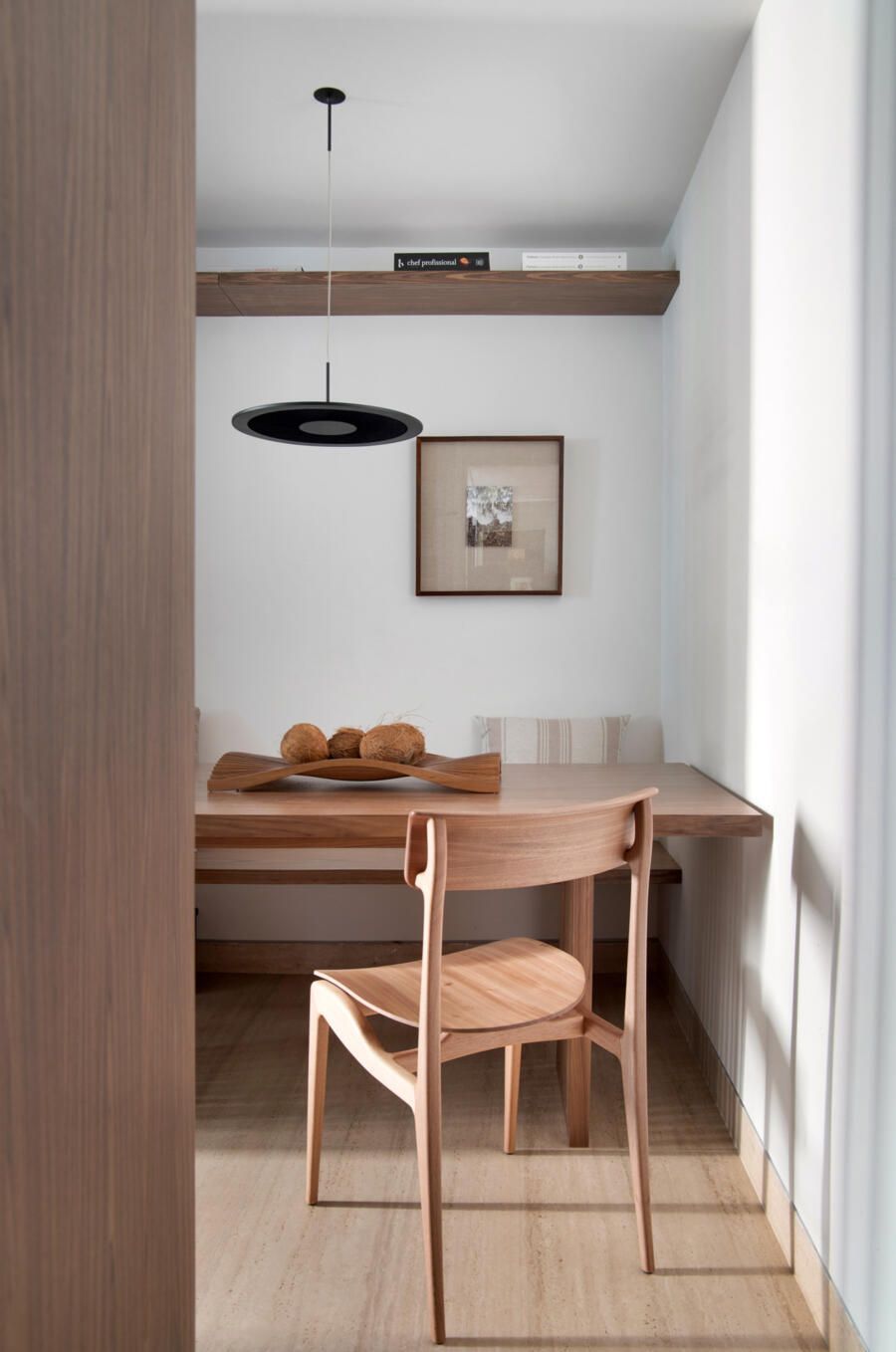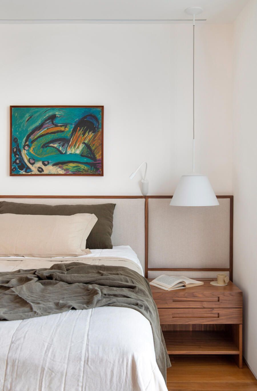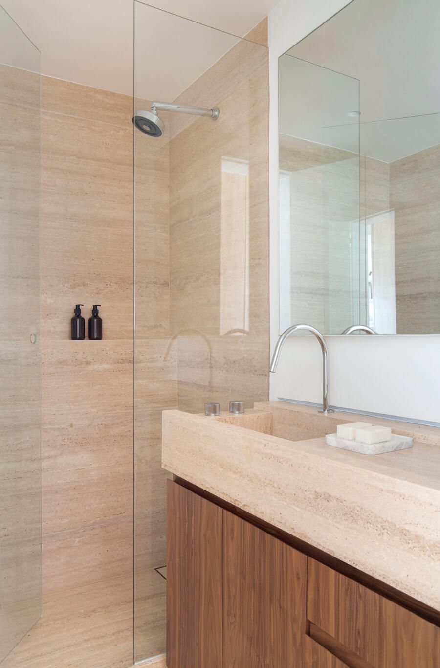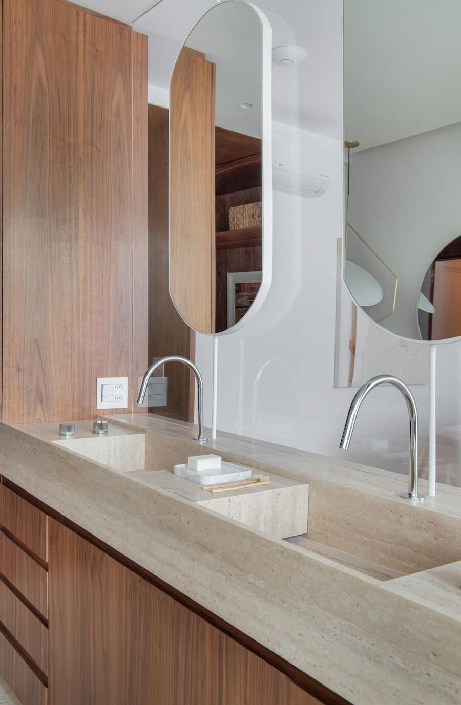 Para o acabamento, apenas três materiais: mármore travertino no piso, madeira nogueira na marcenaria e paredes brancas. Entre o acervo, obras de Luiz Aquila, Picasso e Burle Marx, e mobiliário de Jorge Zaslzupin, Sergio Rodrigues e Jader Almeida.