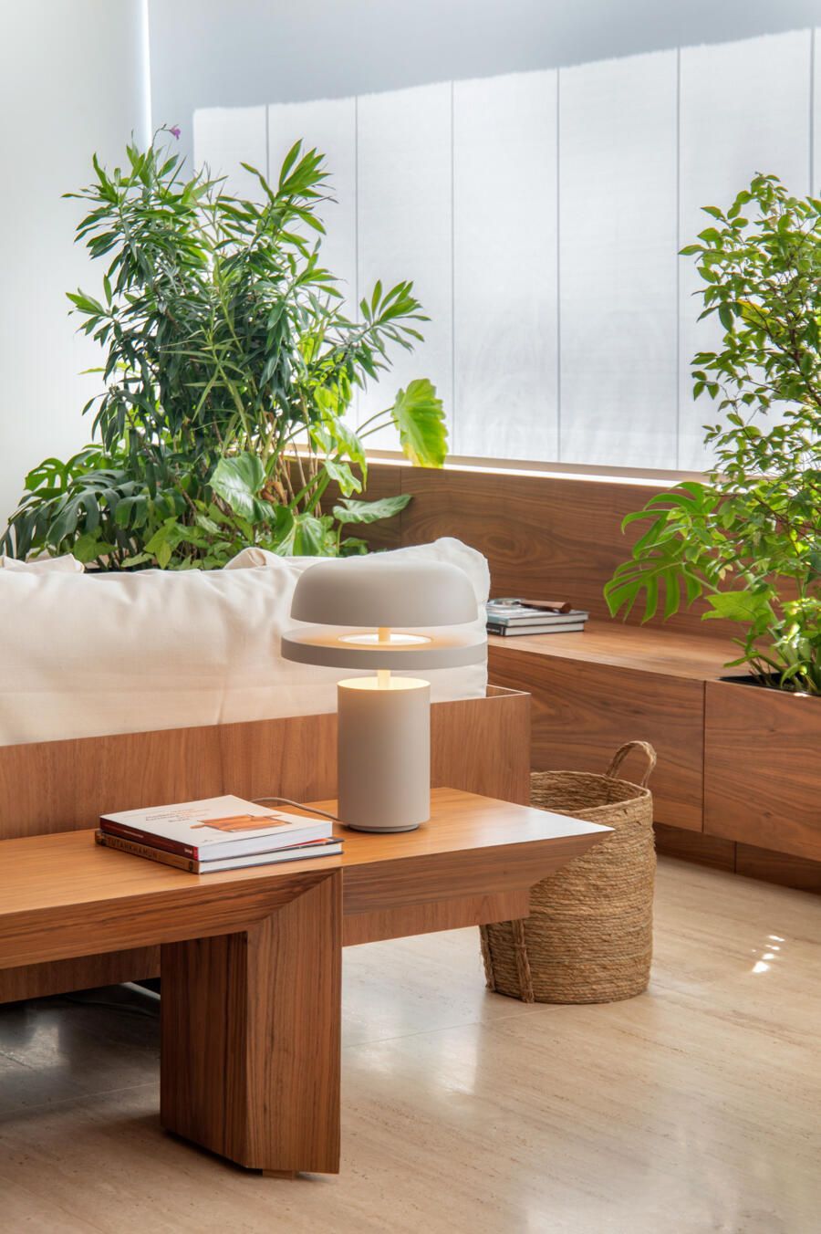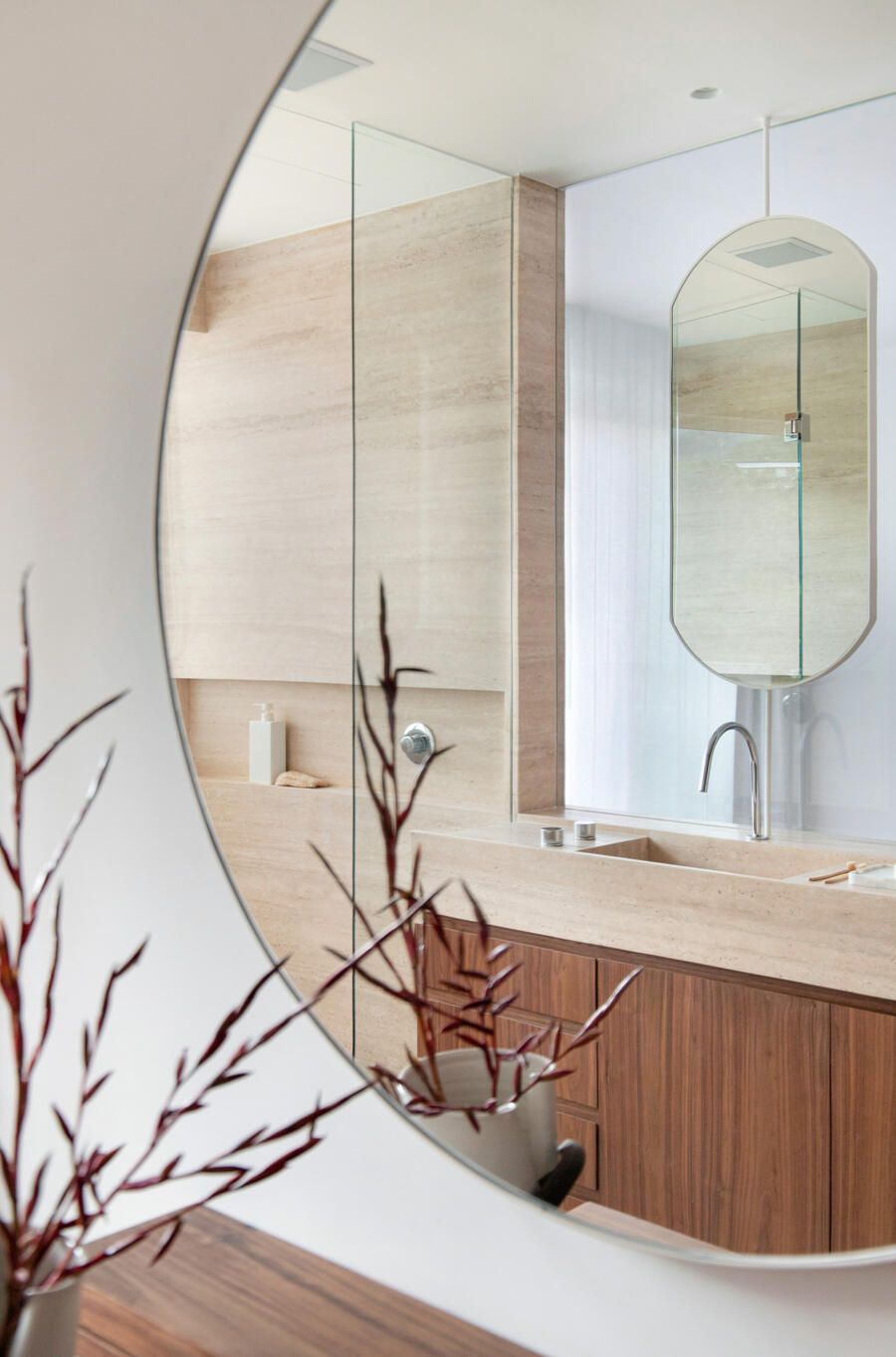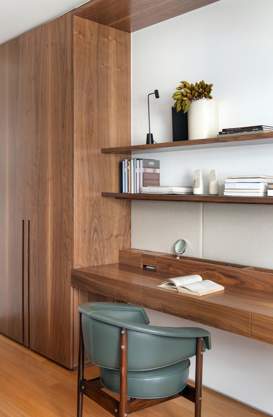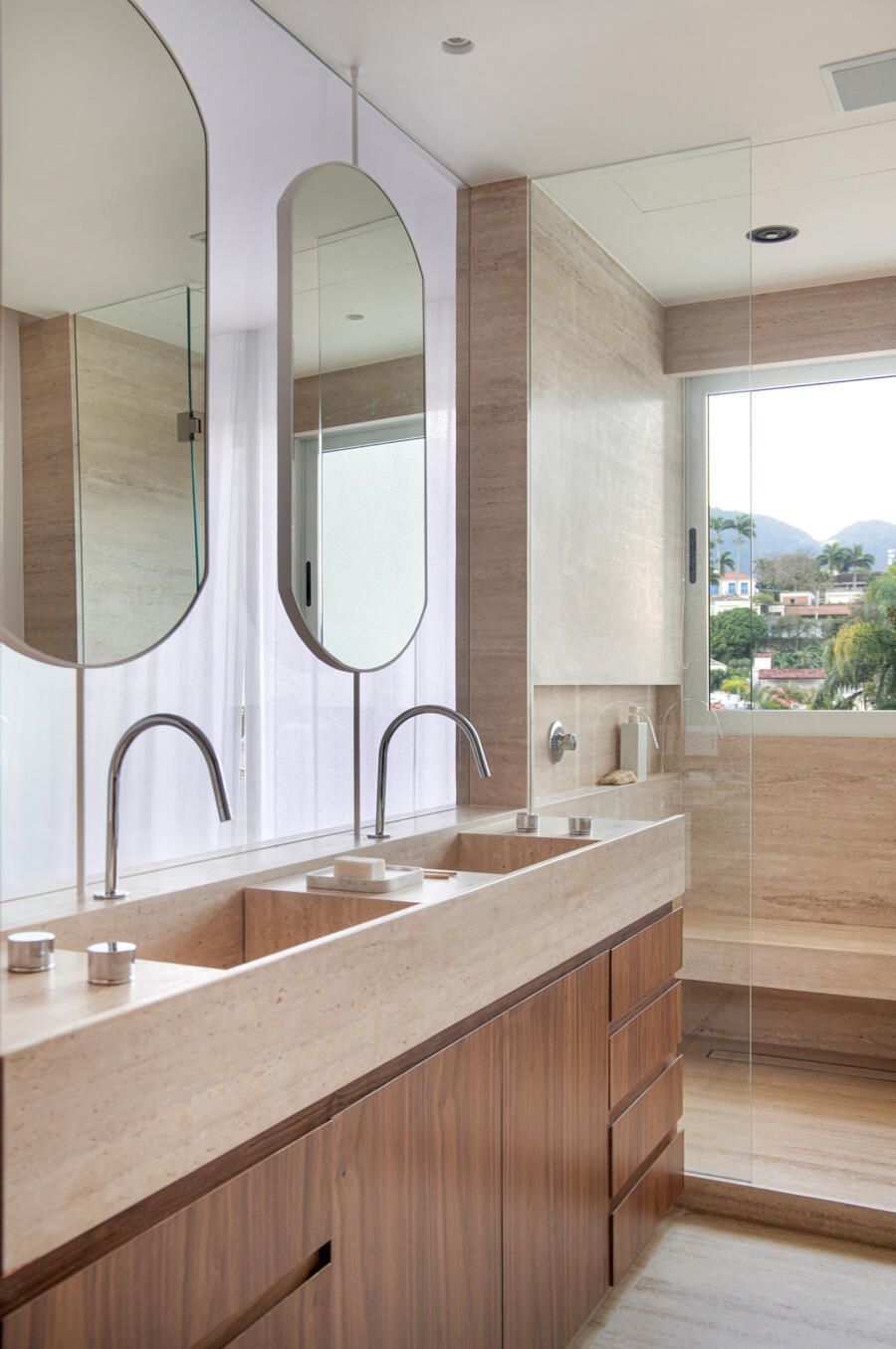 Para o acabamento, apenas três materiais: mármore travertino no piso, madeira nogueira na marcenaria e paredes brancas. Entre o acervo, obras de Luiz Aquila, Picasso e Burle Marx, e mobiliário de Jorge Zaslzupin, Sergio Rodrigues e Jader Almeida.