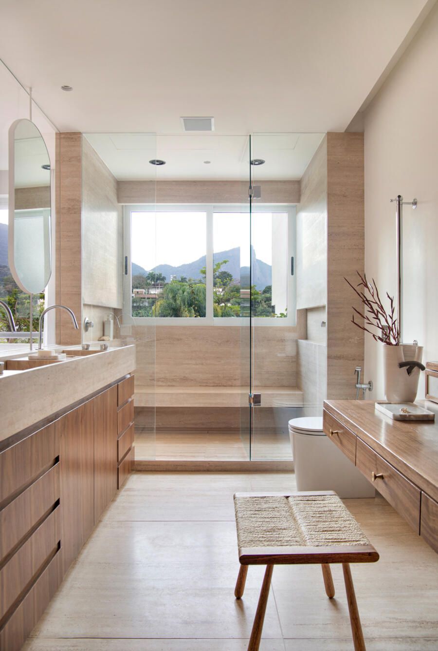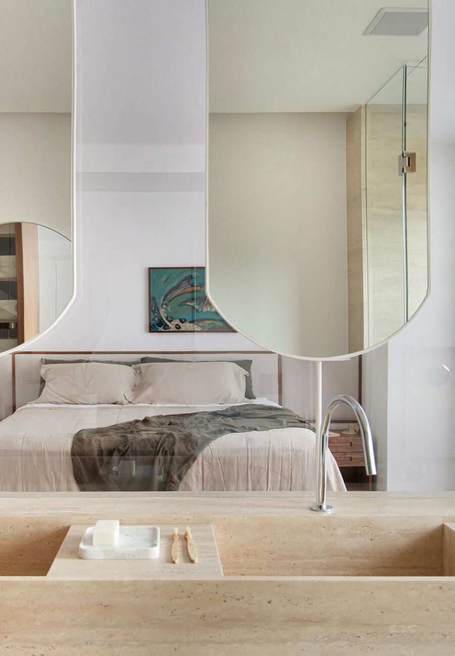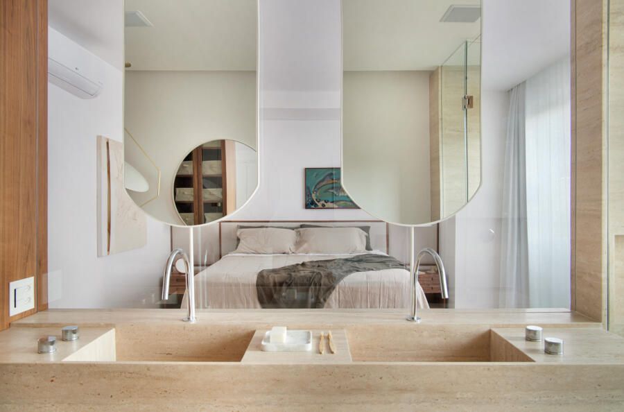 A integração na maioria dos cômodos proporcionou amplitude e uma suíte master muito espaçosa, com direito a closet walk-in e banheiro também integrado ao dormitório. Na decoração, uma base neutra foi escolhida para deixar como protagonista a vista com o Cristo Redentor ao fundo, e o mobiliário deu destaque às peças modernistas que os clientes já tinham.