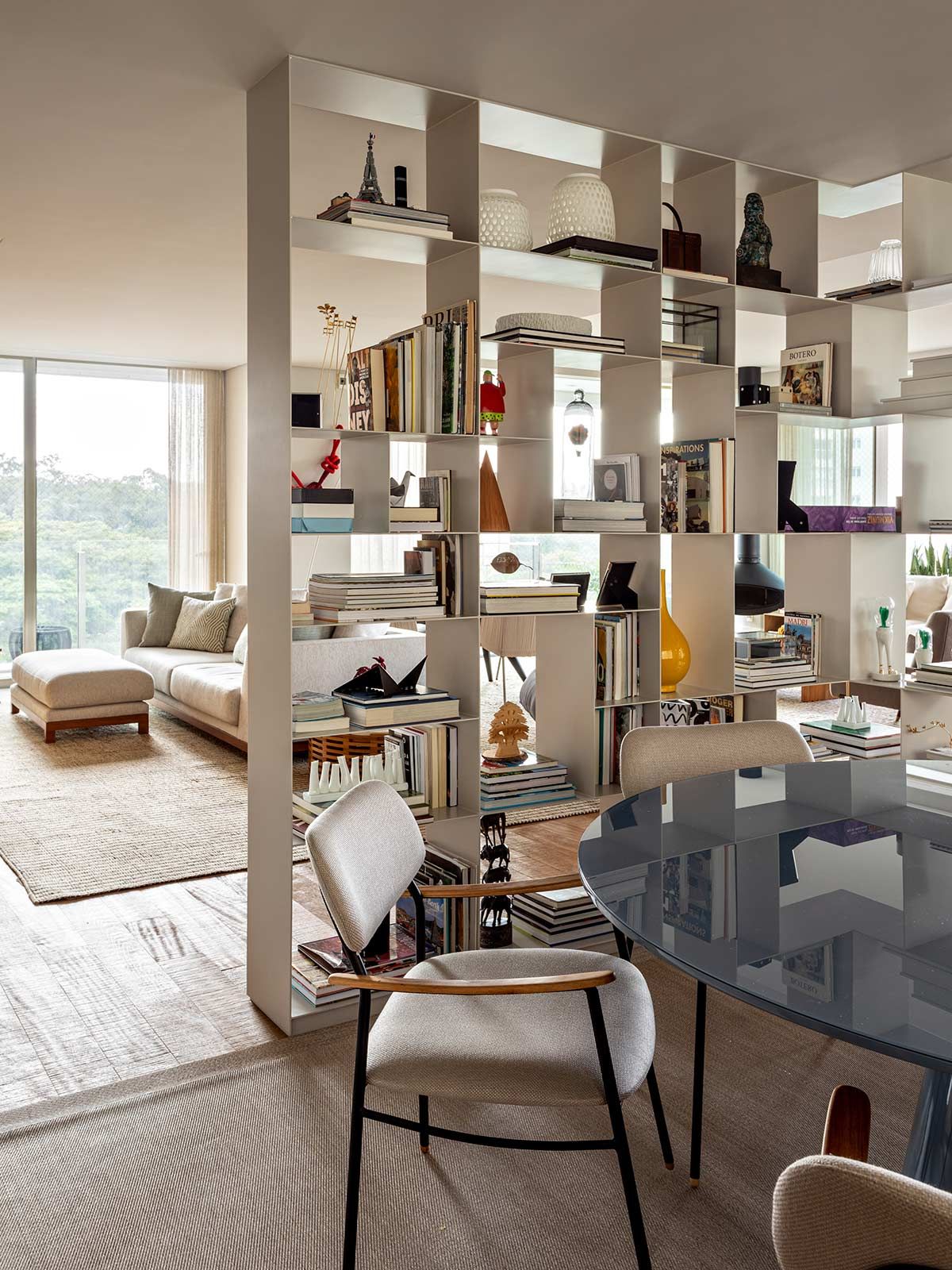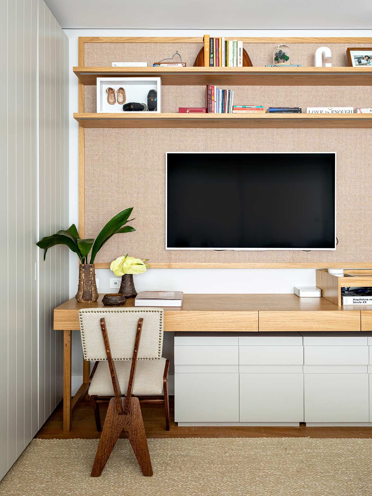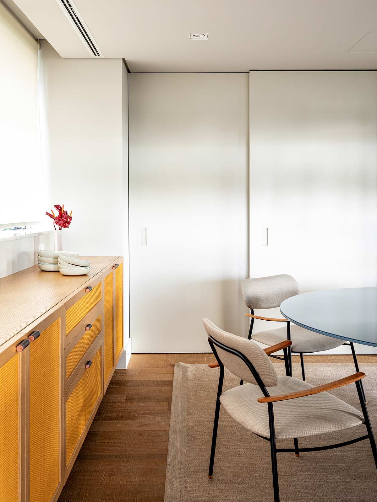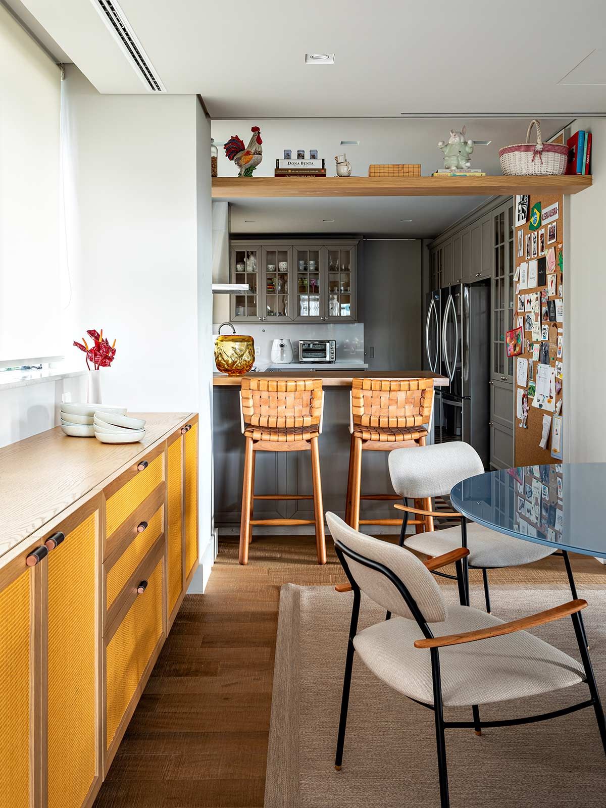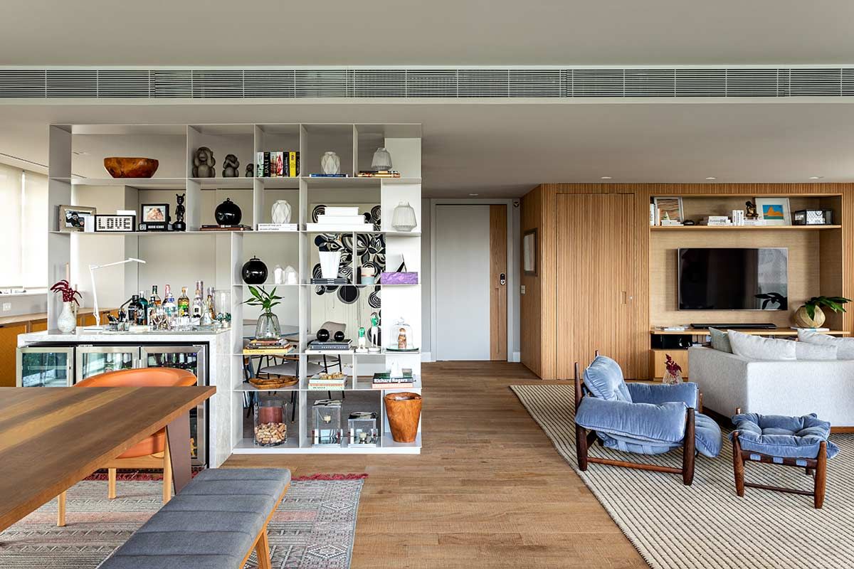 A área social ficou integrada e os móveis foram os responsáveis por setorizarem os ambientes. A estante do estar foi executada em estrutura metálica e depois laqueada, para ficar bem fina, e contribuir com o visual leve, potencializado também pelo uso de materiais naturais, como o piso de madeira. Na cozinha, a bancada recebeu tampo em Silestone e, em alguns momentos, os revestimentos de palha da Nani Chinellato e Elisa Atheniense aparecerem agregando aconchego à morada, principalmente na suite master.