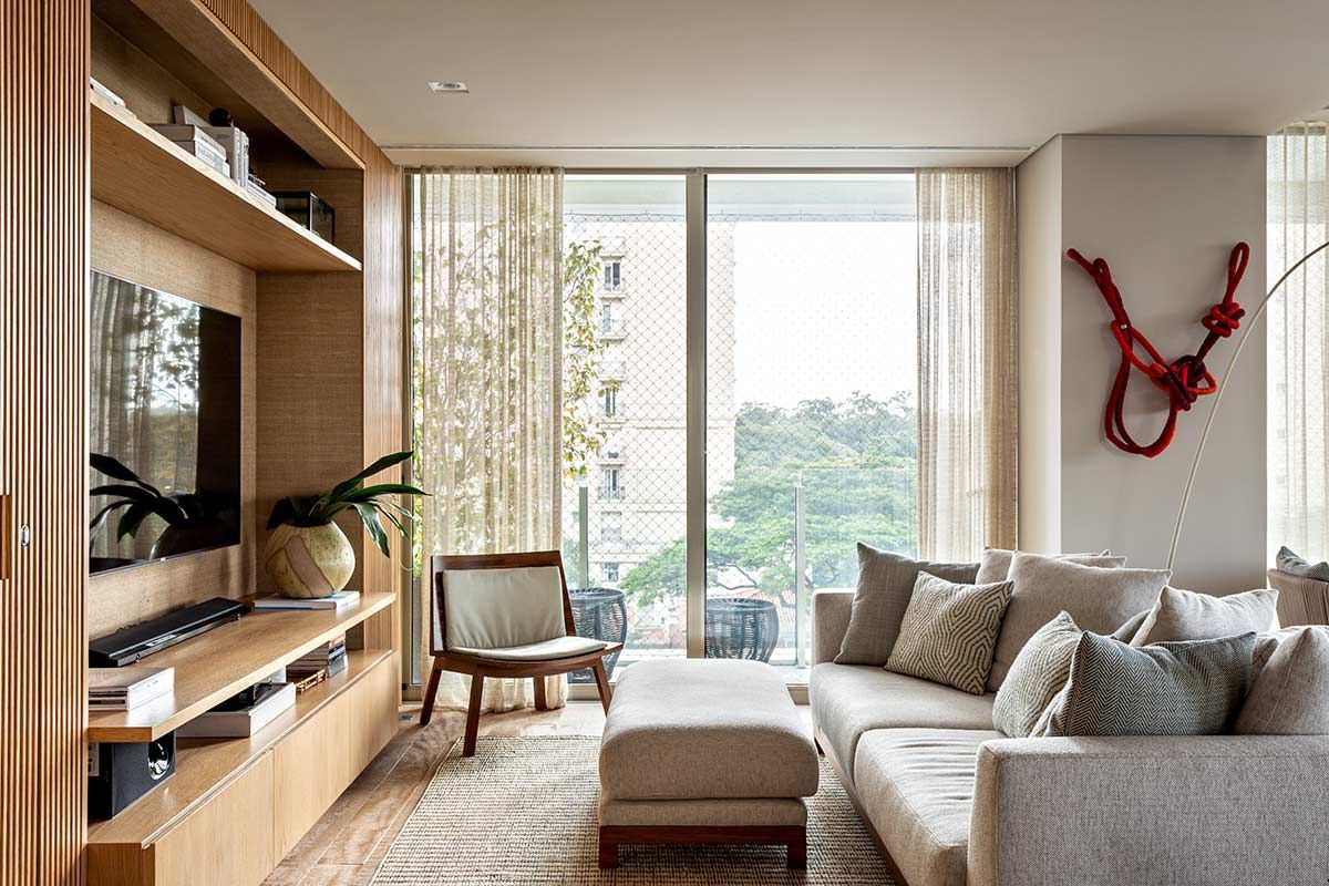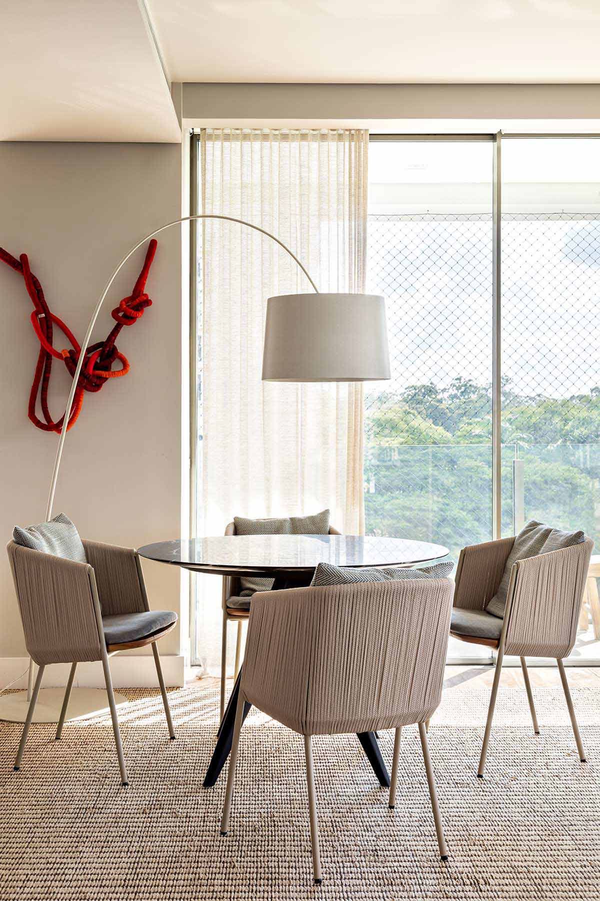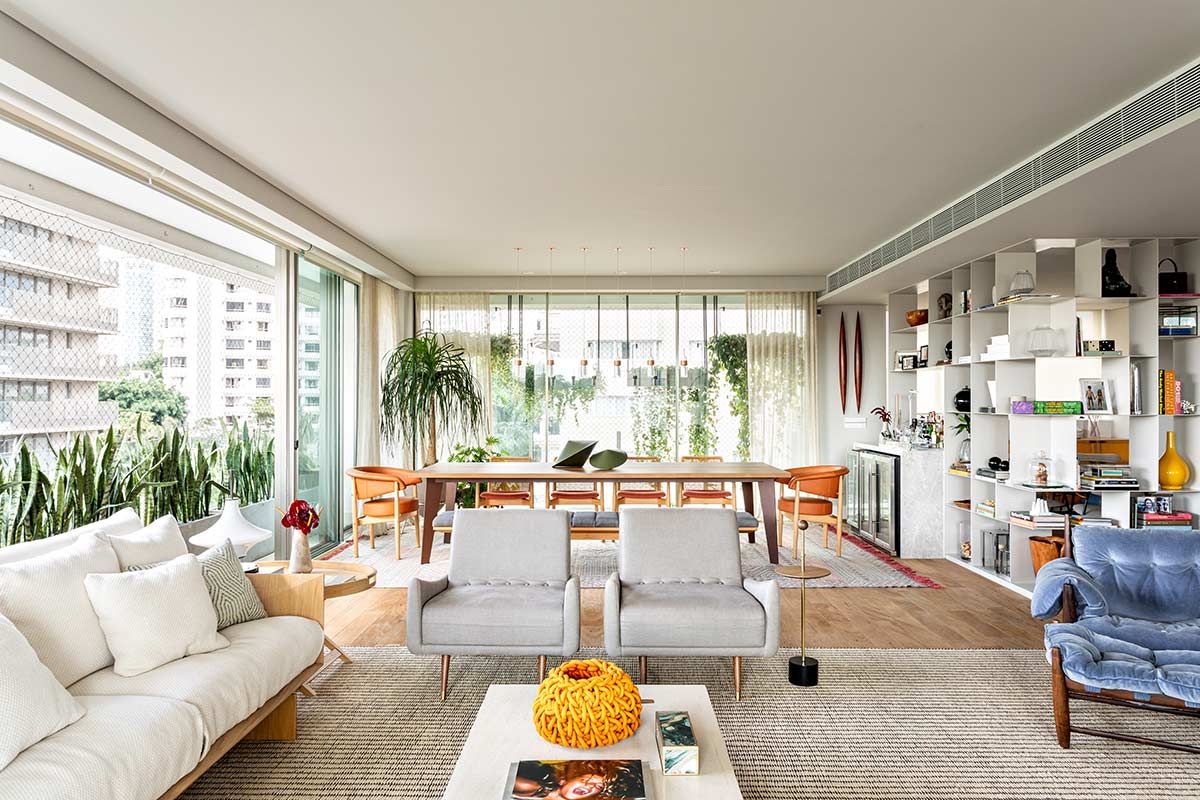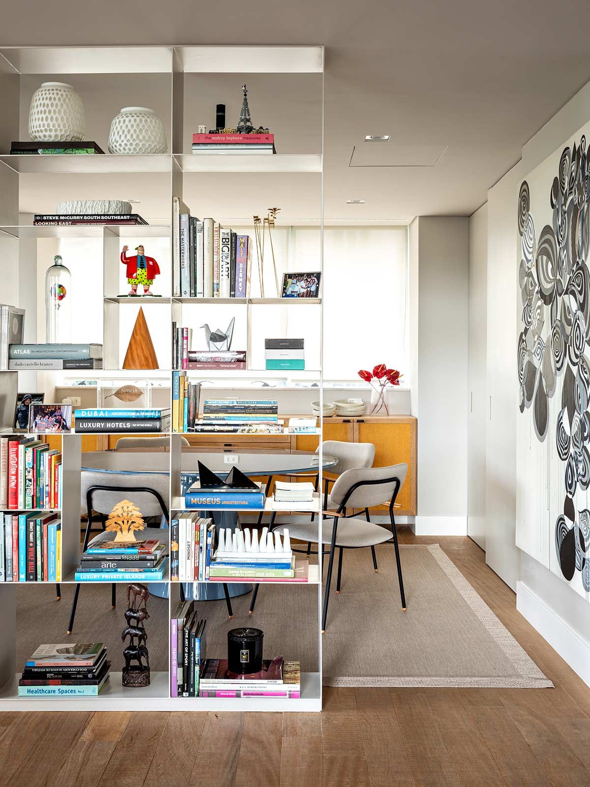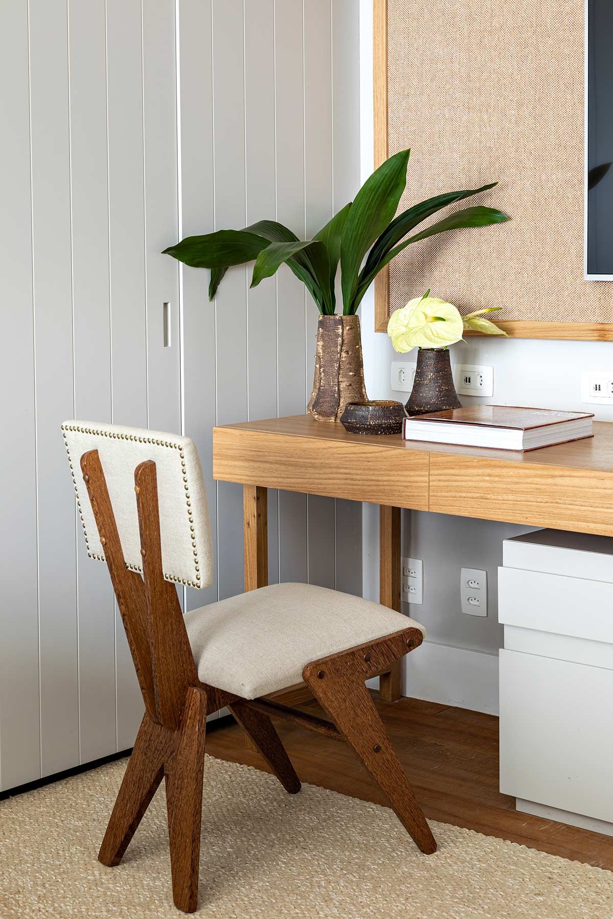 A área social ficou integrada e os móveis foram os responsáveis por setorizarem os ambientes. A estante do estar foi executada em estrutura metálica e depois laqueada, para ficar bem fina, e contribuir com o visual leve, potencializado também pelo uso de materiais naturais, como o piso de madeira. Na cozinha, a bancada recebeu tampo em Silestone e, em alguns momentos, os revestimentos de palha da Nani Chinellato e Elisa Atheniense aparecerem agregando aconchego à morada, principalmente na suite master.