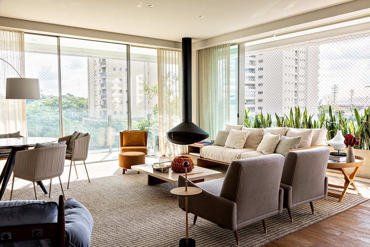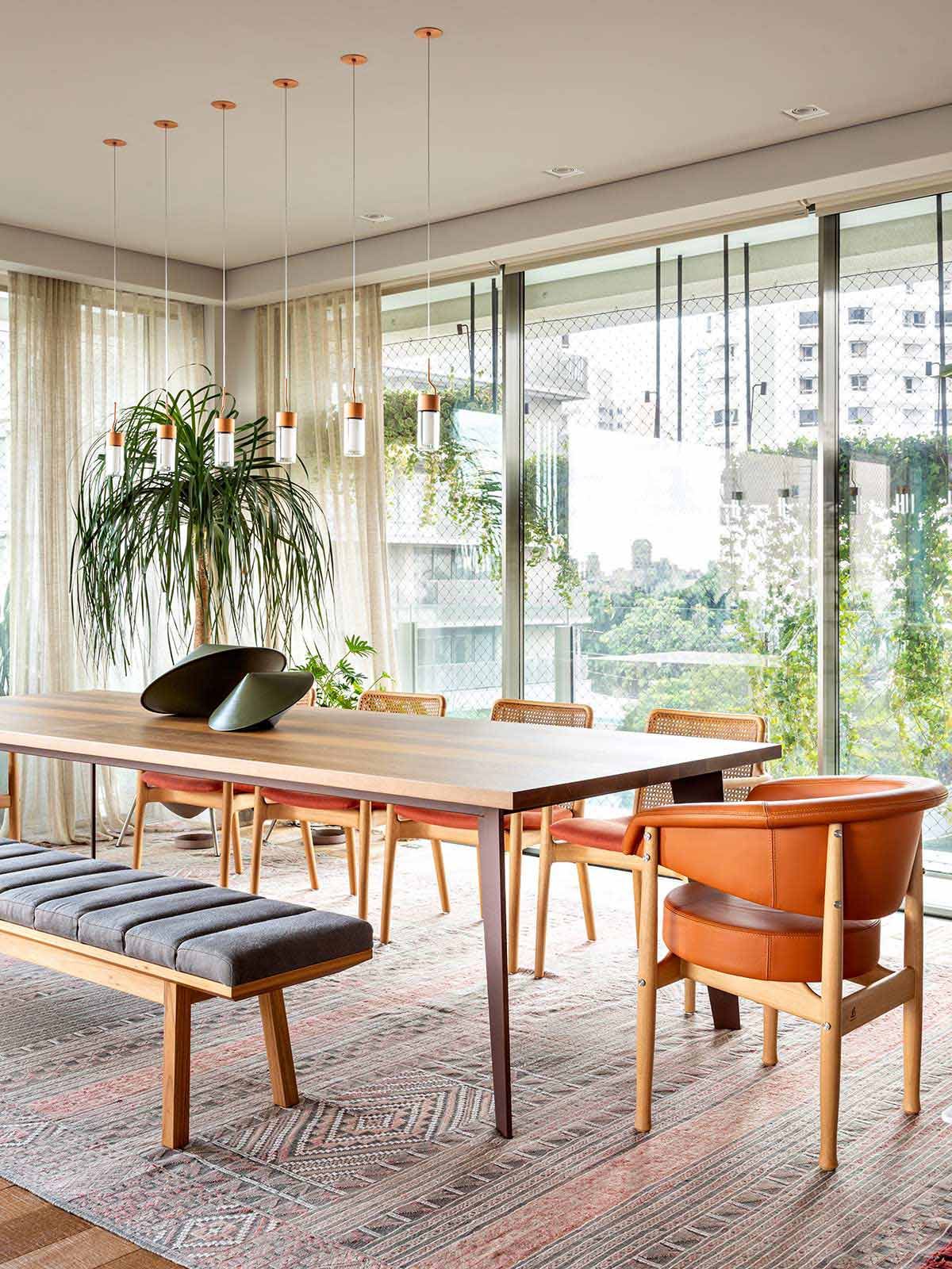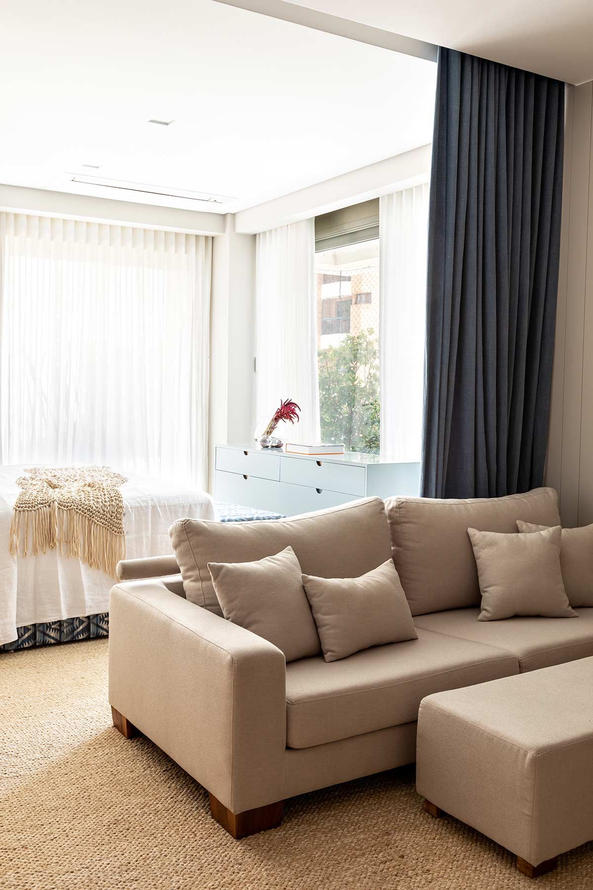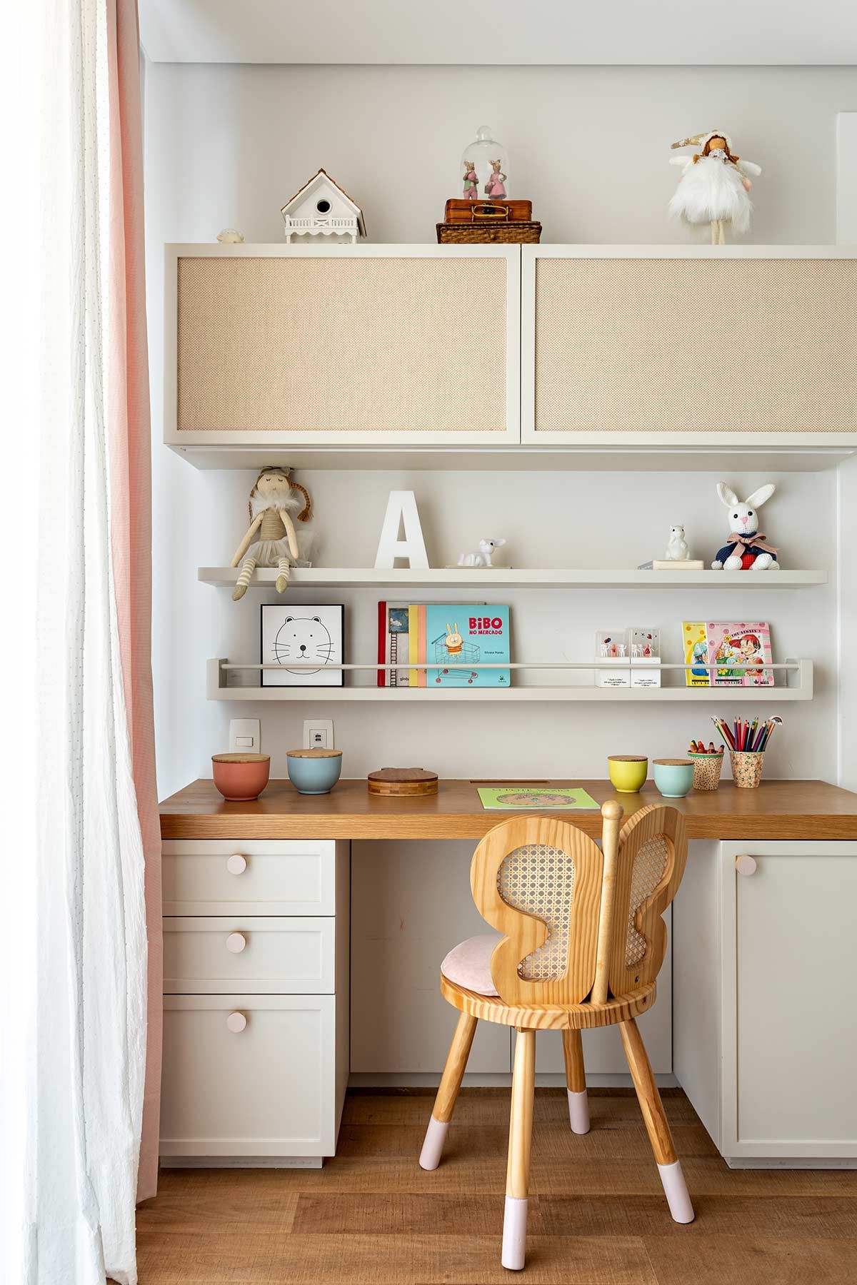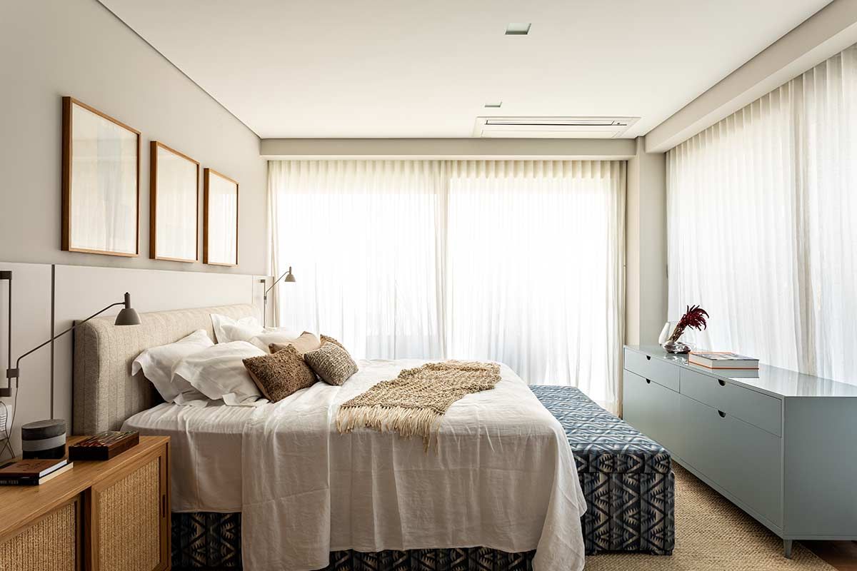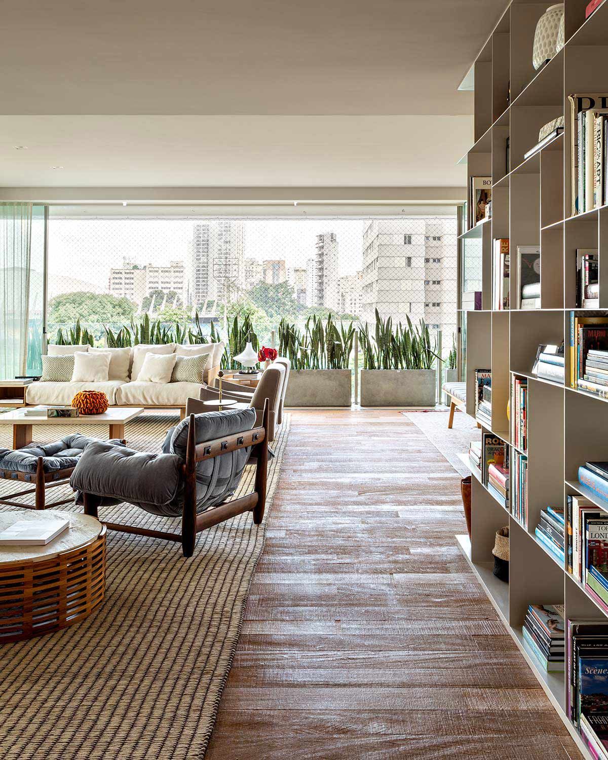 A área social ficou integrada e os móveis foram os responsáveis por setorizarem os ambientes. A estante do estar foi executada em estrutura metálica e depois laqueada, para ficar bem fina, e contribuir com o visual leve, potencializado também pelo uso de materiais naturais, como o piso de madeira. Na cozinha, a bancada recebeu tampo em Silestone e, em alguns momentos, os revestimentos de palha da Nani Chinellato e Elisa Atheniense aparecerem agregando aconchego à morada, principalmente na suite master.