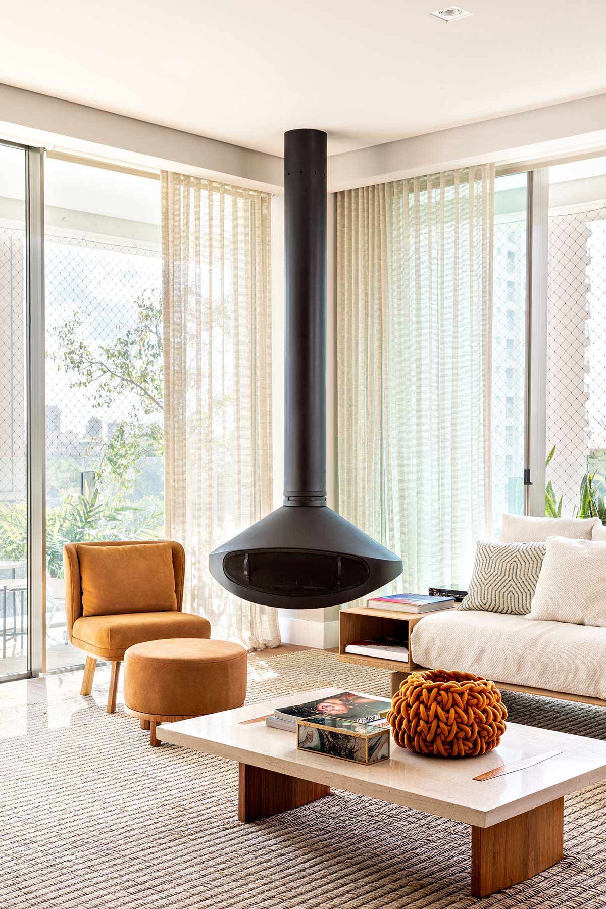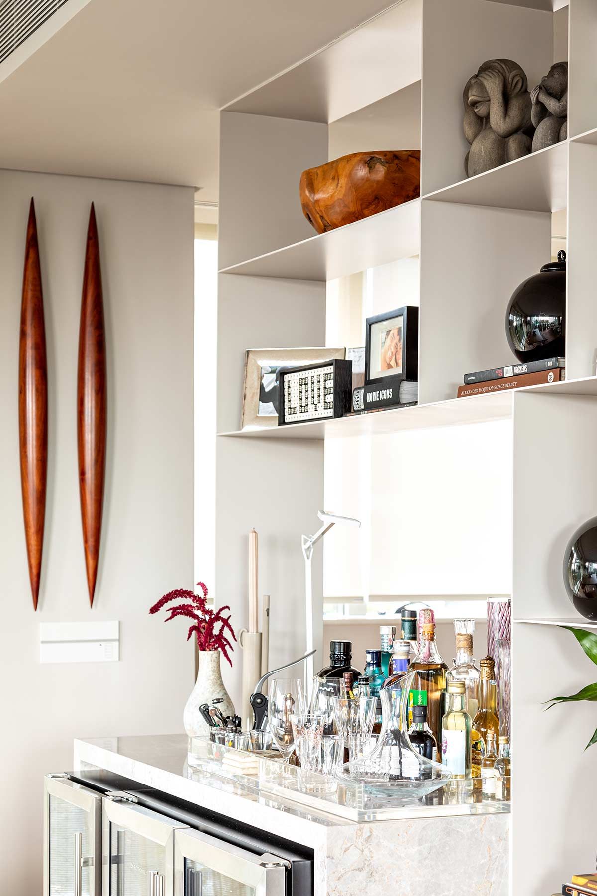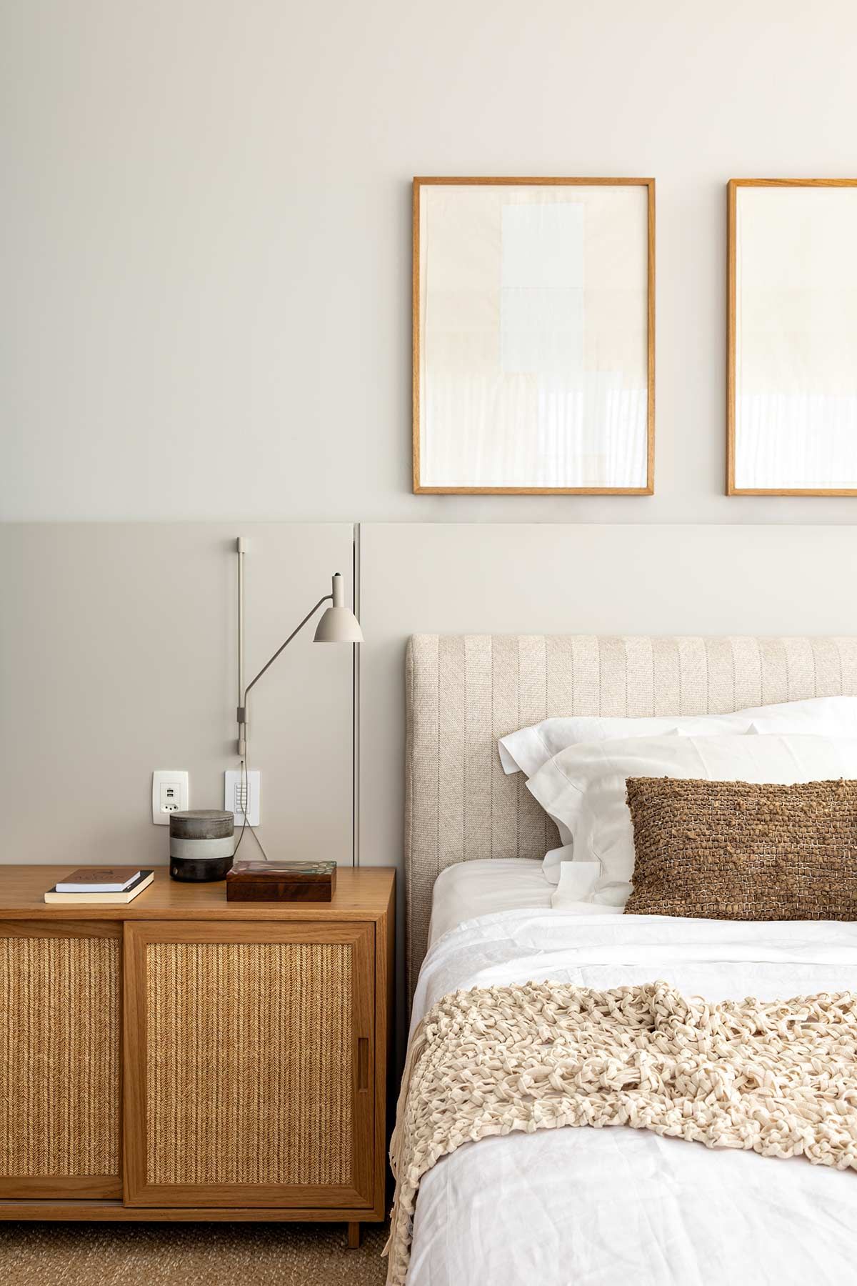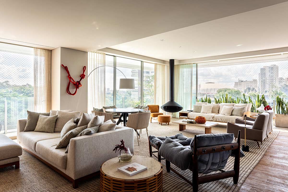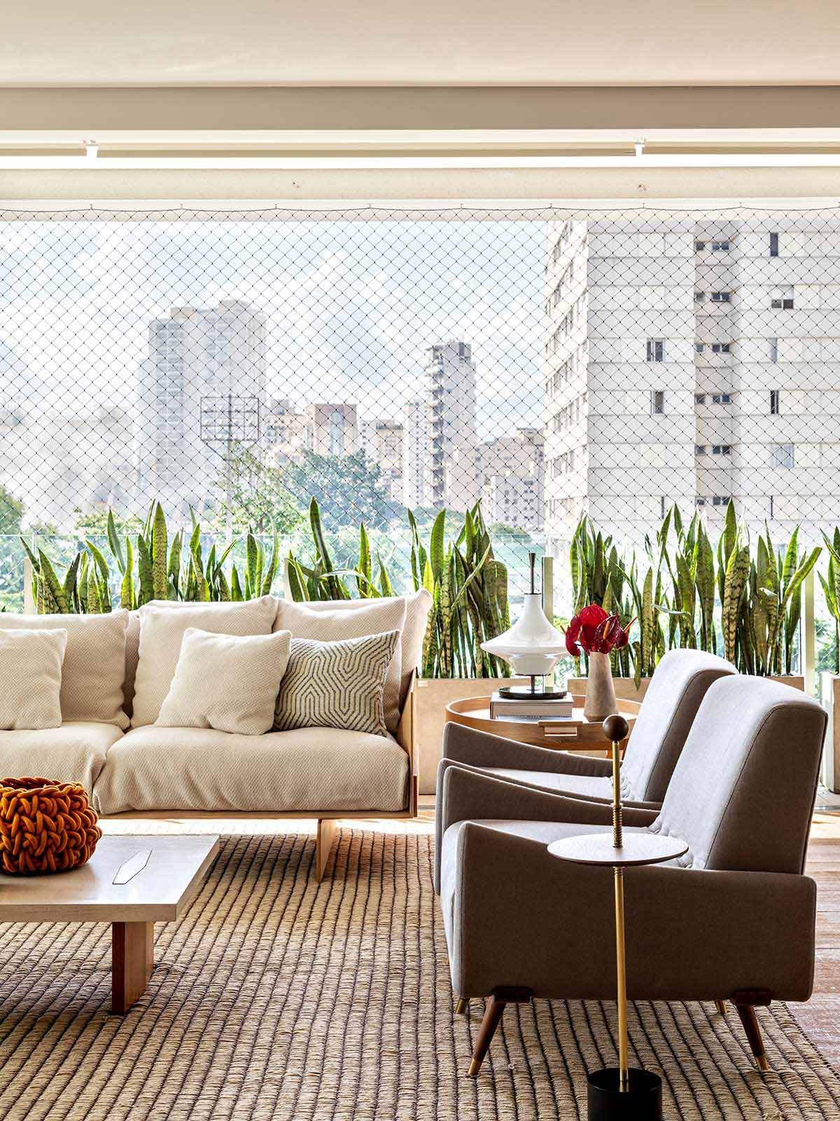 A área social ficou integrada e os móveis foram os responsáveis por setorizarem os ambientes. A estante do estar foi executada em estrutura metálica e depois laqueada, para ficar bem fina, e contribuir com o visual leve, potencializado também pelo uso de materiais naturais, como o piso de madeira. Na cozinha, a bancada recebeu tampo em Silestone e, em alguns momentos, os revestimentos de palha da Nani Chinellato e Elisa Atheniense aparecerem agregando aconchego à morada, principalmente na suite master.
