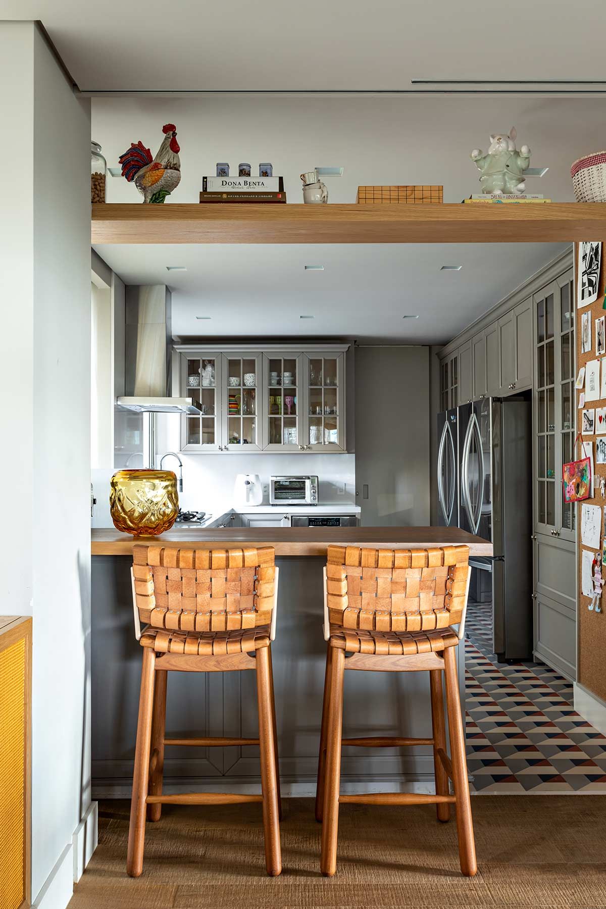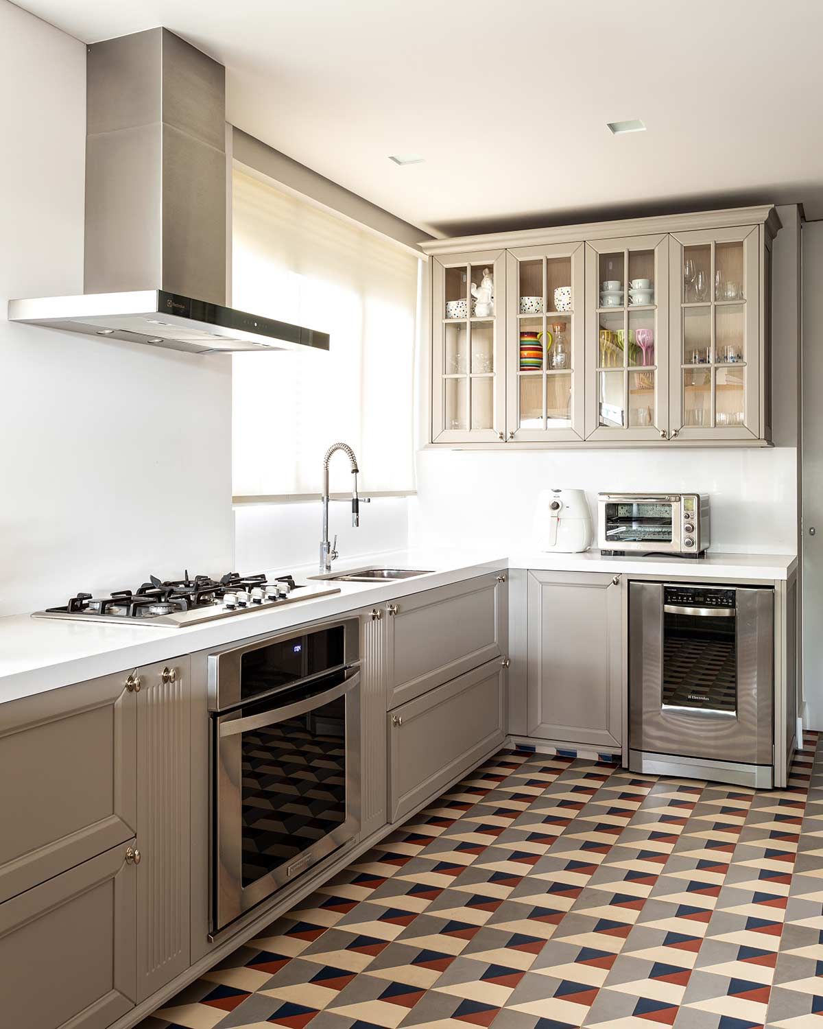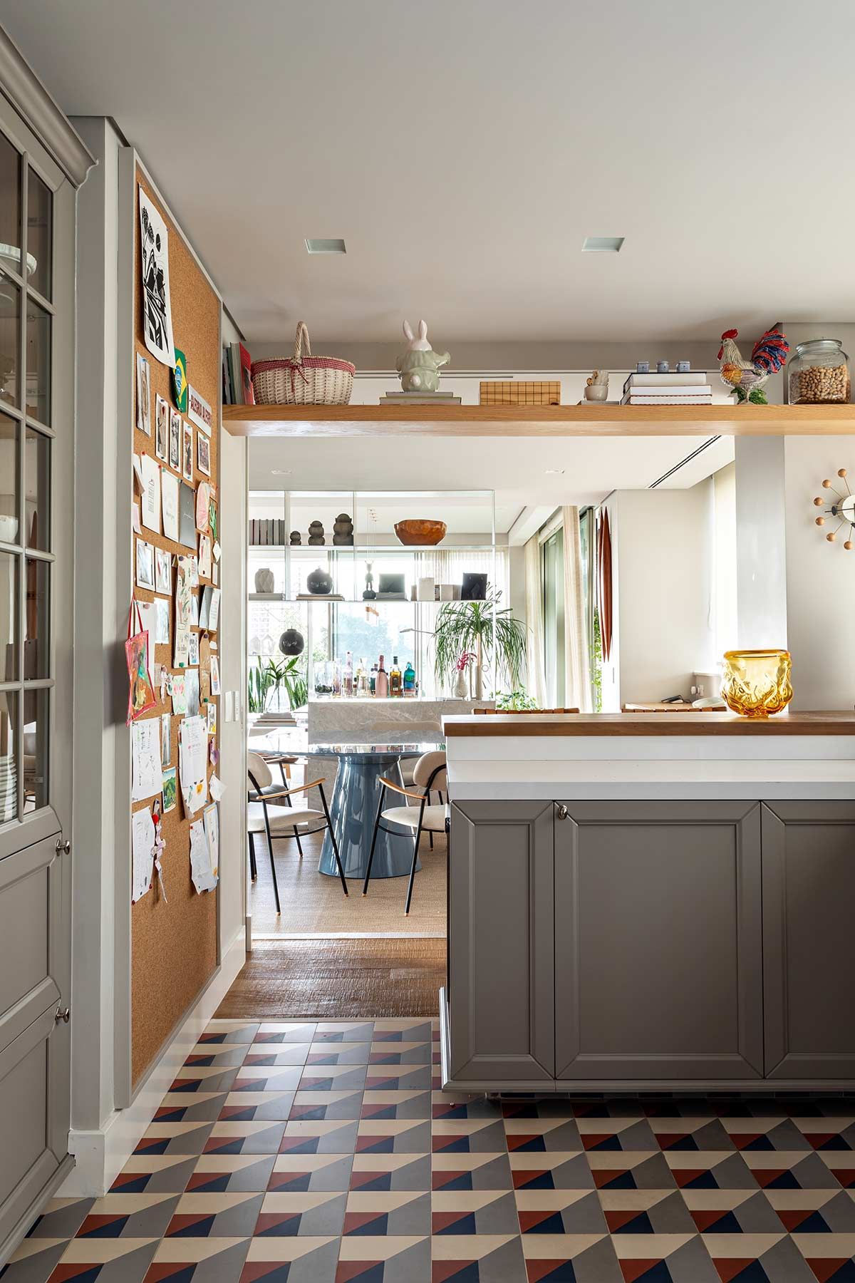 Foi necessário buscar revestimentos que fosse bonitos e de fácil manutenção ao mesmo tempo. Inicialmente, os moradores queriam usar ladrilho hidráulico na cozinha, mas não toparam a questão da porosidade, que o deixa patinado com o tempo e, para ter efeito similar, a arquiteta optou por fazer a cerâmica sob medida, desenvolvendo a peça toda.