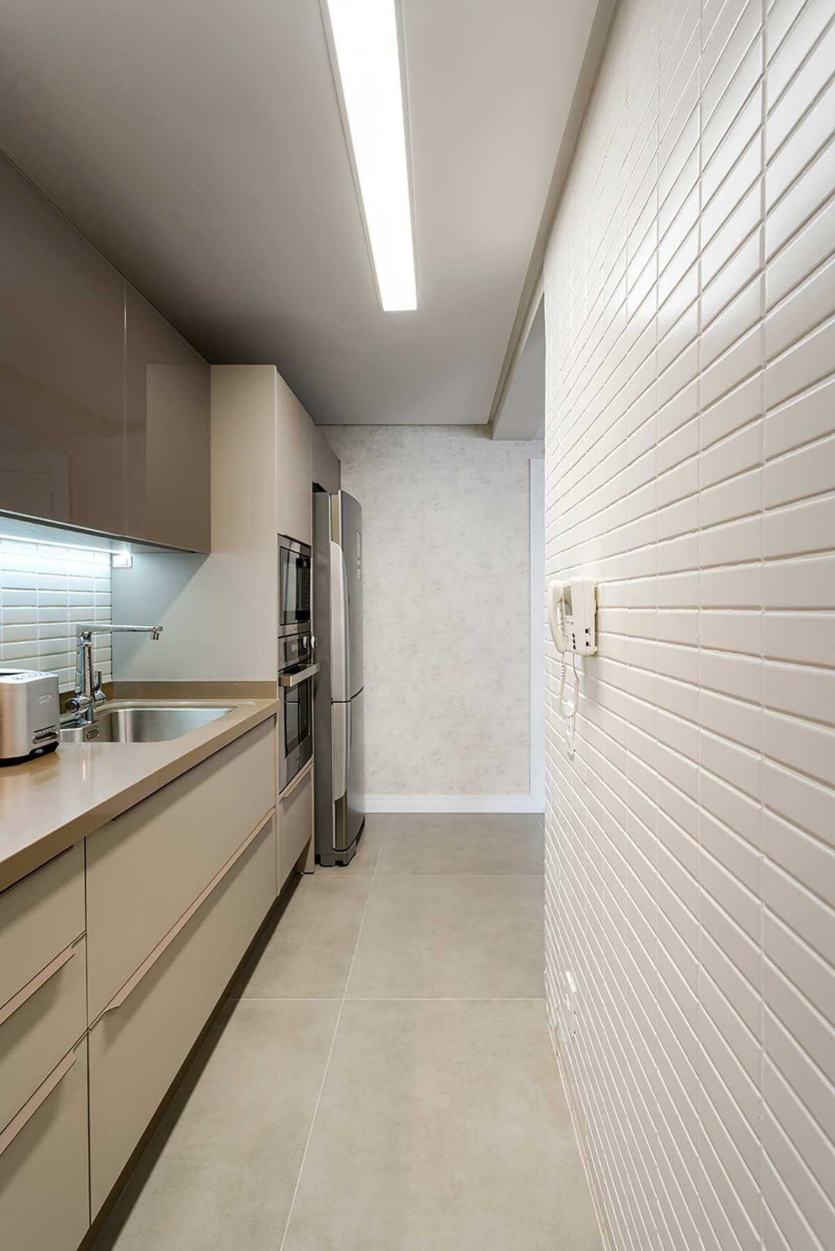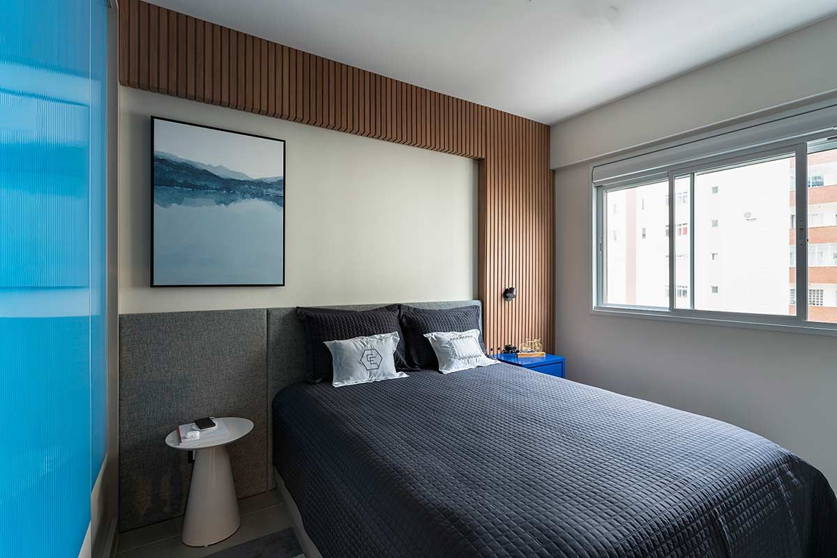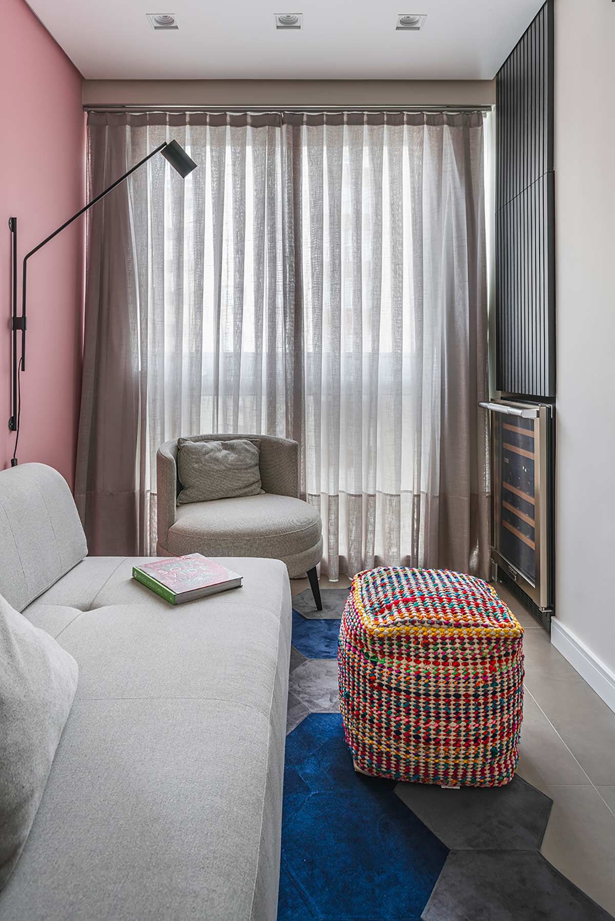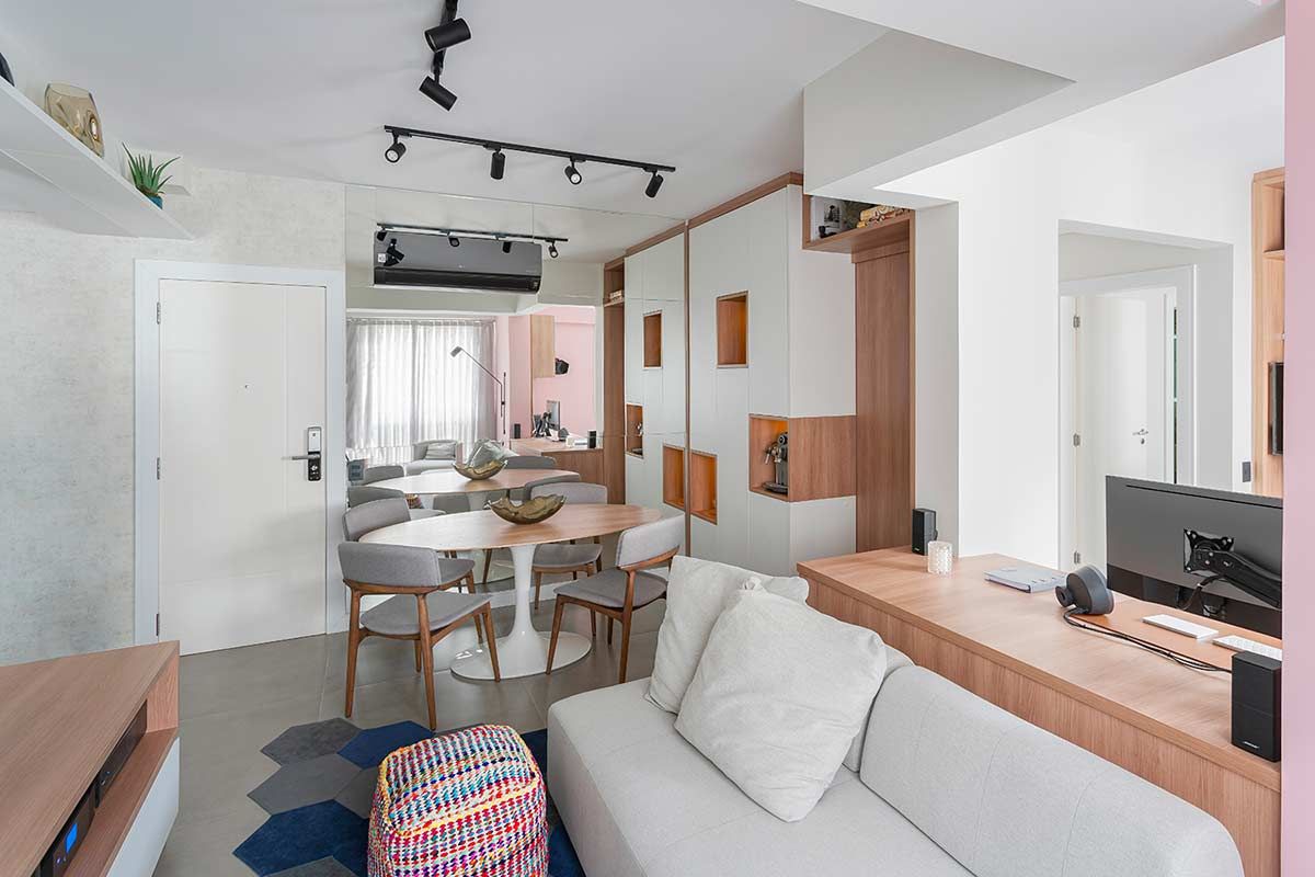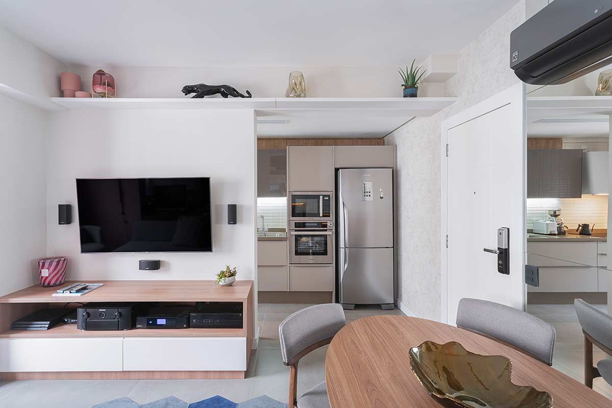 Após a retirada da porta que ligava a sala e a varanda, a antiga churrasqueira deu lugar à uma cristaleira e adega. Seguindo a ideia de peças multiuso, o sofá foi feito sob medida para assistir TV e servir como cama de hóspedes, assumindo várias configurações com seu encosto removível e design livre de braços. A marcenaria planejada foi essencial para otimizar e aproveitar cada cantinho dos cômodos, e o uso do mesmo piso em todos eles, trouxe a sensação de amplitude que o morador desejava.