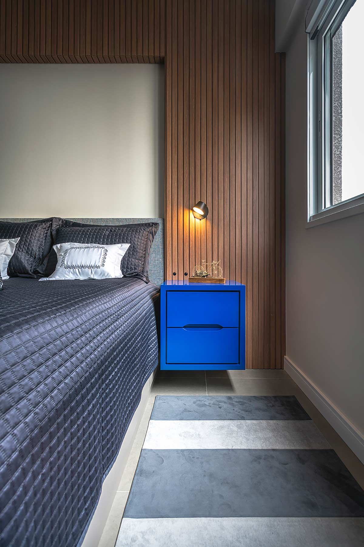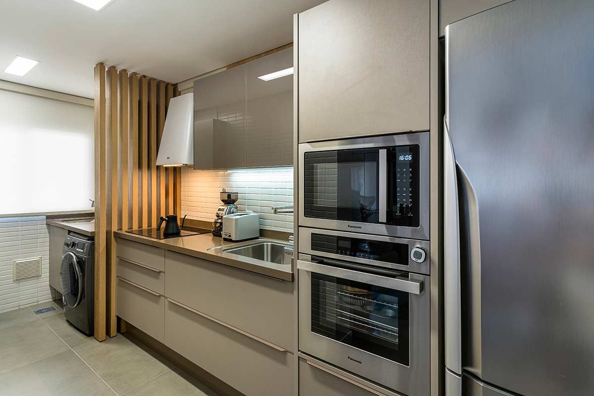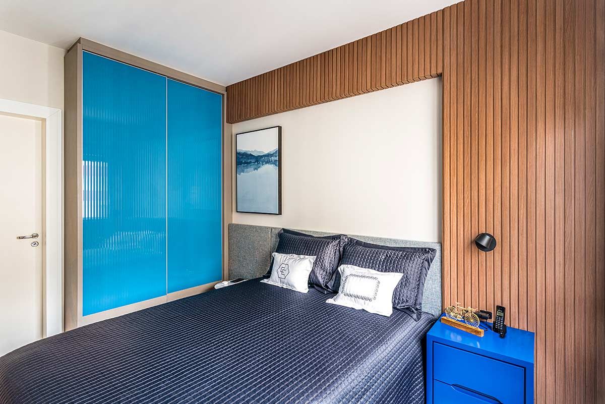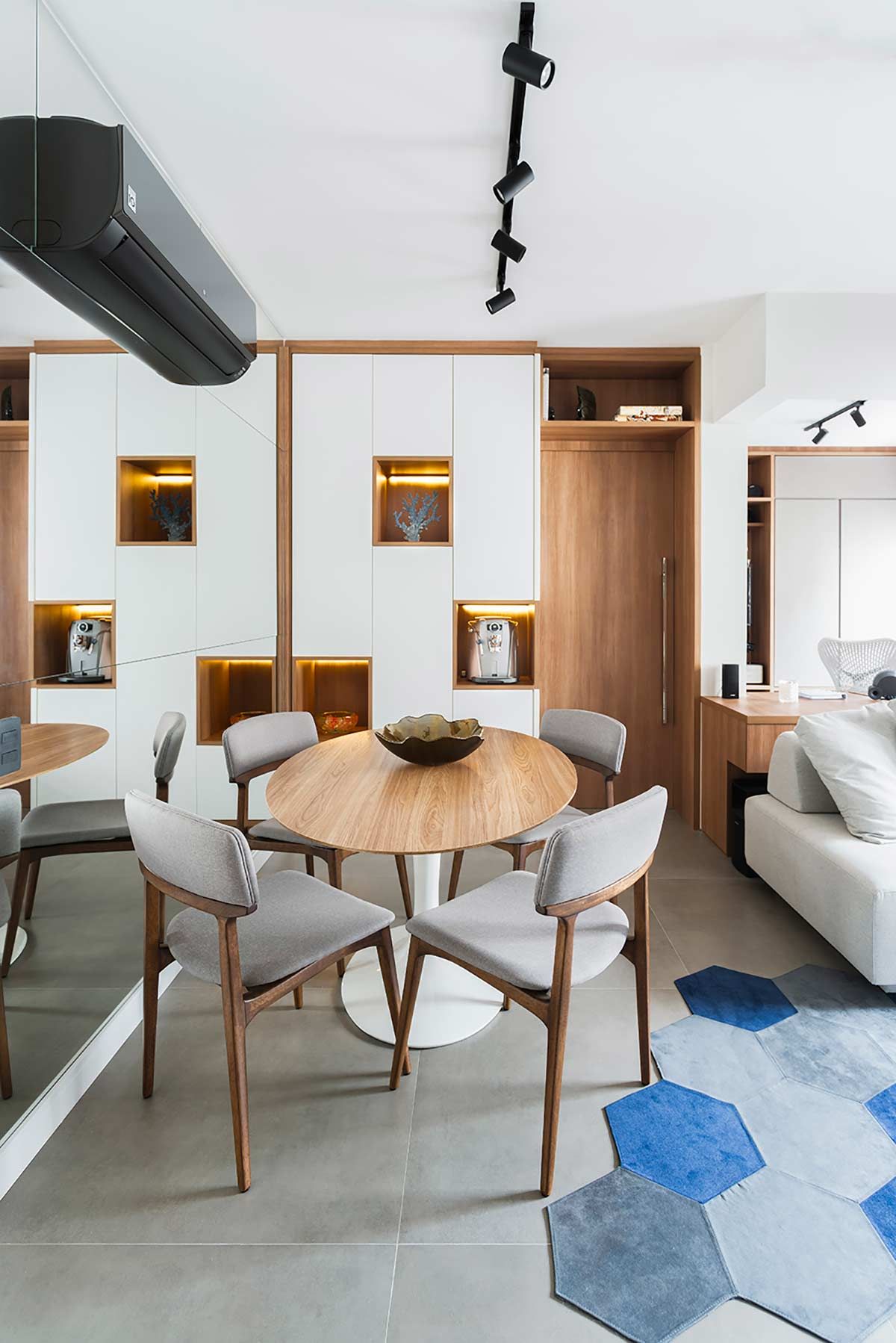 Após a retirada da porta que ligava a sala e a varanda, a antiga churrasqueira deu lugar à uma cristaleira e adega. Seguindo a ideia de peças multiuso, o sofá foi feito sob medida para assistir TV e servir como cama de hóspedes, assumindo várias configurações com seu encosto removível e design livre de braços. A marcenaria planejada foi essencial para otimizar e aproveitar cada cantinho dos cômodos, e o uso do mesmo piso em todos eles, trouxe a sensação de amplitude que o morador desejava.