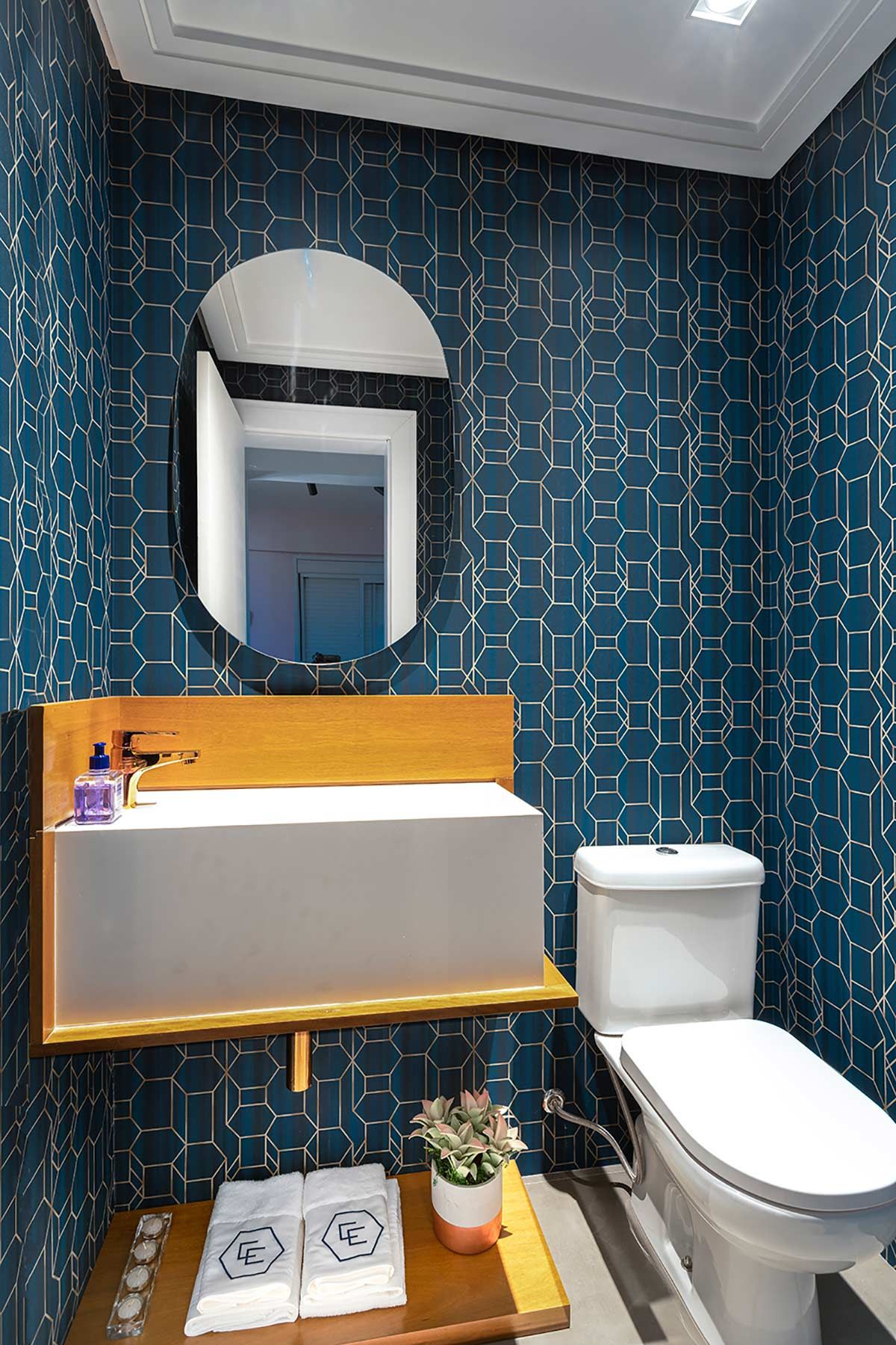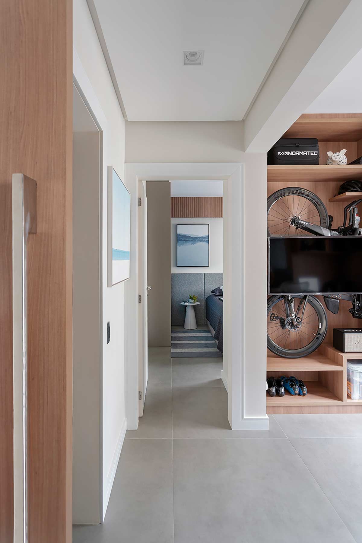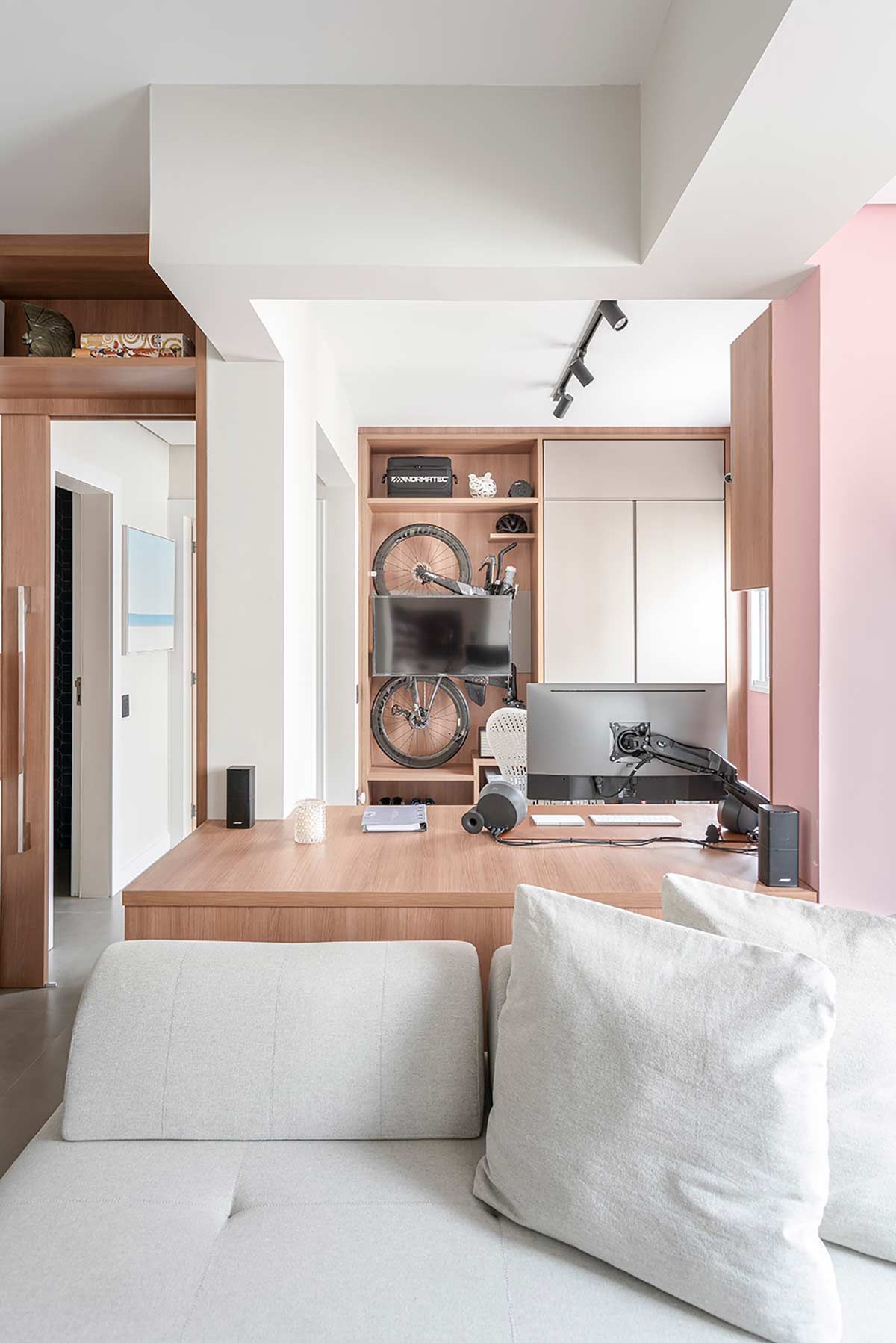 Um triatleta contou com a ajuda do arquiteto Rico Mendonça para transformar seu apartamento em um espaço amplo, para que pudesse trabalhar e treinar em casa. A solução para readequar o layout foi começar pela demolição da parede entre a sala e um dos quartos, para colocar uma bancada; em seguida, removeu-se a porta balcão entre estar e varanda; a parede do corredor também saiu; e o box do banheiro social, virou rouparia e a outra parte dele, um lavabo.