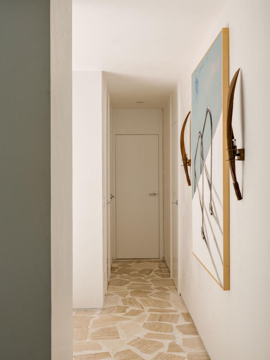 A paleta de materiais, um dos pontos altos da decoração brasileira proposta por Luana, combina travertino em cacos resinados no estilo palazzo na ala social, madeira larga na área íntima e cimento queimado branco-bege nas superfícies. O grande tapete de ráfia, sisal e algodão aquece o living e conversa com o sofá modular em linho, enquanto obras de artistas como Heloisa Hariadne e Maria Gabriela ampliam o espírito tropical e autoral do projeto.