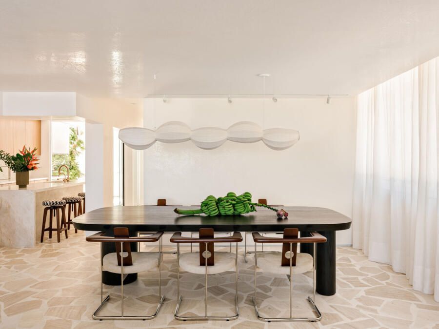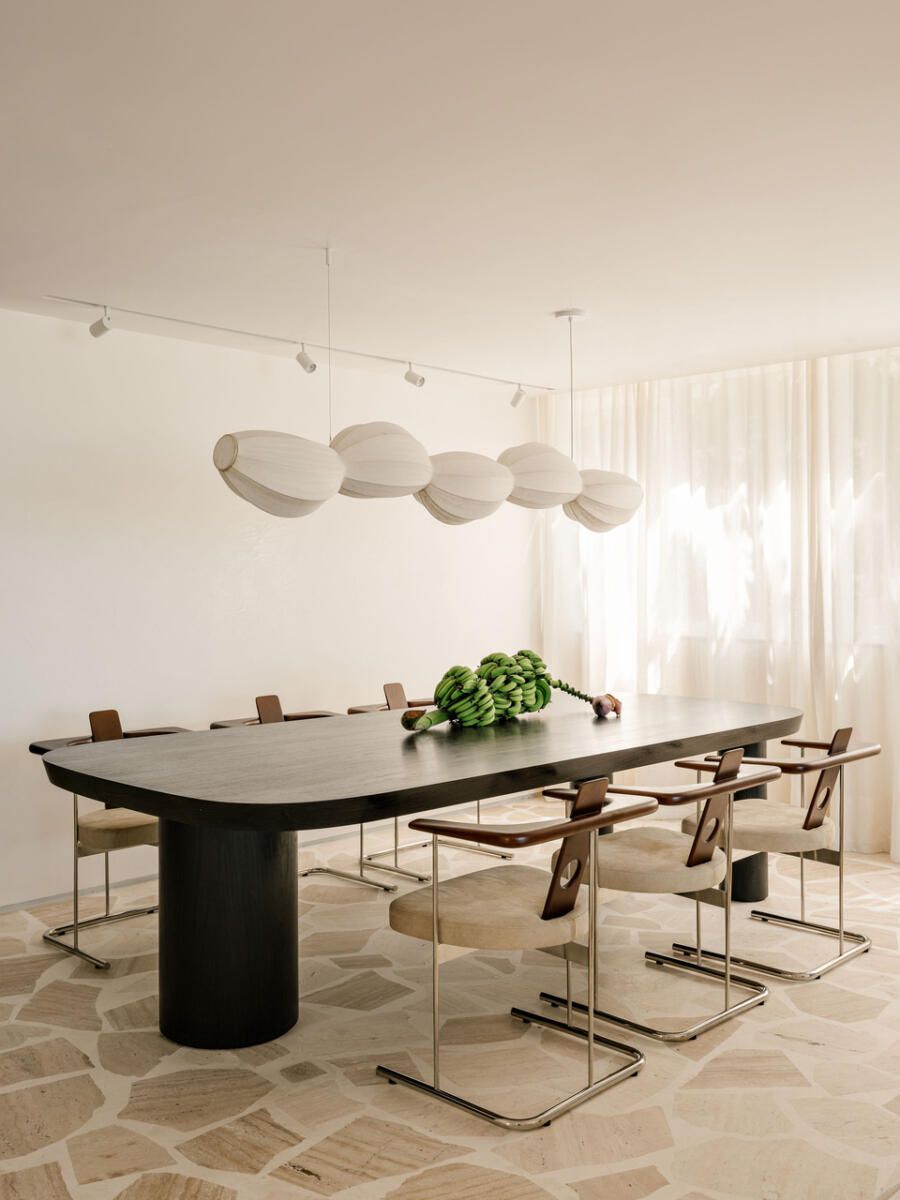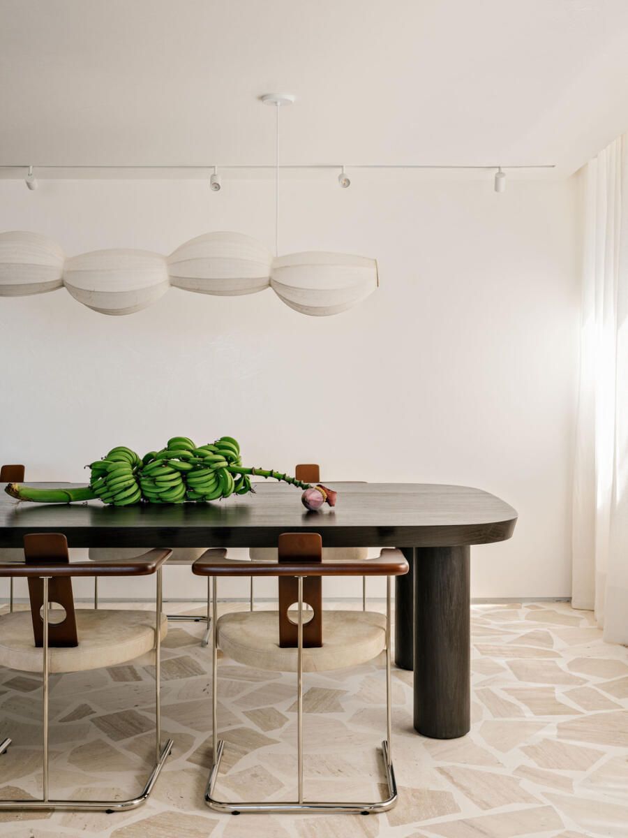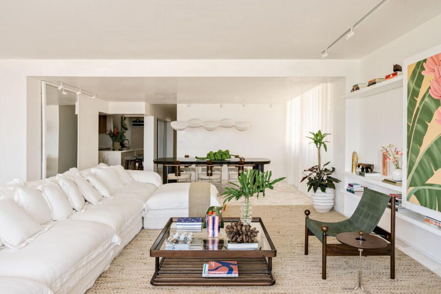 A paleta de materiais, um dos pontos altos da decoração brasileira proposta por Luana, combina travertino em cacos resinados no estilo palazzo na ala social, madeira larga na área íntima e cimento queimado branco-bege nas superfícies. O grande tapete de ráfia, sisal e algodão aquece o living e conversa com o sofá modular em linho, enquanto obras de artistas como Heloisa Hariadne e Maria Gabriela ampliam o espírito tropical e autoral do projeto.