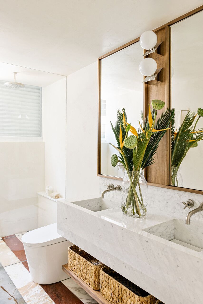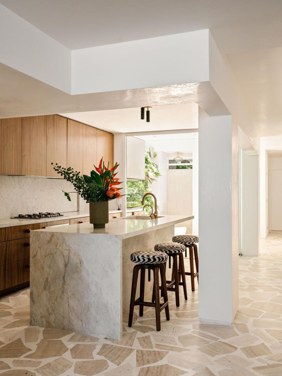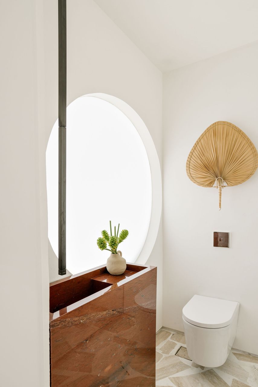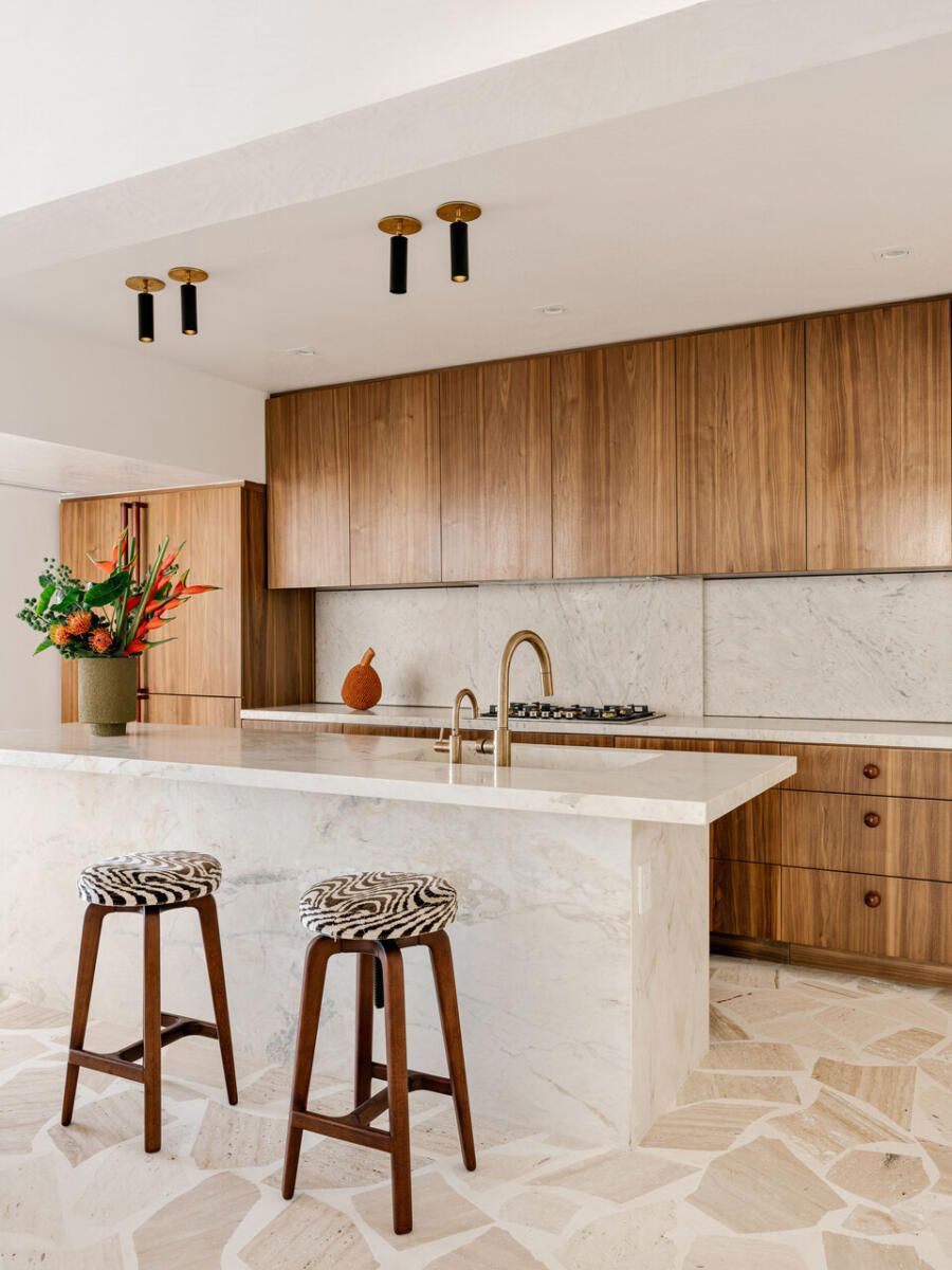 A paleta de materiais, um dos pontos altos da decoração brasileira proposta por Luana, combina travertino em cacos resinados no estilo palazzo na ala social, madeira larga na área íntima e cimento queimado branco-bege nas superfícies. O grande tapete de ráfia, sisal e algodão aquece o living e conversa com o sofá modular em linho, enquanto obras de artistas como Heloisa Hariadne e Maria Gabriela ampliam o espírito tropical e autoral do projeto.