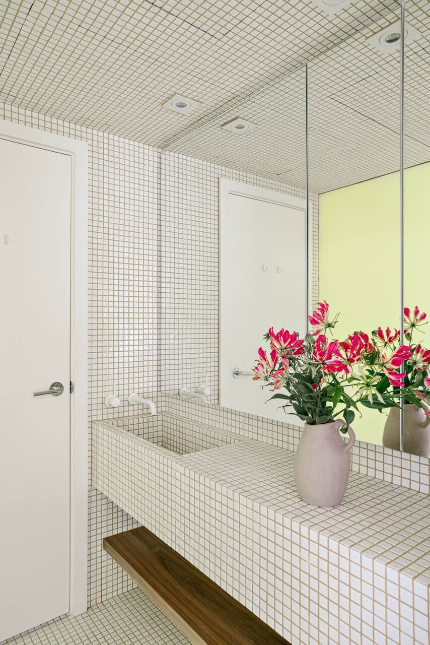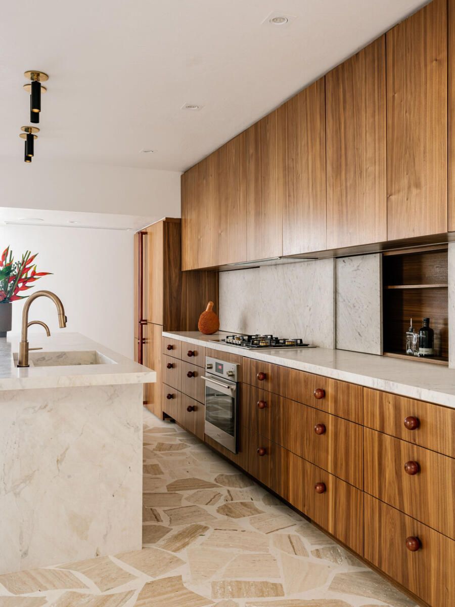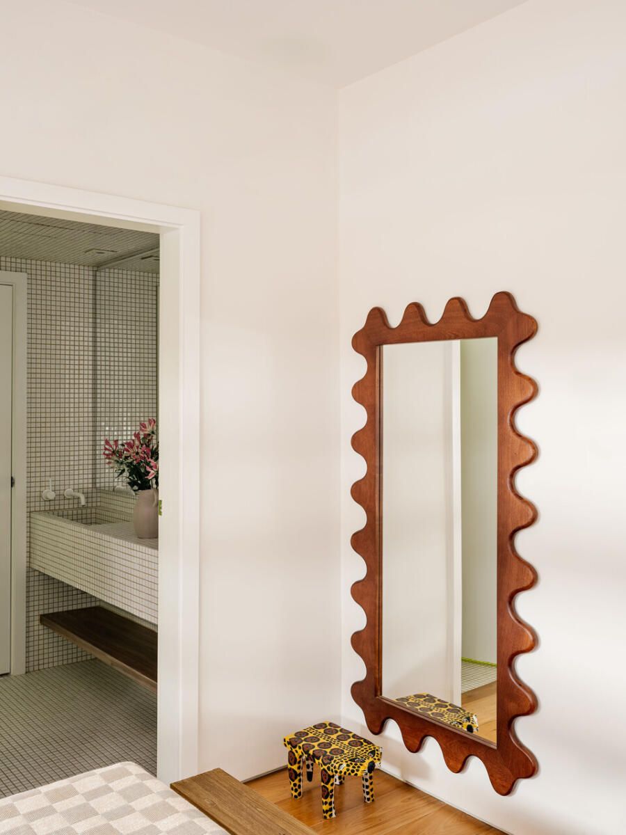Para além dos acabamentos, são os detalhes que dão todo o conforto: o painel deslizante da estante que oculta a TV, o banco-aparador talhado de um único tronco, os armários da cozinha que escondem condimentos atrás de portas em mármore Branco Paraná com puxadores inspirados em Sergio Rodrigues e Lina Bo Bardi. Nas suítes, o cuidado permanece, do piso do banheiro com listras de pedras brasileiras ao espelho-armário, passando pela tapeçaria que disfarça a TV.