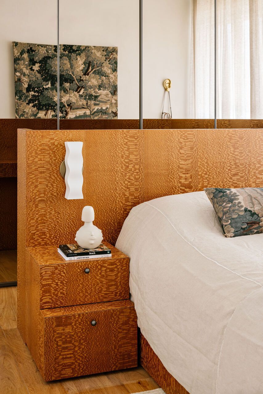 A curadoria de mobiliário segue o mesmo rigor. Peças assinadas e itens feitos sob medida convivem com achados vintage, como as poltronas de fibrocimento Loop, de Willy Guhl. Entre as criações da própria arquiteta, destaca-se a cama da suíte master, revestida de lâmina natural de rádica brasileira, cuja padronagem remete à pele da onça-pintada. Nas áreas sociais, nomes como Sergio Rodrigues, Jorge Zalszupin, Luia Mantelli e Gustavo Bittencourt reforçam a presença do design nacional.