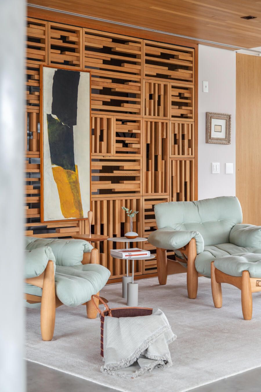 “O mobiliário minimalista e de baixa altura revelam a vista 180 graus, e as colunas de concreto atravessam o living trazendo um ar bem contemporâneo! A escolha desses móveis leves, com design marcante, não compete com a beleza das estruturas, que por sua vez também têm seu lugar na composição. Além disso, criamos um espaço de leitura com duas poltronas super confortáveis e utilizamos um tecido verde bem clarinho combinando com o restante do apartamento.”