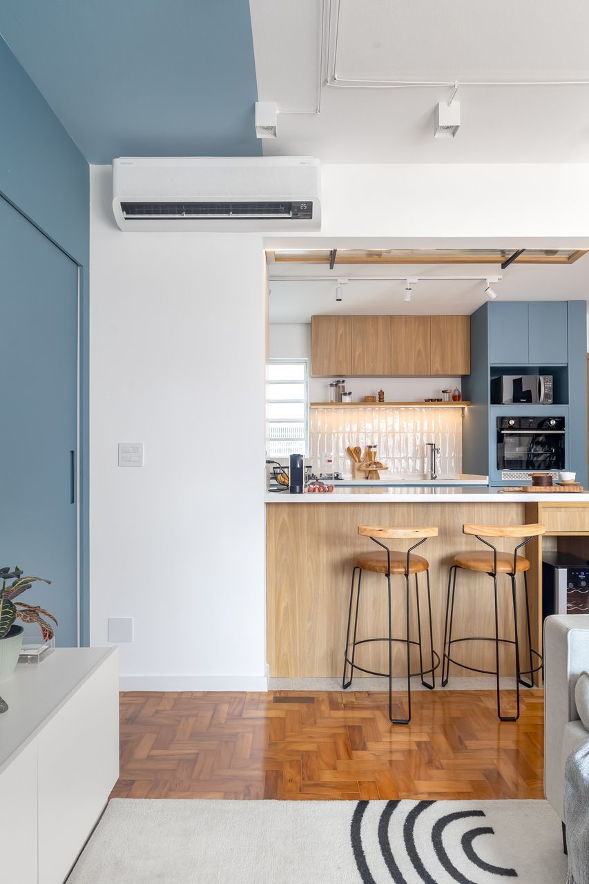 Na cozinha, o isolamento deu lugar à convivência. Integrada de maneira fluida à área social, ela agora é ponto de encontro e troca, sem perder a funcionalidade. Já o quarto traduz um convite à desaceleração, envolto por texturas suaves e iluminação pontual que favorece o repouso. É o tipo de projeto de apartamento que traduz um modo contemporâneo de morar, onde função e emoção caminham lado a lado.