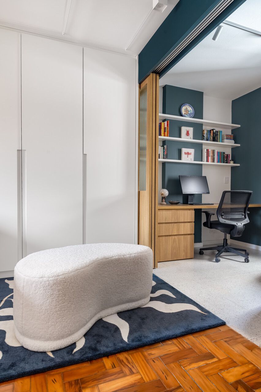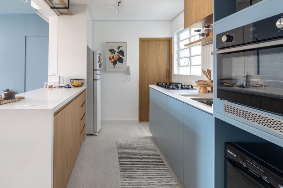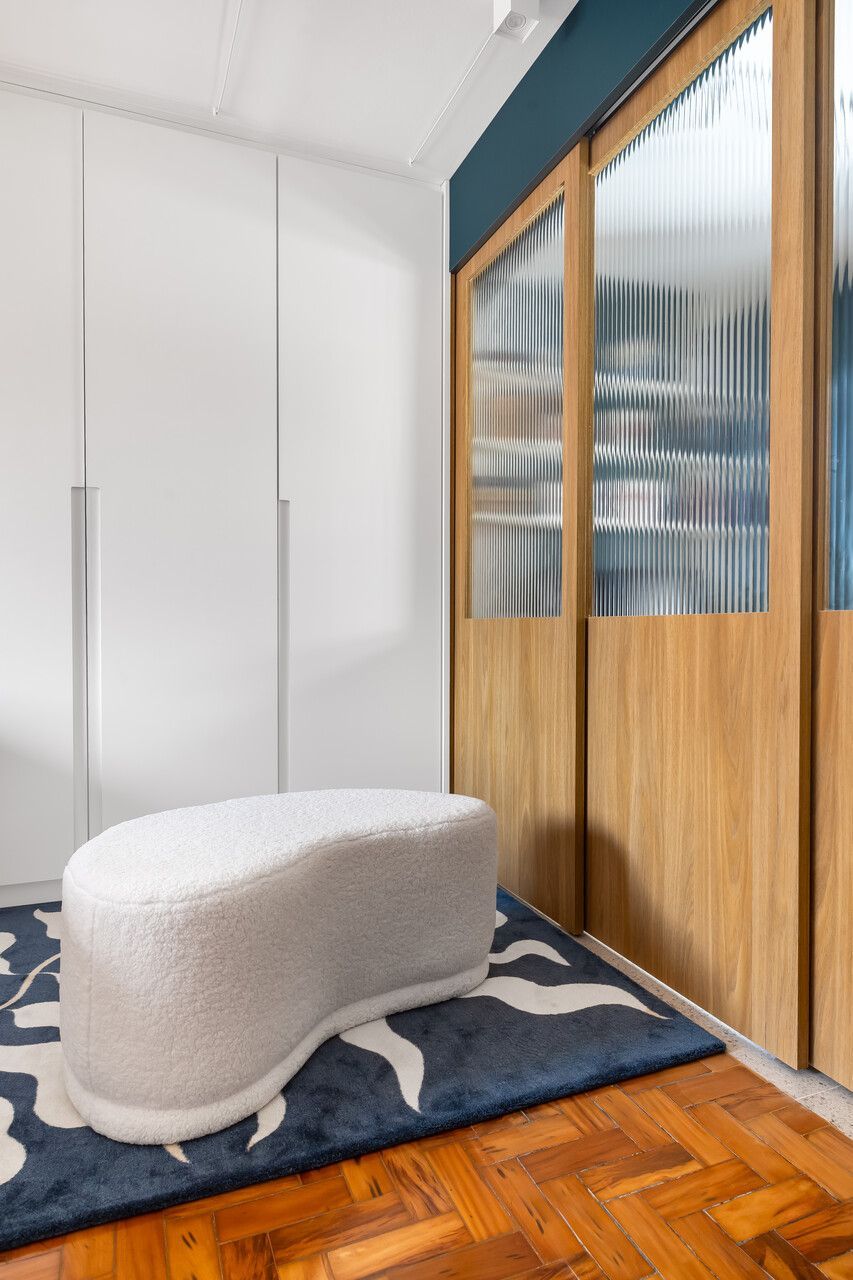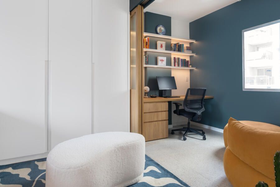 Na cozinha, o isolamento deu lugar à convivência. Integrada de maneira fluida à área social, ela agora é ponto de encontro e troca, sem perder a funcionalidade. Já o quarto traduz um convite à desaceleração, envolto por texturas suaves e iluminação pontual que favorece o repouso. É o tipo de projeto de apartamento que traduz um modo contemporâneo de morar, onde função e emoção caminham lado a lado.
