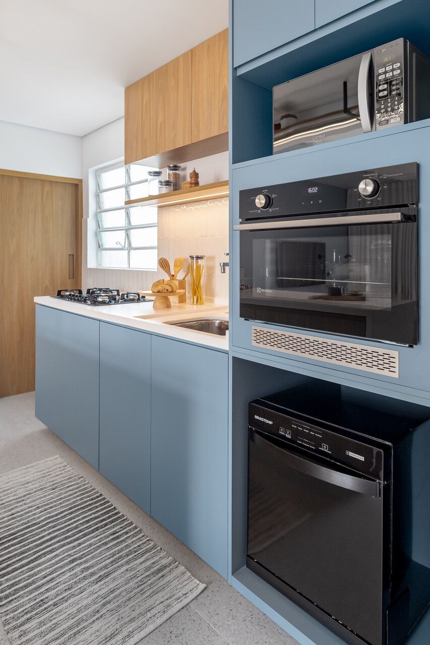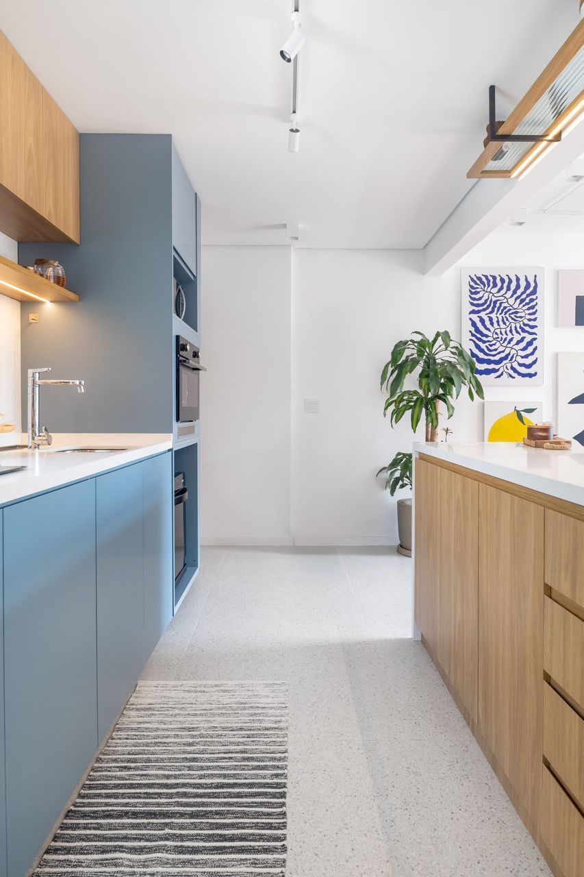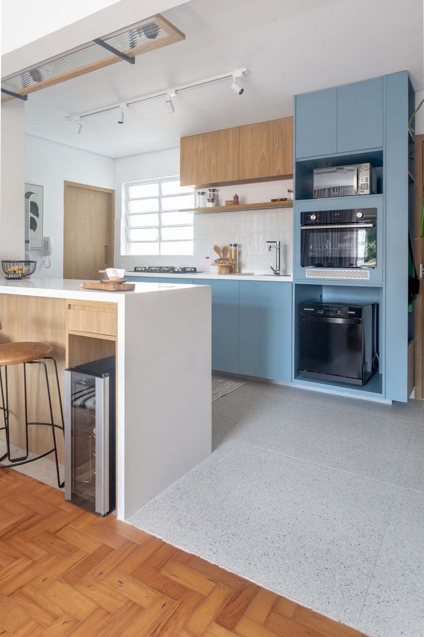Na cozinha, o isolamento deu lugar à convivência. Integrada de maneira fluida à área social, ela agora é ponto de encontro e troca, sem perder a funcionalidade. Já o quarto traduz um convite à desaceleração, envolto por texturas suaves e iluminação pontual que favorece o repouso. É o tipo de projeto de apartamento que traduz um modo contemporâneo de morar, onde função e emoção caminham lado a lado.
