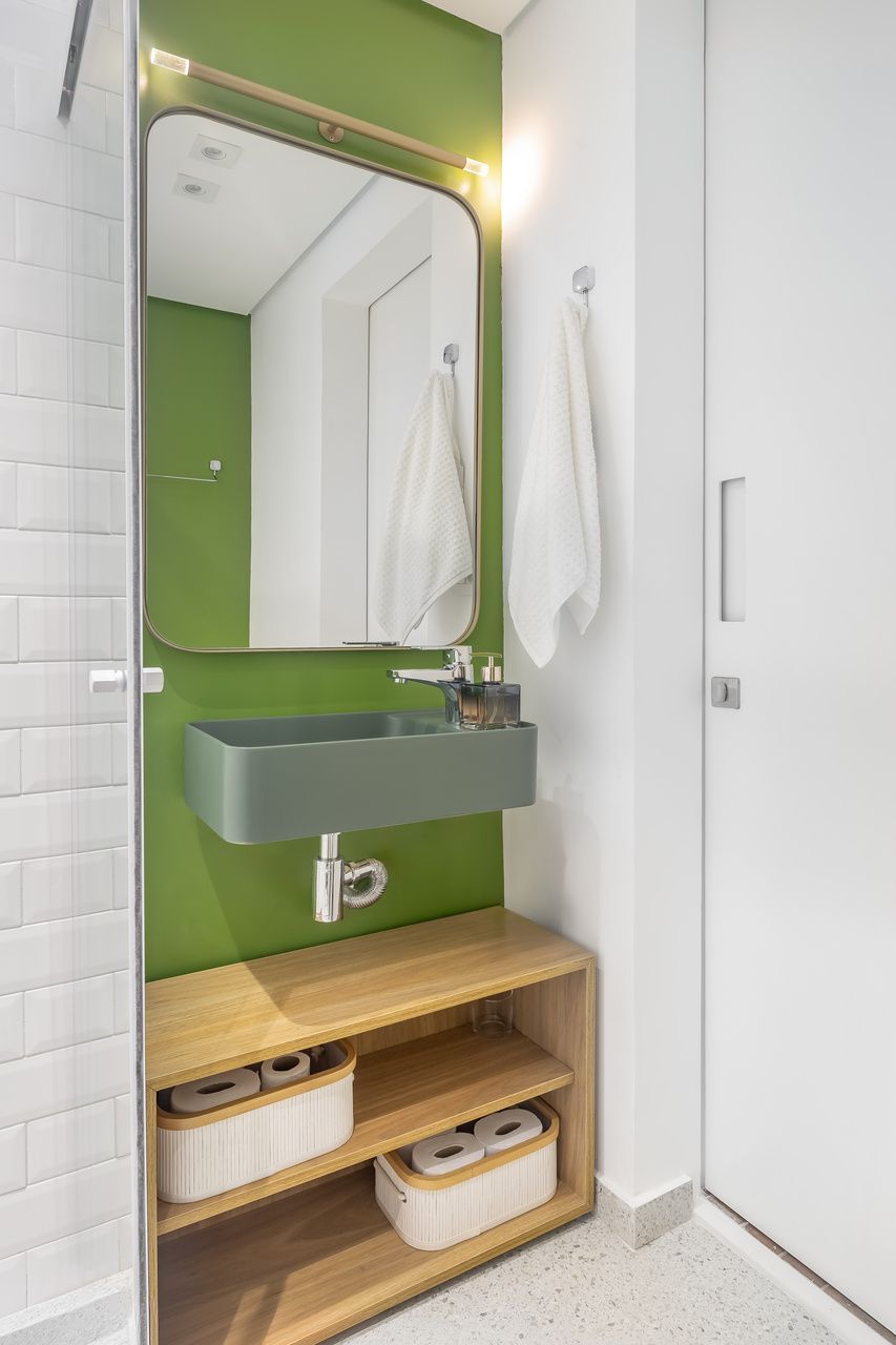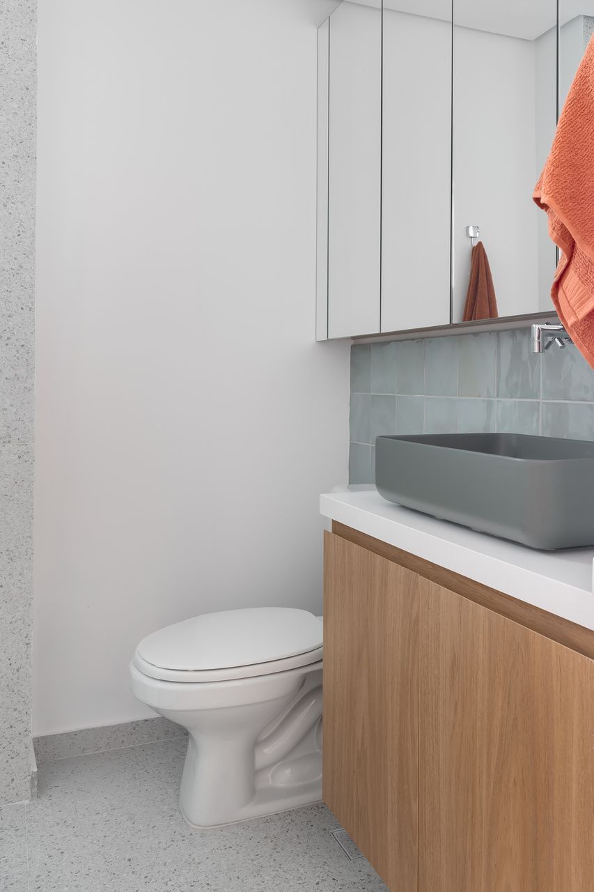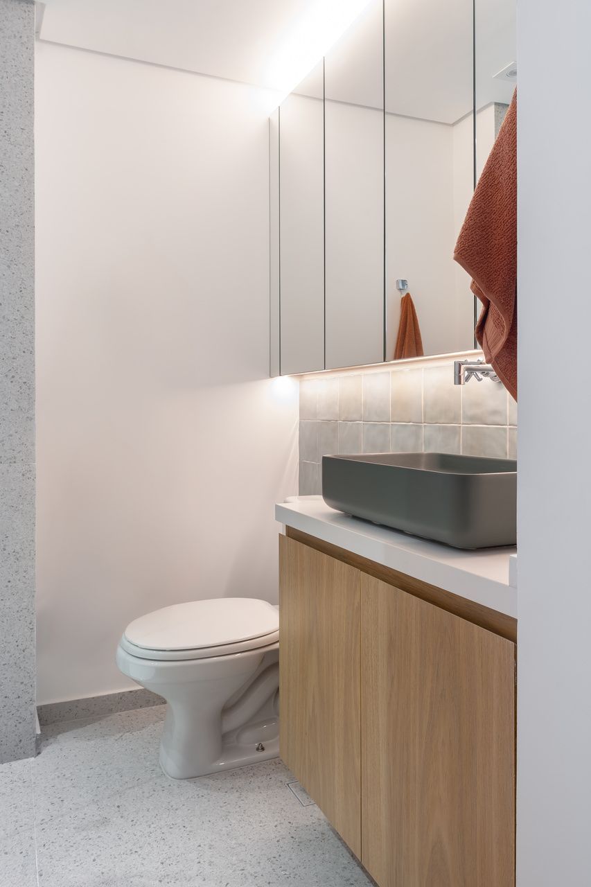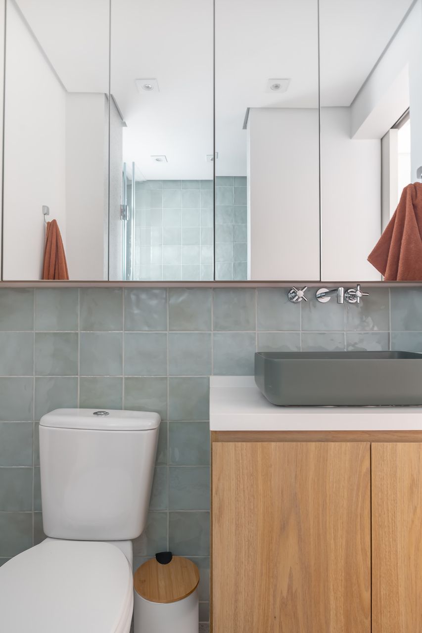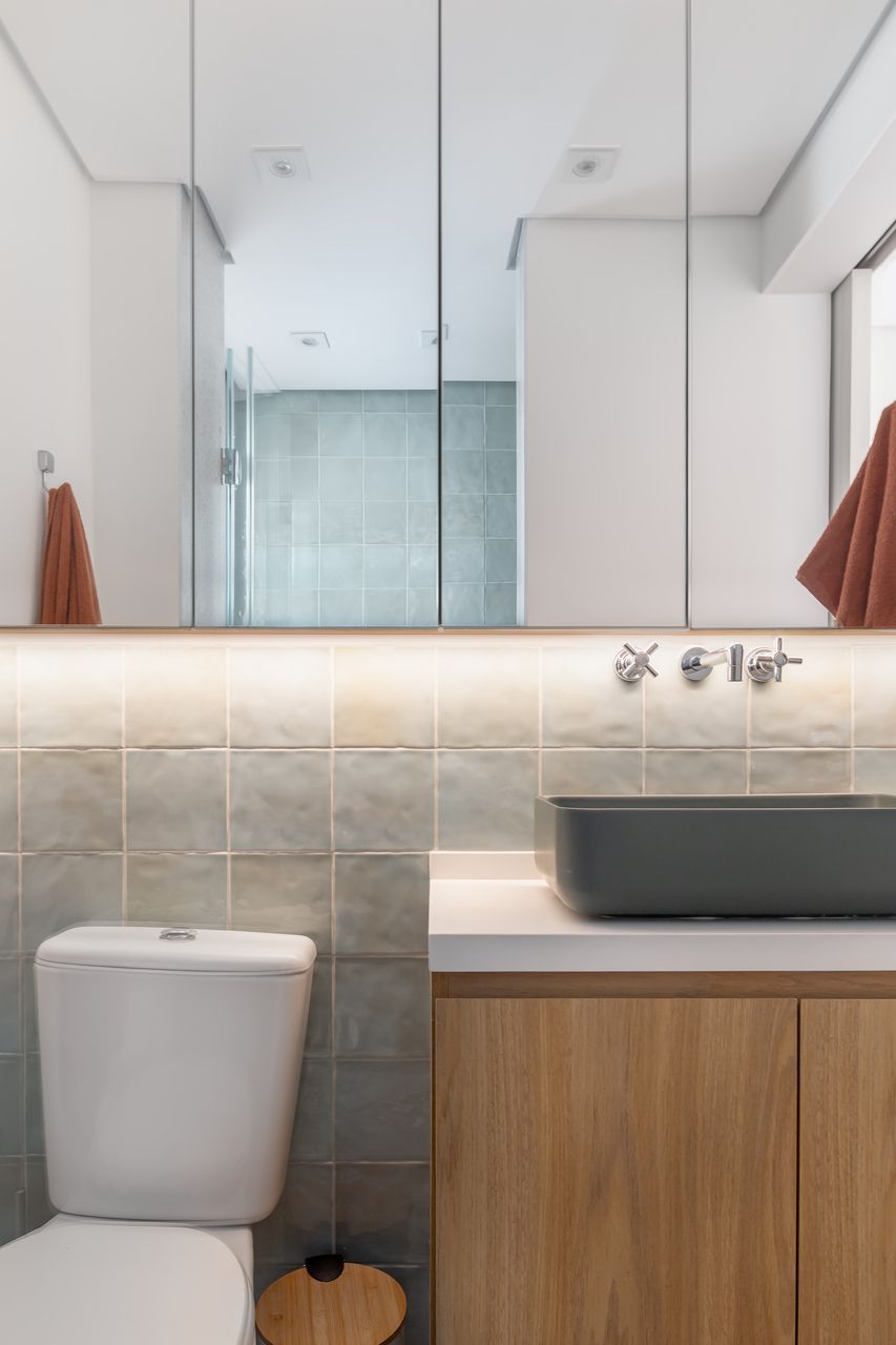 A materialidade desempenha papel essencial na narrativa do projeto de apartamento. Gabriella optou por texturas que dialogam com o tempo e a vivência, mais do que com a mera estética. No banheiro da suíte, por exemplo, o revestimento da linha Gouache, da Portobello, cria um jogo delicado de reflexos e movimento, evocando ondas sutis quando iluminado.