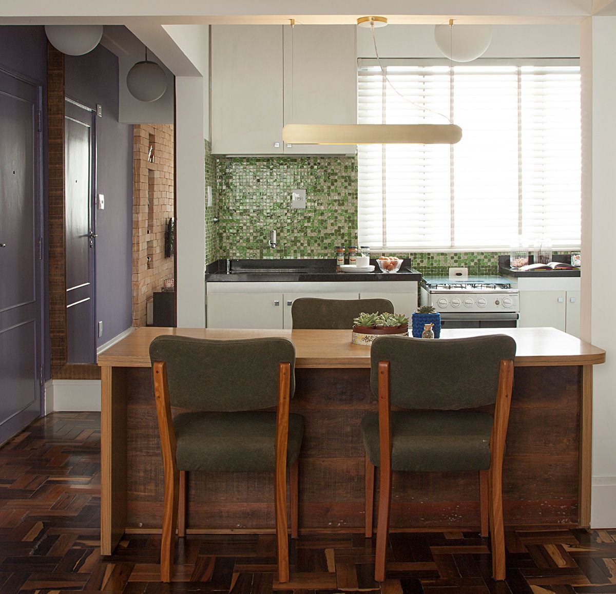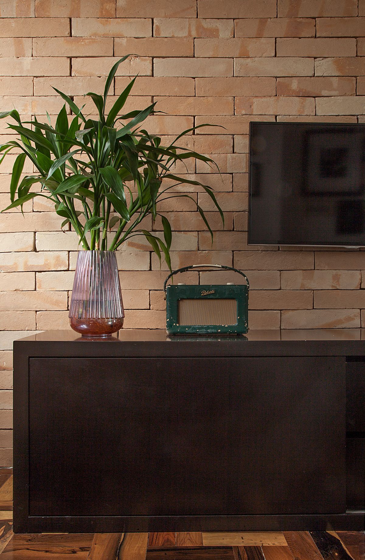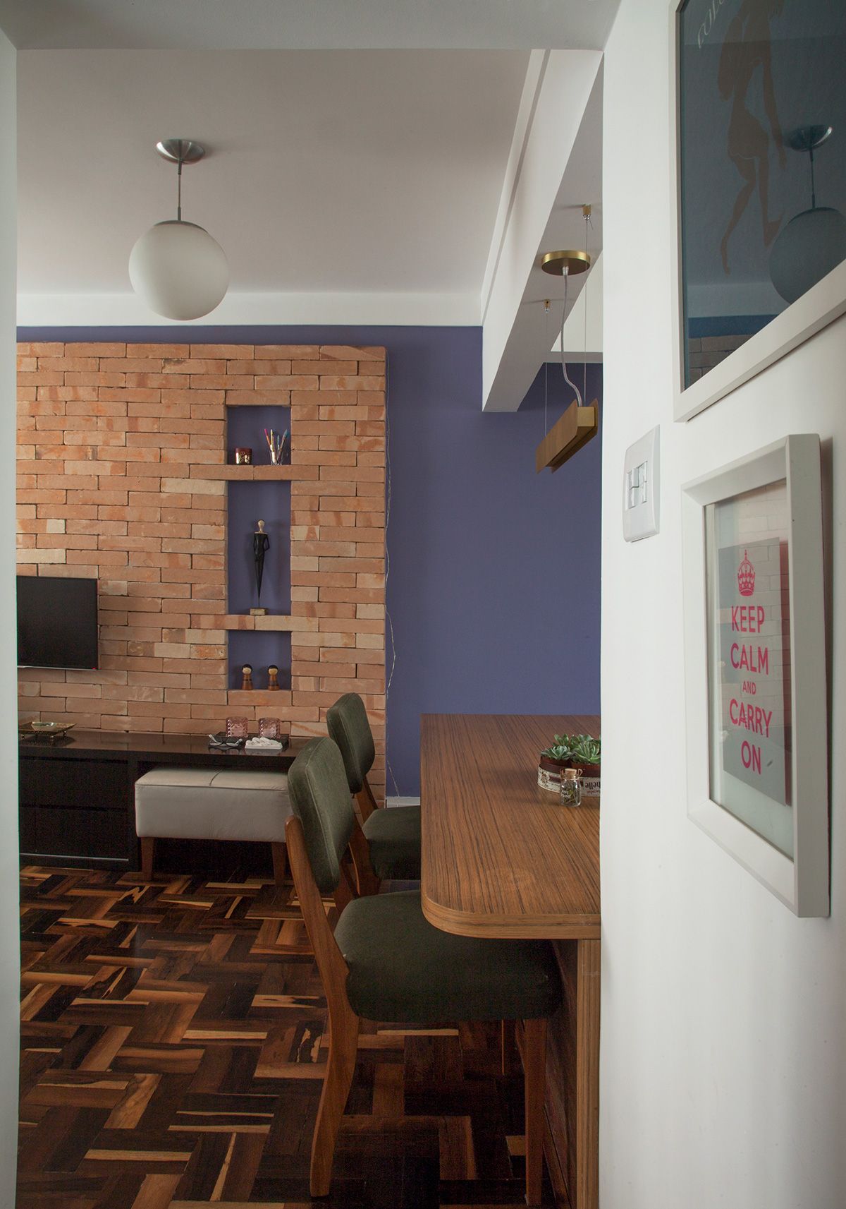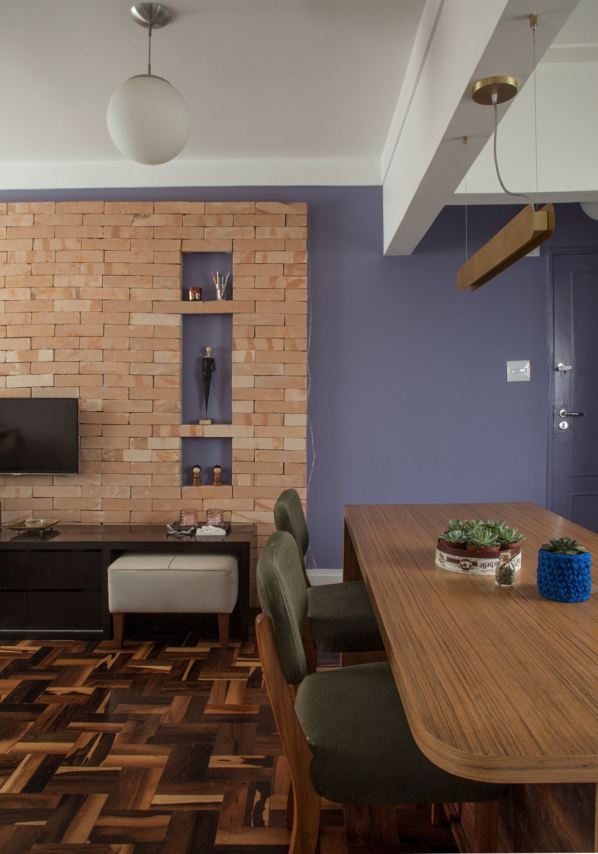 A mesa de jantar serve também como área de trabalho, e por isso foi projetado gaveteiro sob ela. Os materiais escolhidos, como o piso de madeira e a parede de tijolo aparente, dão um ar rústico à sala e destaca os itens trazidos de viagens cheios, que são cheios de personalidade e serviram como ponto de partida para a escolha dos demais itens de decoração.