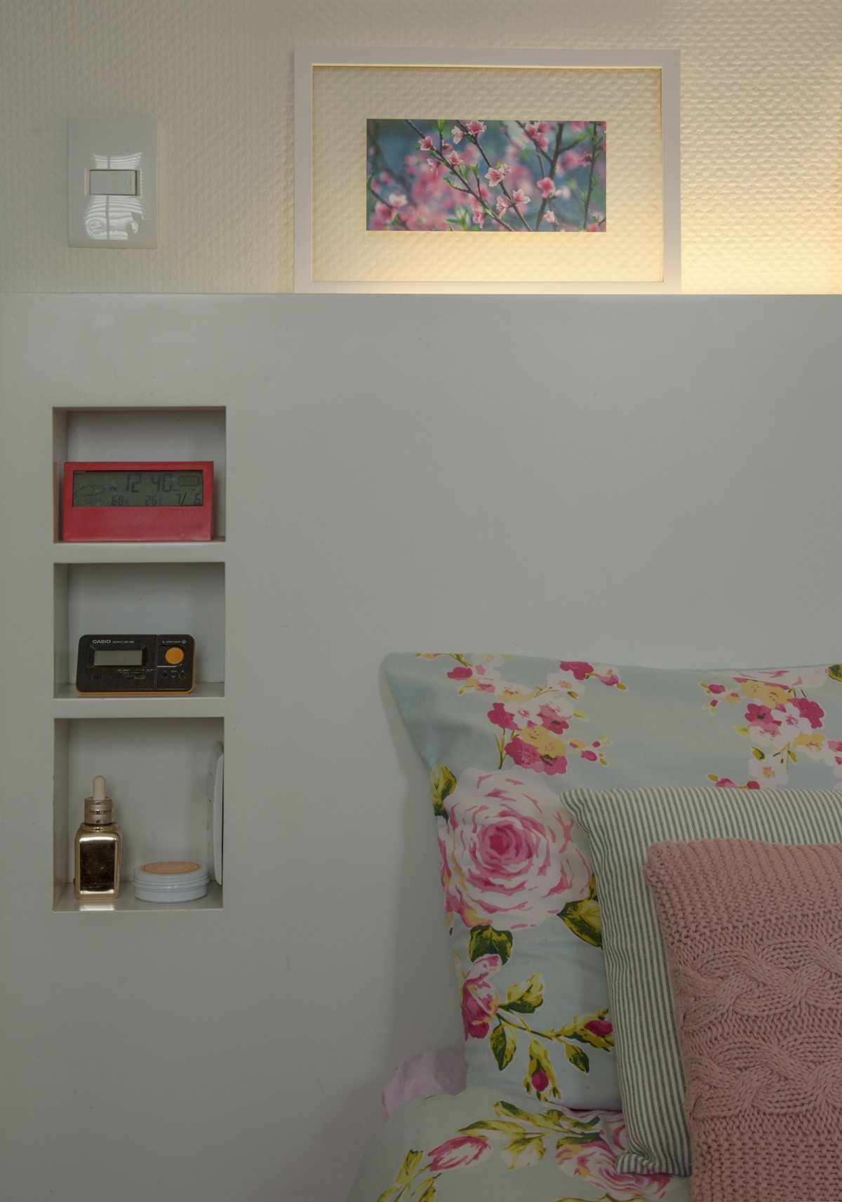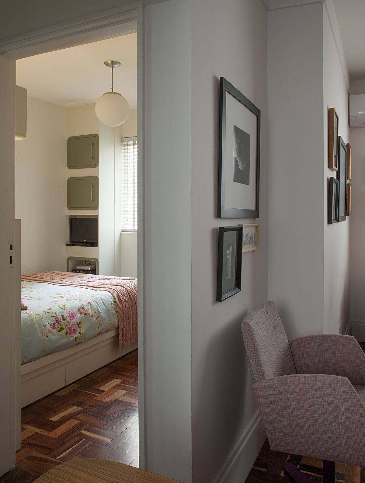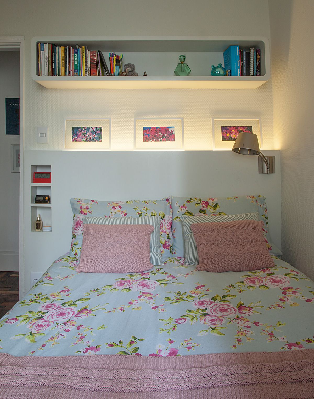 No quarto por exemplo, para valorizar o pouco espaço disponível, fizemos uma cabeceira sob medida com nichos que fazem às vezes de apoio lateral, e na frente da cama, projetamos um armário com portas para a moradora poder armazenar e organizar seus objetos.