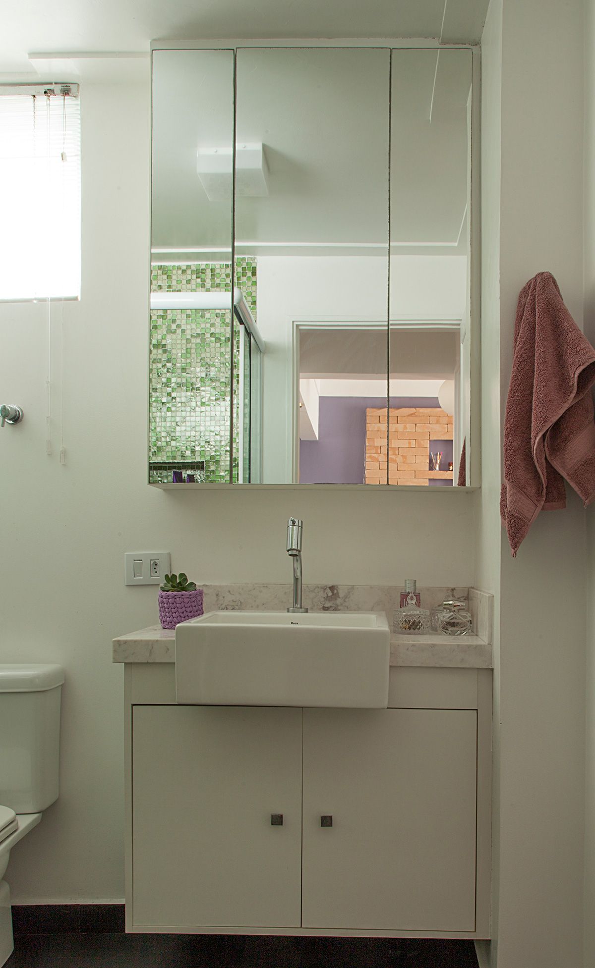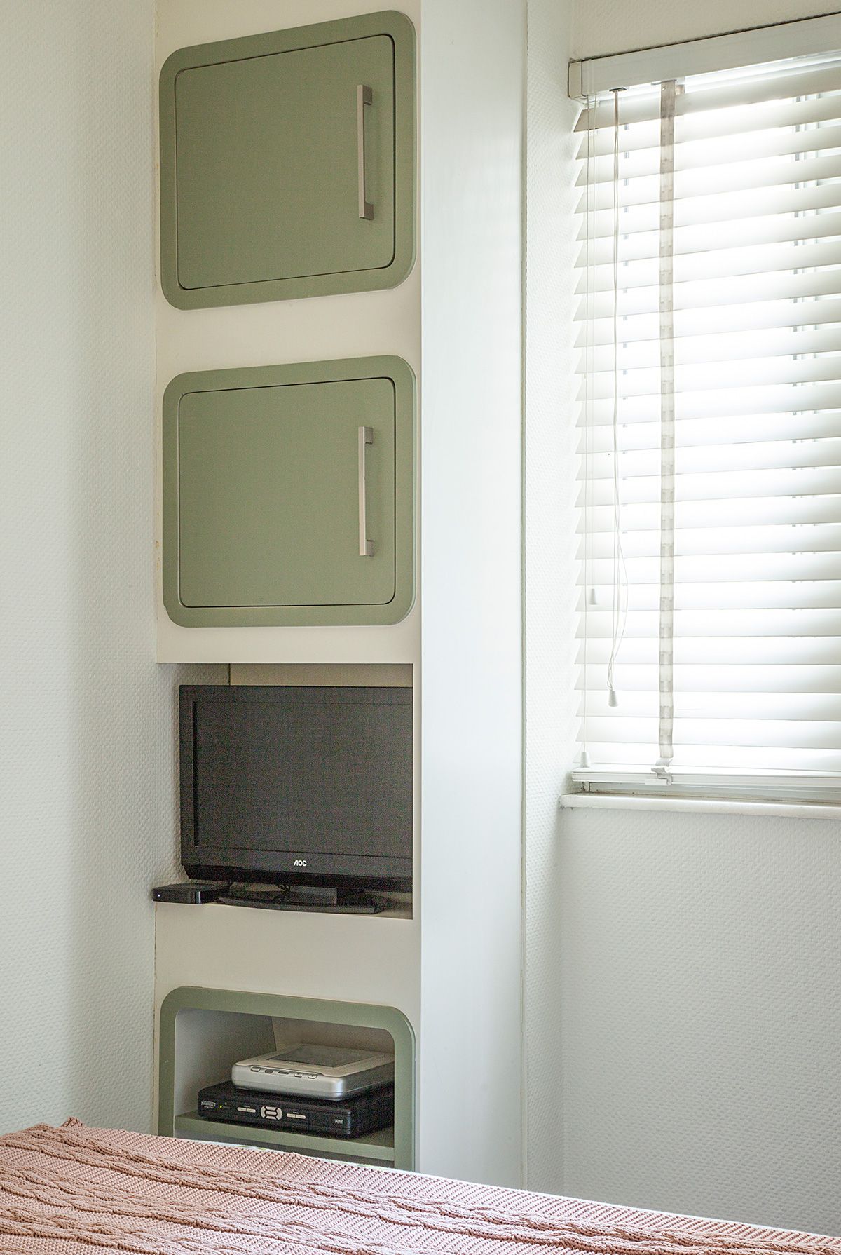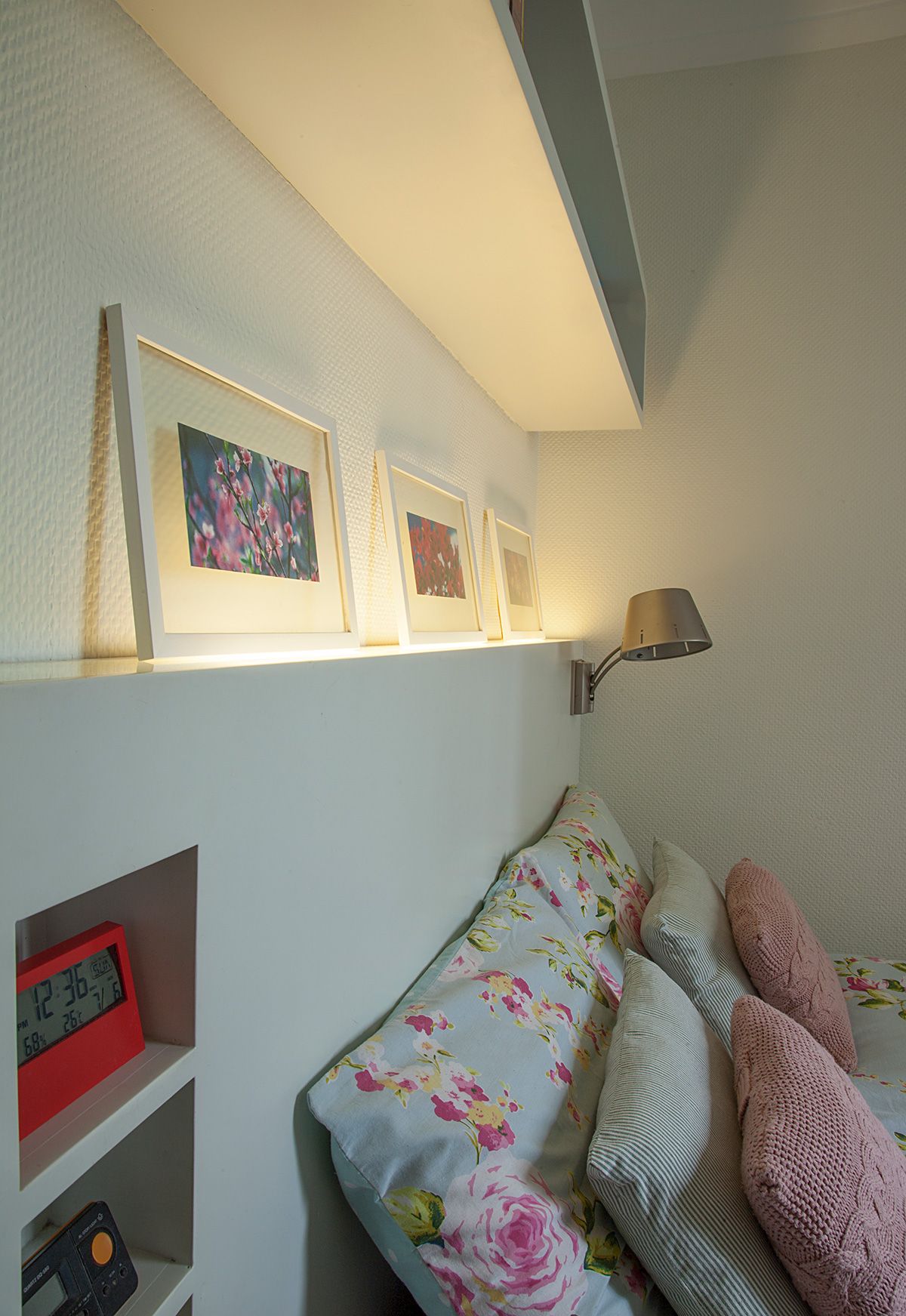 No quarto por exemplo, para valorizar o pouco espaço disponível, fizemos uma cabeceira sob medida com nichos que fazem às vezes de apoio lateral, e na frente da cama, projetamos um armário com portas para a moradora poder armazenar e organizar seus objetos.