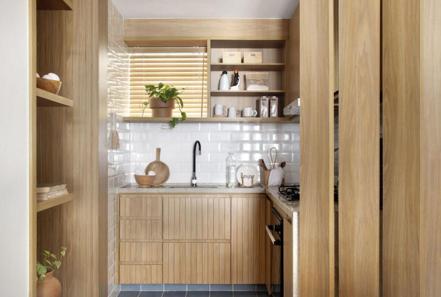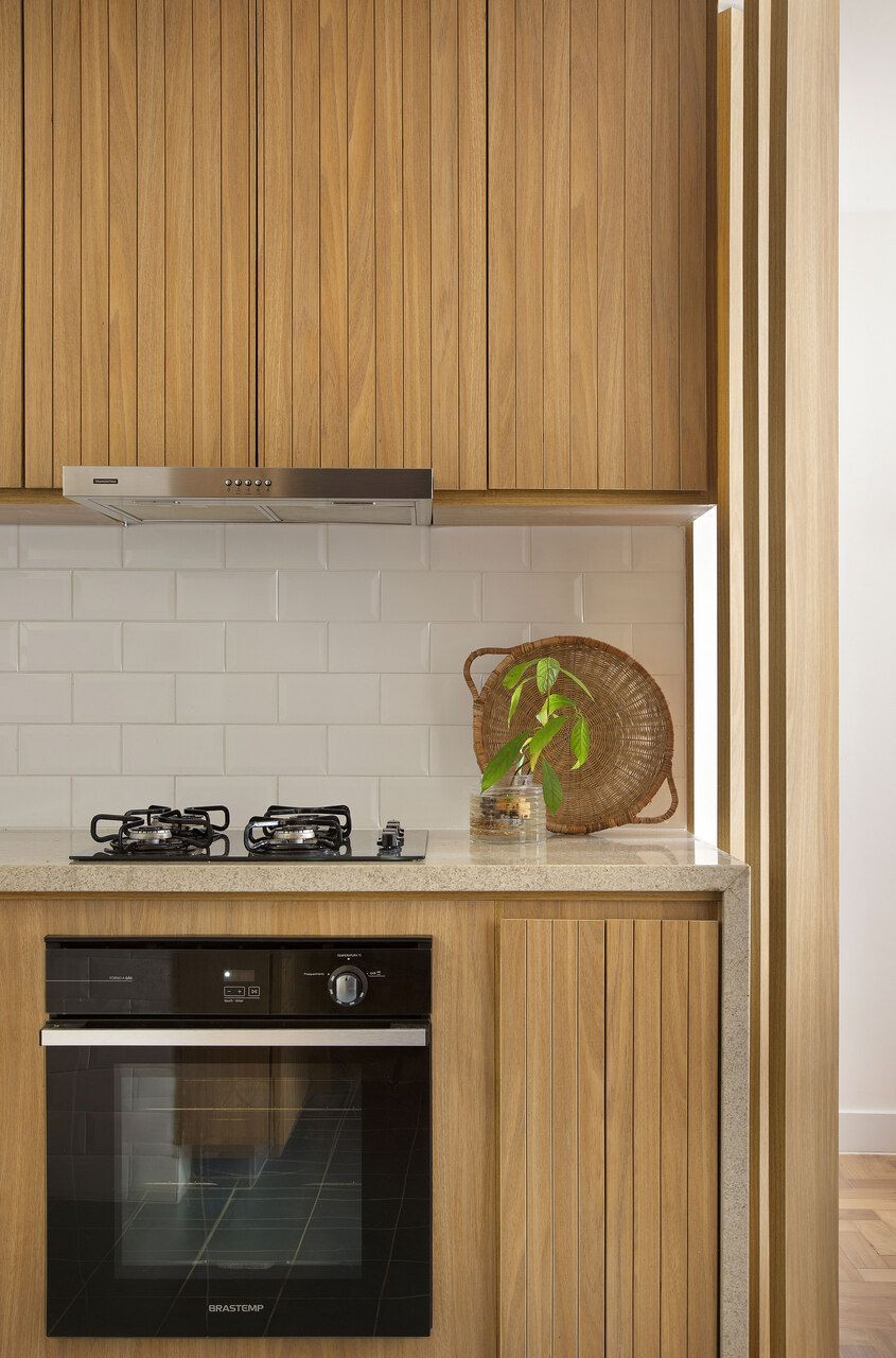 Outro elemento interessante são os brises verticais móveis entre a sala e a cozinha, que permitem dividir os espaços sem bloquear completamente a visão e ainda escondem a área técnica da bancada com cooktop.