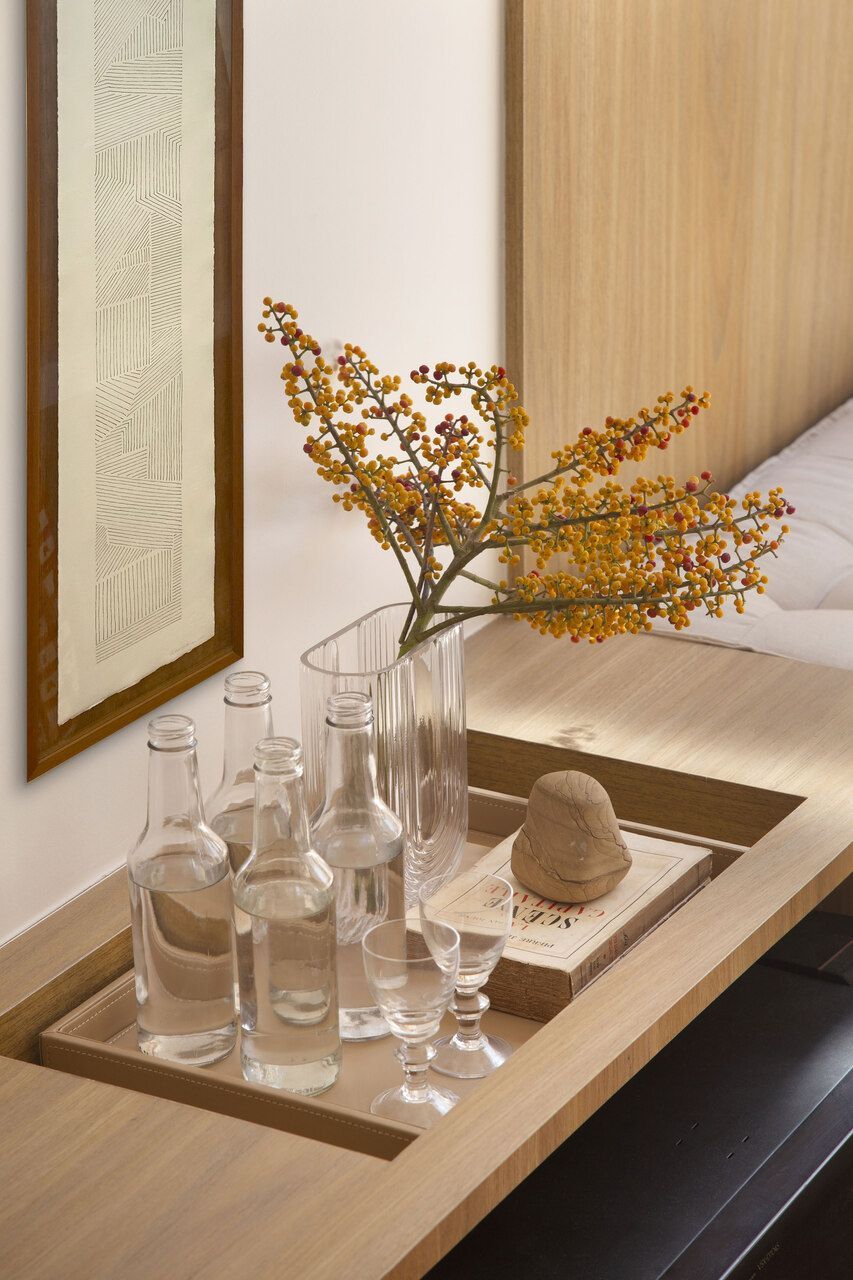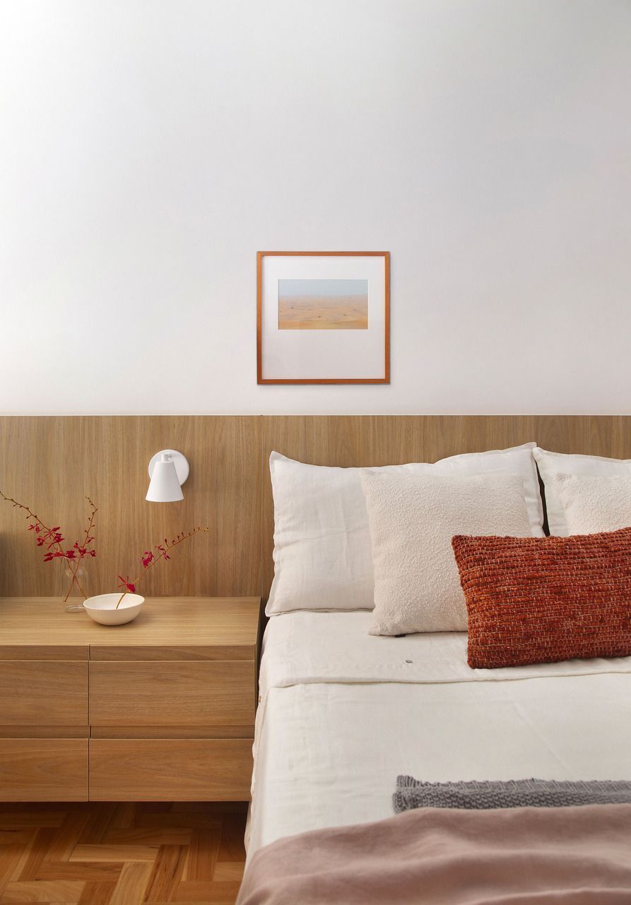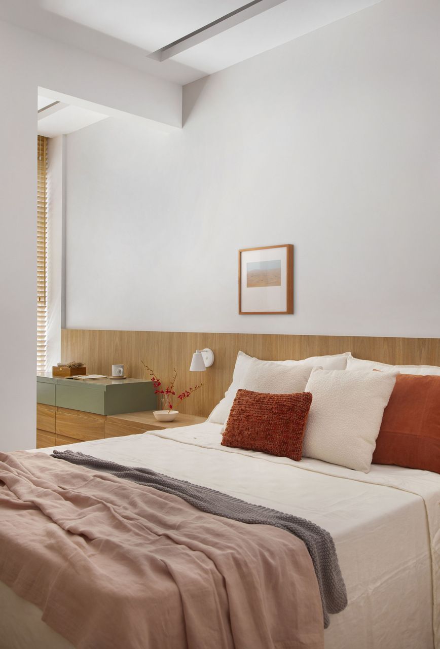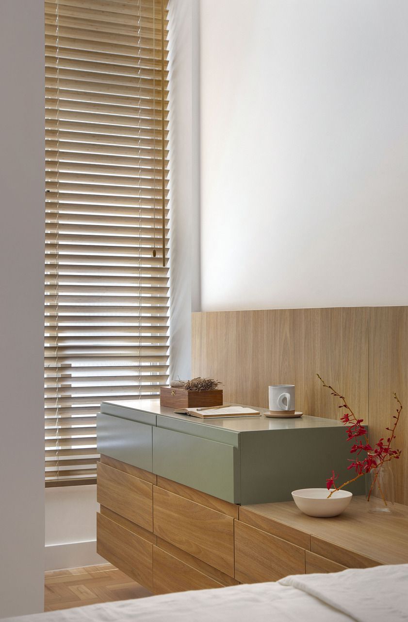 No dormitório do casal, um painel linear em freijó natural acompanha toda a parede da cabeceira da cama, ampliando visualmente o ambiente. A mesa de cabeceira acoplada ao painel combina gavetas em madeira e um toque de cor em laca verde, trazendo funcionalidade ao espaço.