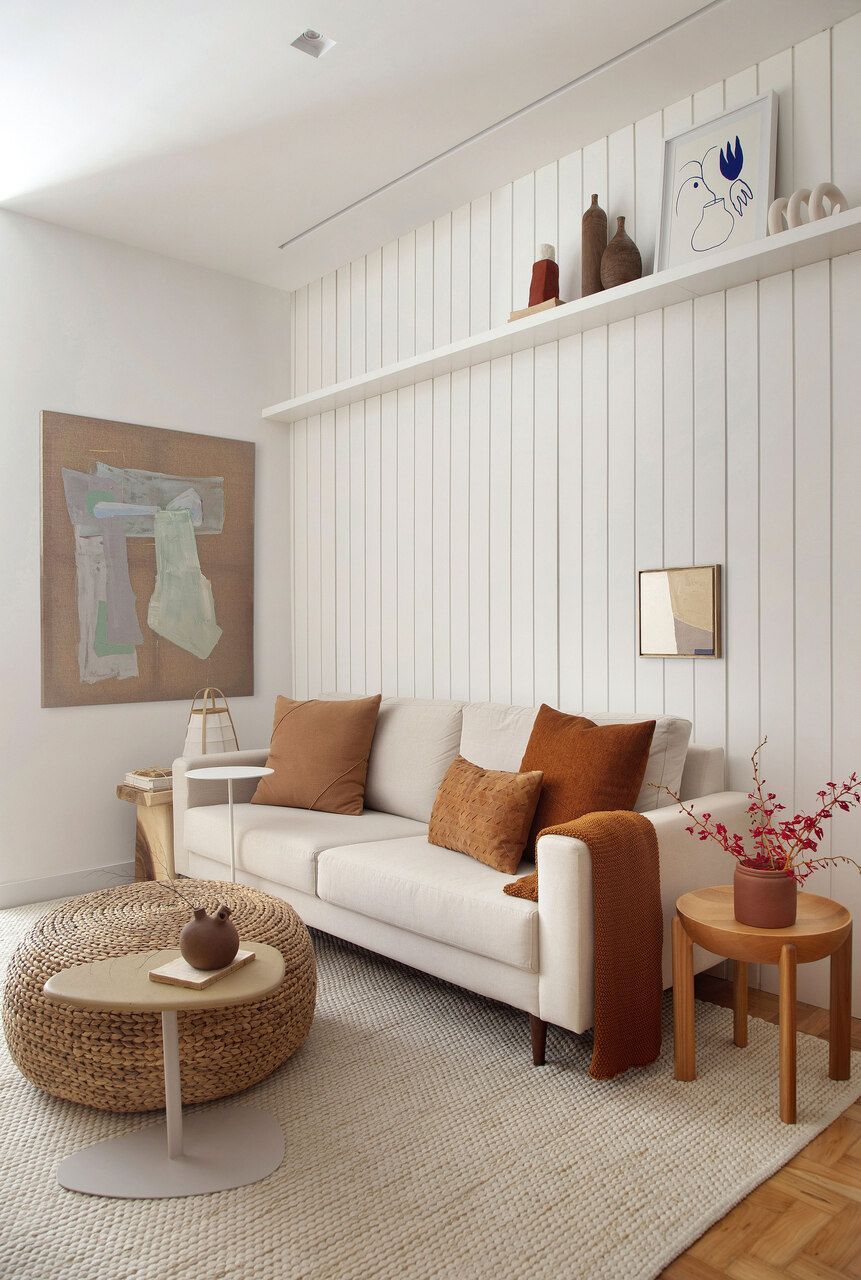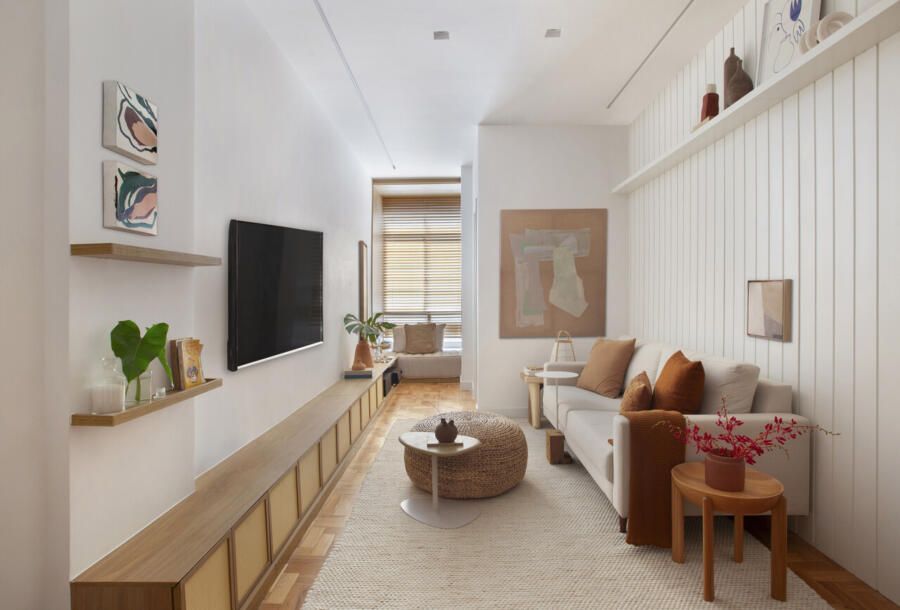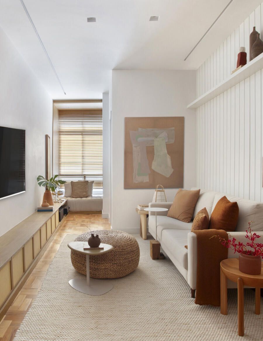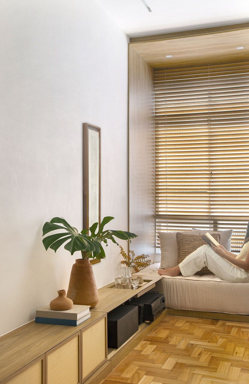 Um dos destaques da sala é o rack de marcenaria com portas de palhinha, que ocupa toda a extensão da parede, reforçando a integração dos ambientes. O móvel ainda se transforma em um banco abaixo da janela, criando um espaço de leitura bem iluminado pela luz natural.