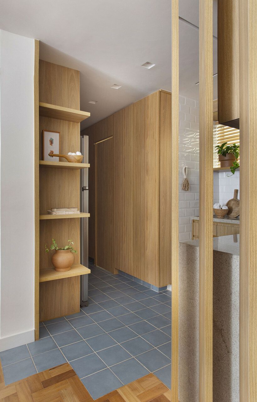 O projeto apostou em um visual claro e prático, inspirado na localização próxima ao mar de Copacabana. A paleta de cores inclui tons neutros e terrosos, com madeira freijó natural trazendo aconchego aos ambientes. O piso original de taco foi restaurado na sala e nos quartos, enquanto a cozinha ganhou um piso de cerâmica azul para um toque de cor e personalidade.