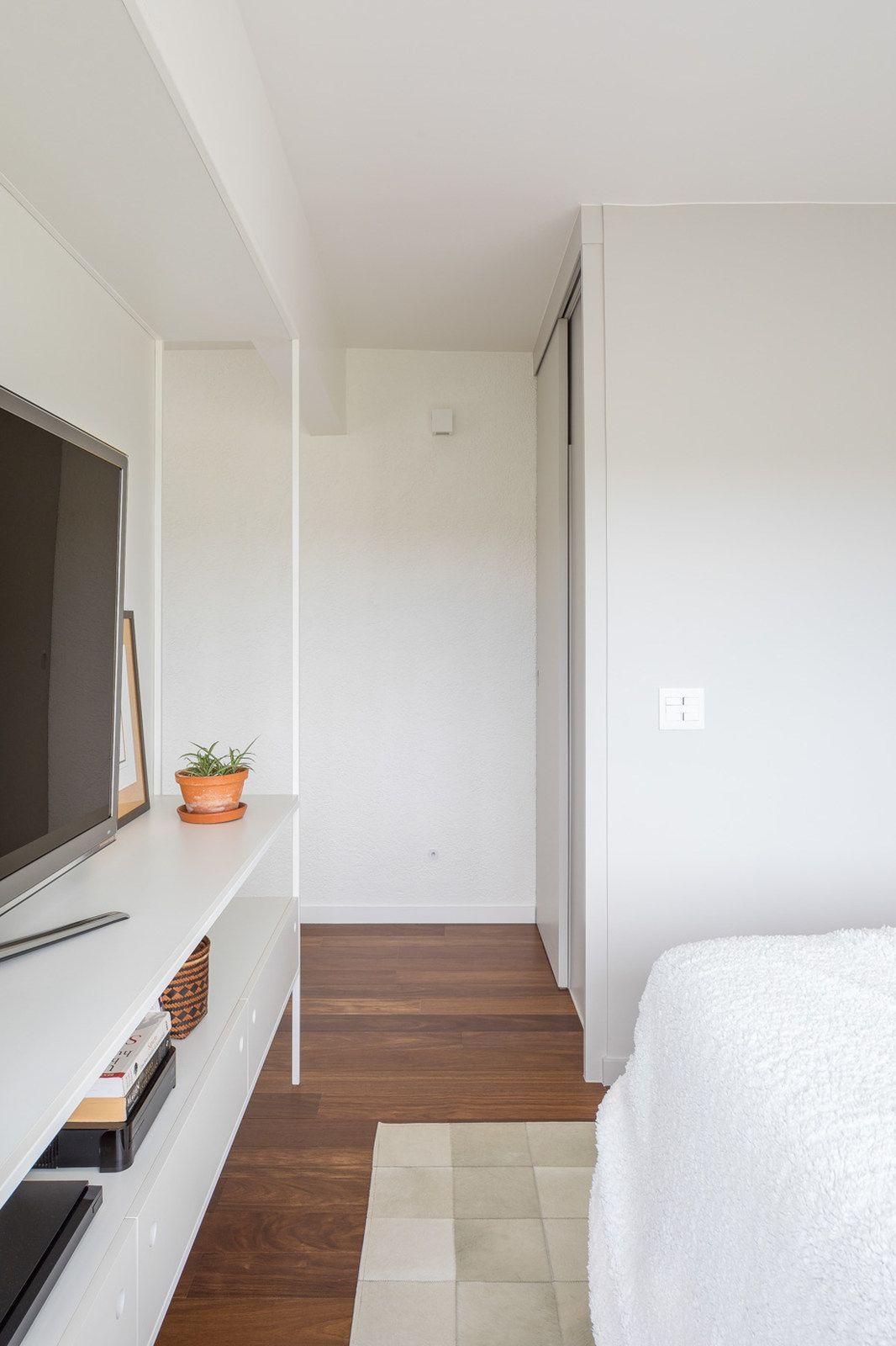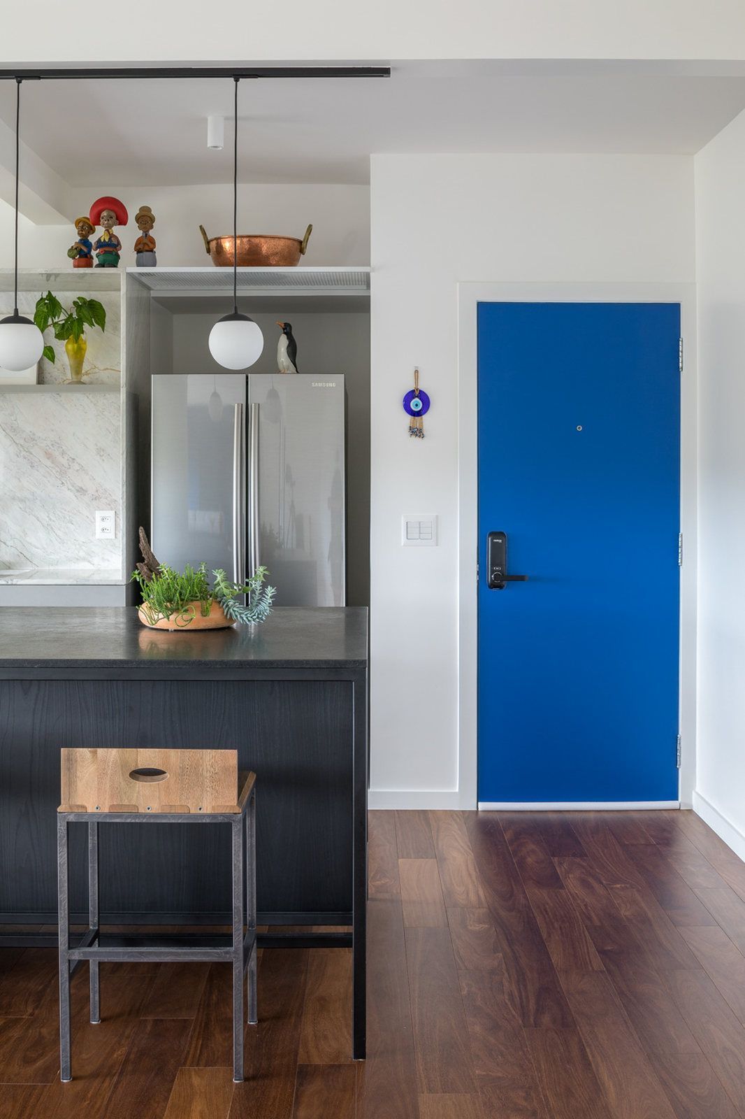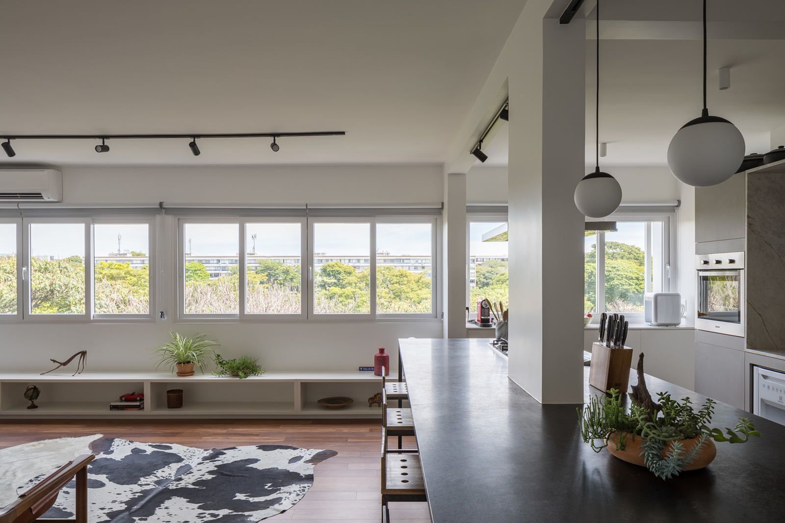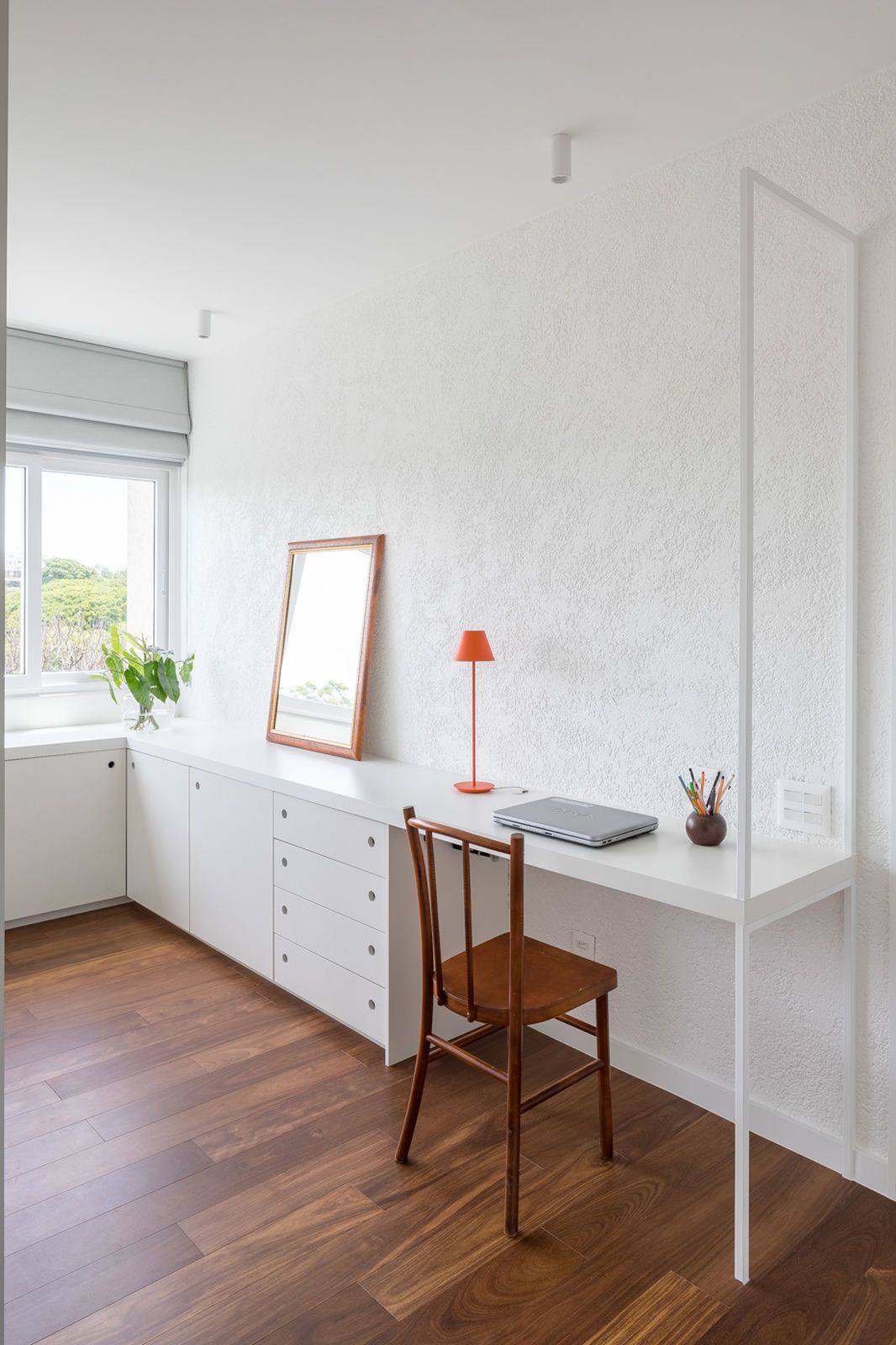 “Amante da cozinha, ele pediu um ambiente que integrasse esse cômodo à parte social da residência. Eis que após algumas demolições, um apartamento de três quartos virou um apartamento de quarto único e grande área social. O primeiro quarto deu lugar à sala de televisão e o segundo quarto deu lugar ao escritório, com closet integrado ao último quarto de dormir.”