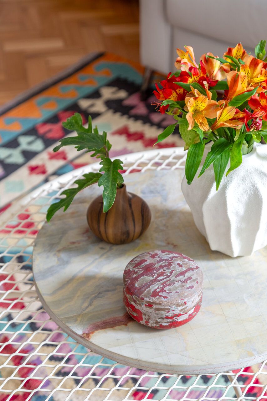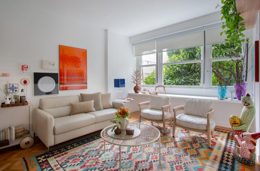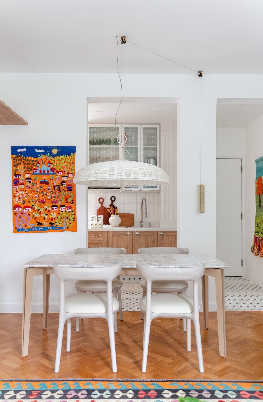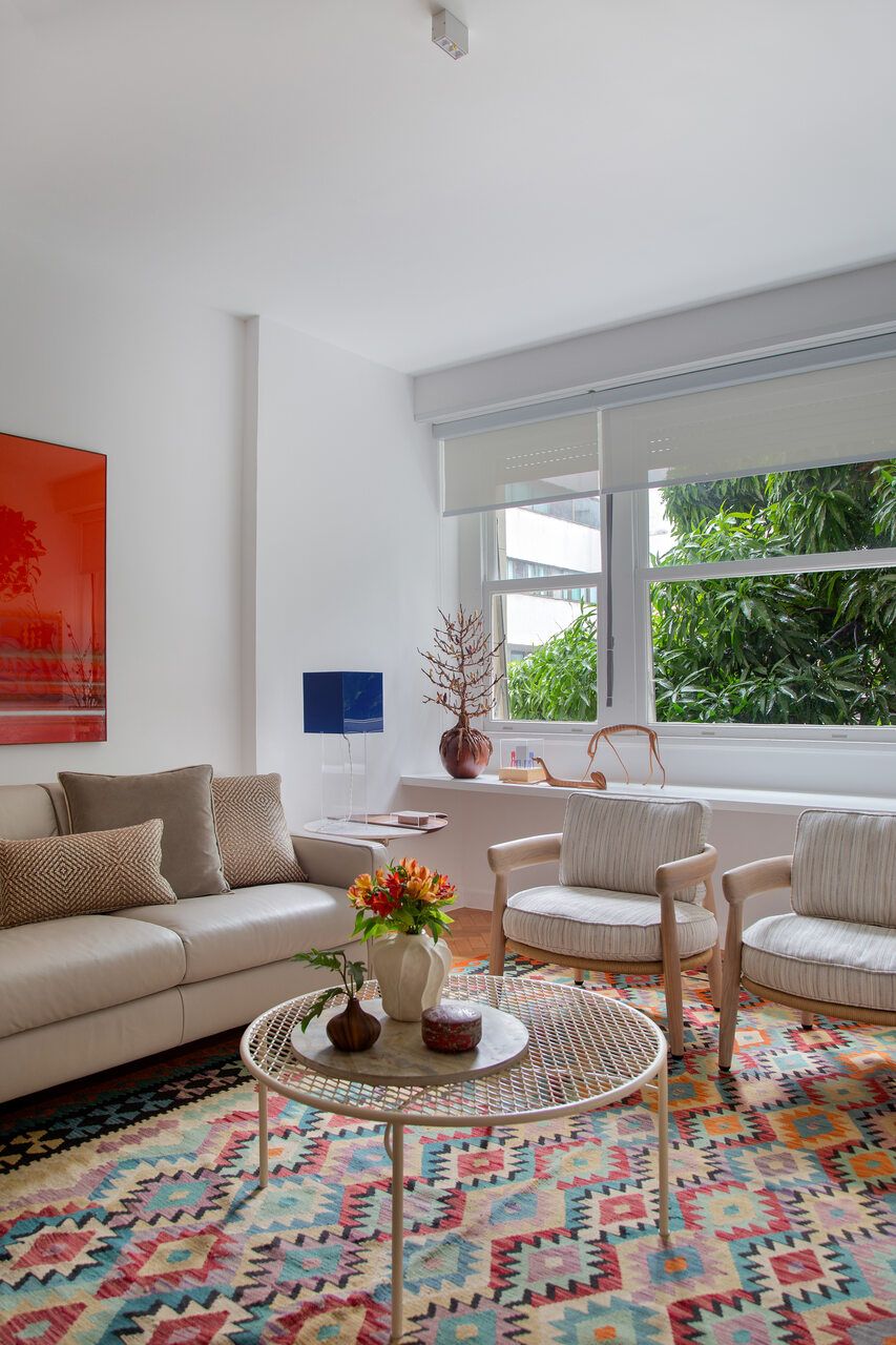 A decoração foi inteiramente renovada e tem como protagonistas móveis assinados por Jader Almeida, como a mesa de jantar Dinn com tampo em pedra exótica, as cadeiras Alba Wood, a mesa de centro Doty e o carrinho de apoio Teca. A base neutra, com paredes e teto pintados em Branco Neve, funciona como pano de fundo para uma sala vibrante, marcada pelo tapete kilim geométrico e colorido, de onde surgem as referências cromáticas para as obras de arte. Entre elas, o tecido bordado à mão e a tapeçaria da artesã colombiana Argenis Ocampo, que adicionam textura e identidade ao espaço.