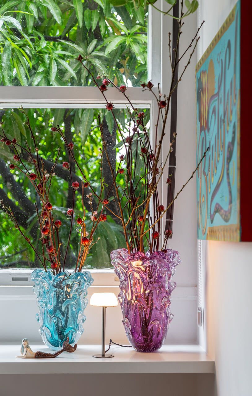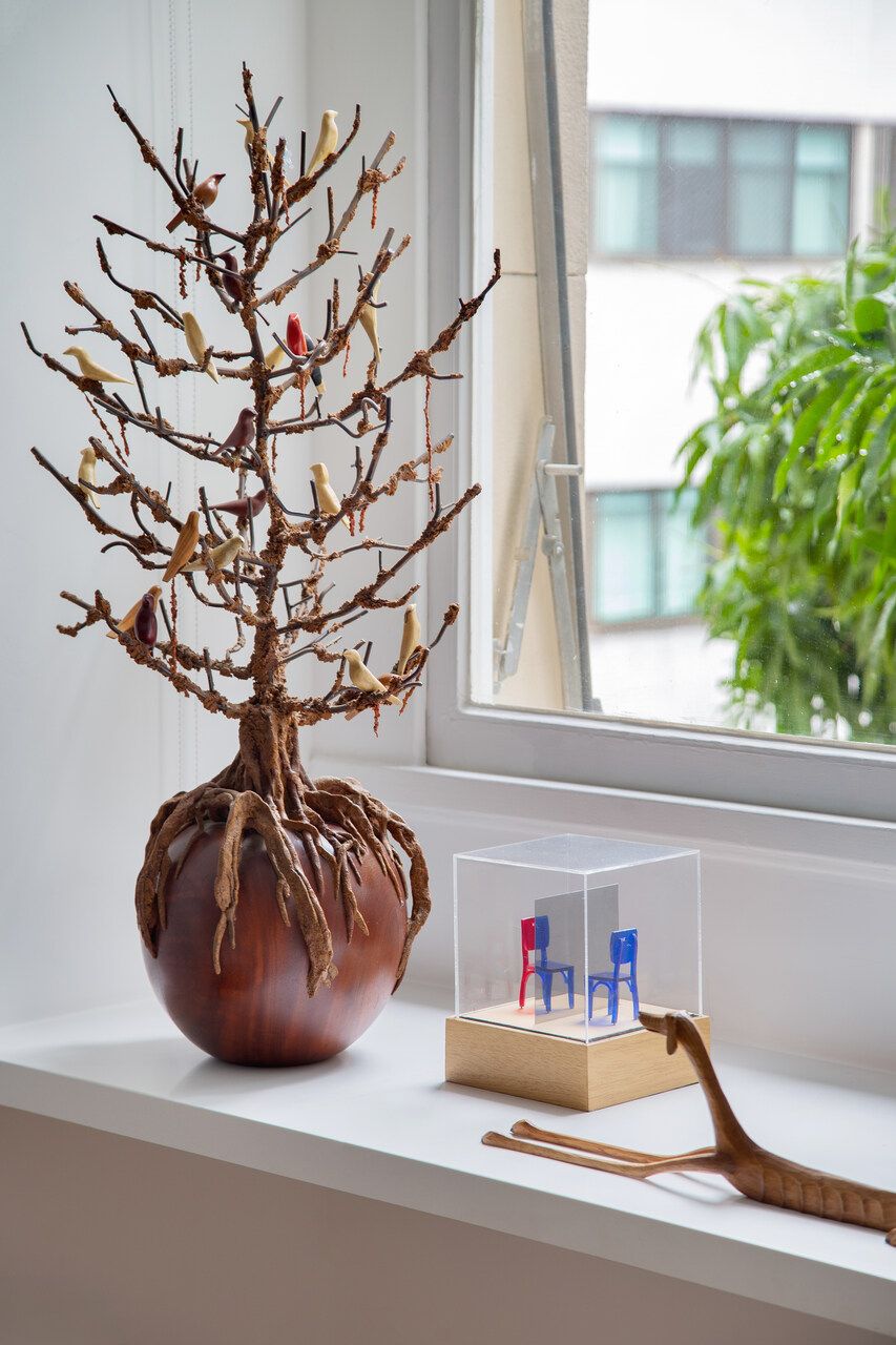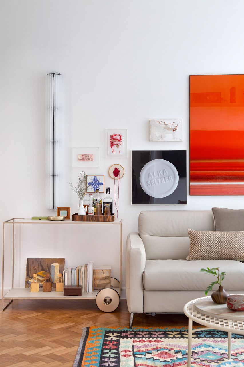 A decoração foi inteiramente renovada e tem como protagonistas móveis assinados por Jader Almeida, como a mesa de jantar Dinn com tampo em pedra exótica, as cadeiras Alba Wood, a mesa de centro Doty e o carrinho de apoio Teca. A base neutra, com paredes e teto pintados em Branco Neve, funciona como pano de fundo para uma sala vibrante, marcada pelo tapete kilim geométrico e colorido, de onde surgem as referências cromáticas para as obras de arte. Entre elas, o tecido bordado à mão e a tapeçaria da artesã colombiana Argenis Ocampo, que adicionam textura e identidade ao espaço.
