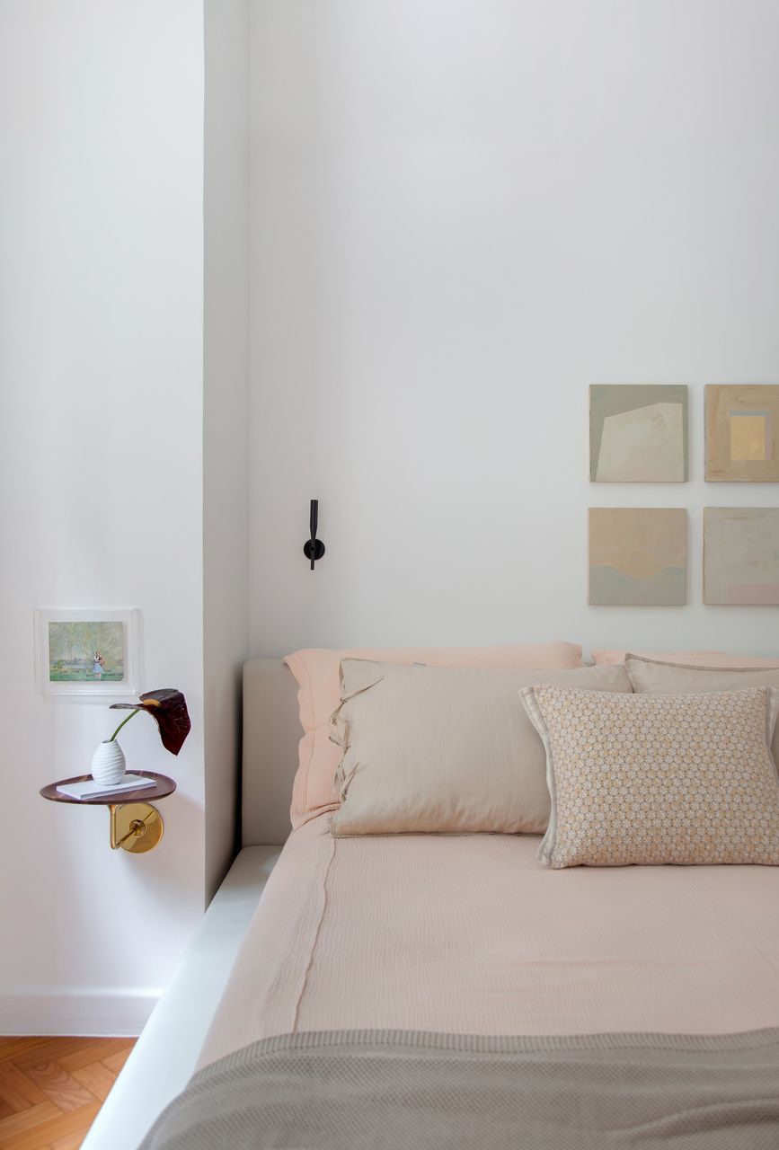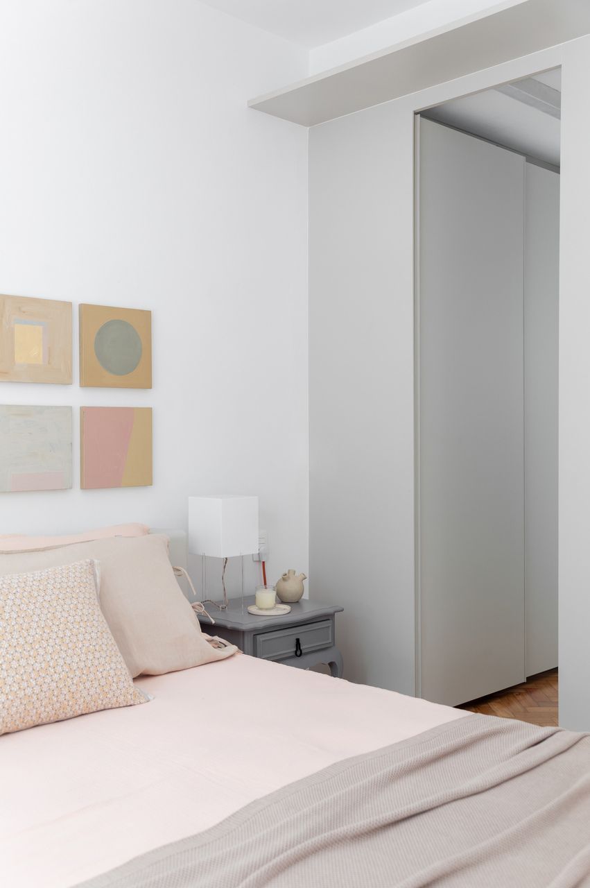No quarto, o clima é de acolhimento sereno. A roupa de cama em tons pastéis, assinada pela Paramento, conversa com a mesa de apoio Jardim, de Jader Almeida, e com a composição delicada de pequenos quadros de Thomáz Velho. O resultado é um ambiente elegante e tranquilo, que equilibra descanso e personalidade. De estilo contemporâneo maximalista, o projeto foi desenvolvido e finalizado em seis meses.