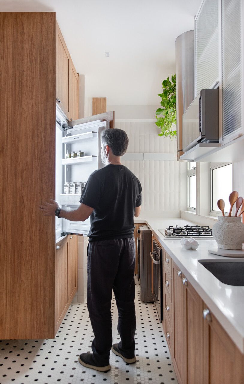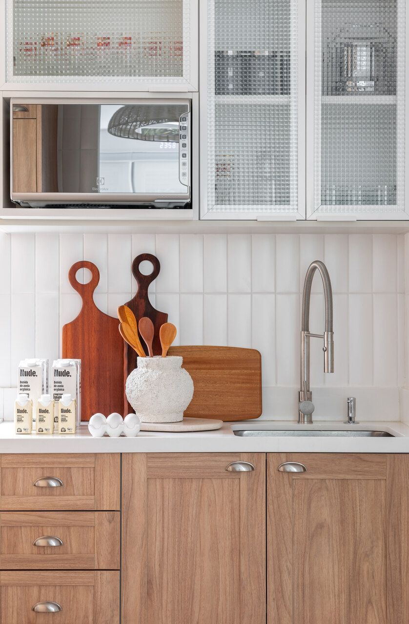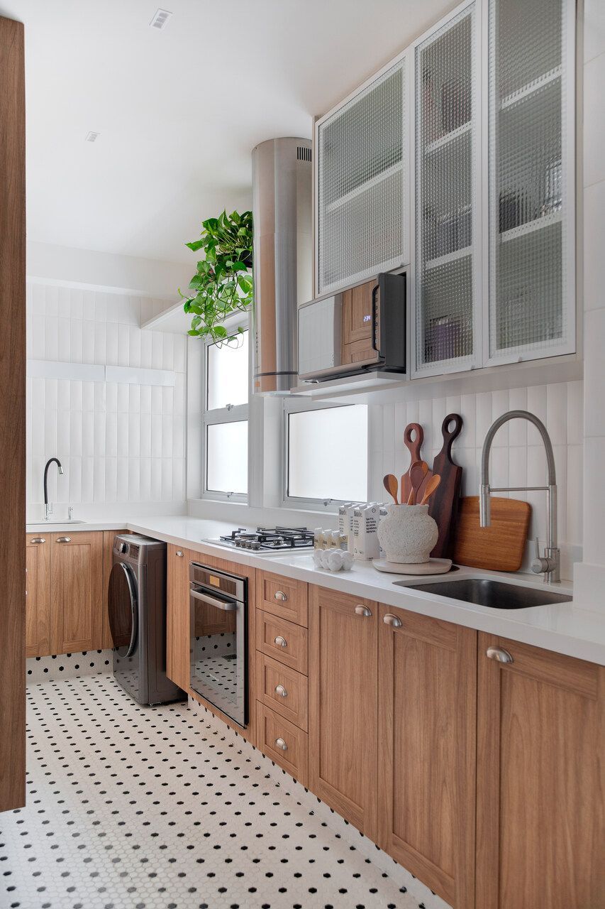Ainda na área social, a atmosfera descontraída se completa com a luminária Don, regulável por contrapeso, e com as fotografias de Ariosto Amado posicionadas sobre o sofá, uma em tons de laranja e vermelho e outra retratando um comprimido de Alka Seltzer. Elementos que trazem humor e reforçam a proposta de um apartamento despretensioso, pensado para o descanso e o prazer de estar. A cozinha integrada se destaca pelo piso retrô de pastilhas cerâmicas em preto e branco, que dialoga com a ideia de memória e atemporalidade. Os armários superiores com portas de vidro iluminadas conferem leveza e sofisticação, enquanto a geladeira embutida mantém o visual limpo e alinhado ao restante da área social, sem interferir na leitura do espaço.