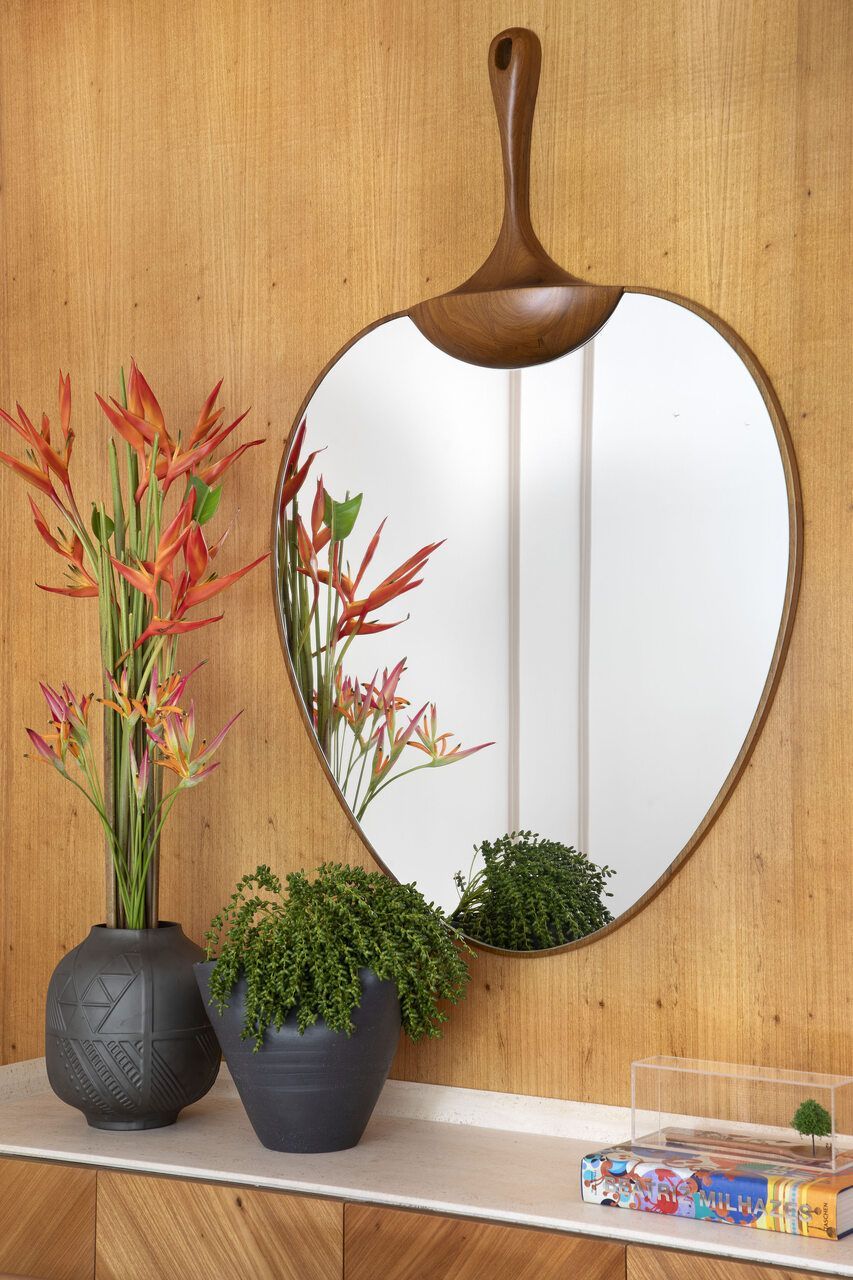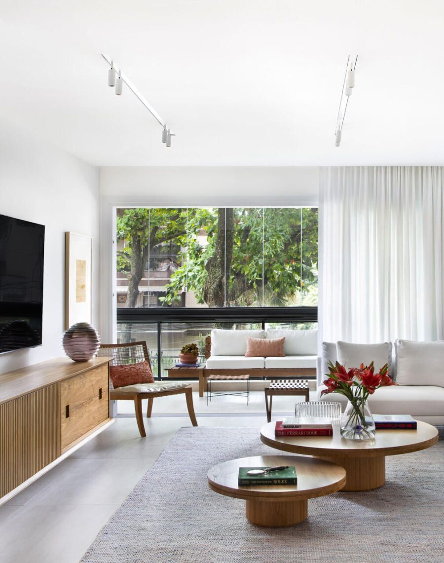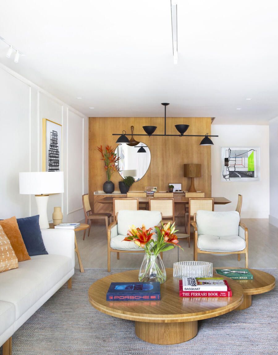 A decoração segue um conceito atual e atemporal, priorizando peças de design nacional. Entre os destaques na área social, estão cadeiras, poltronas e sofás confortáveis, além de mesas laterais e luminárias que complementam o ambiente.