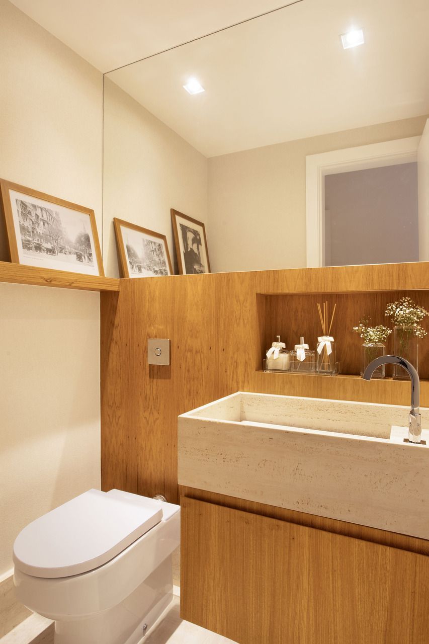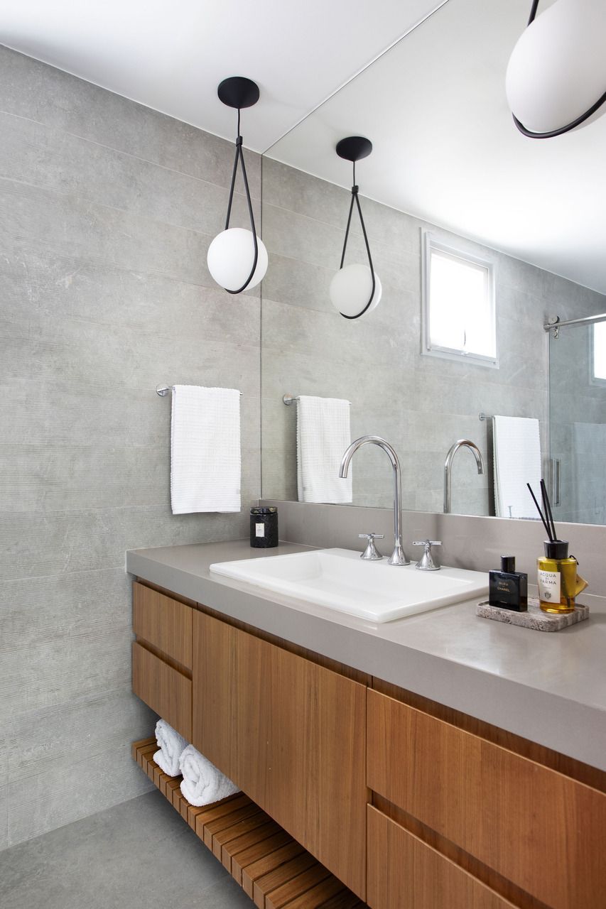 Na cozinha, banquetas de madeira agregam charme ao espaço. No banheiro da suíte, pendentes modernos trazem um toque especial à decoração.