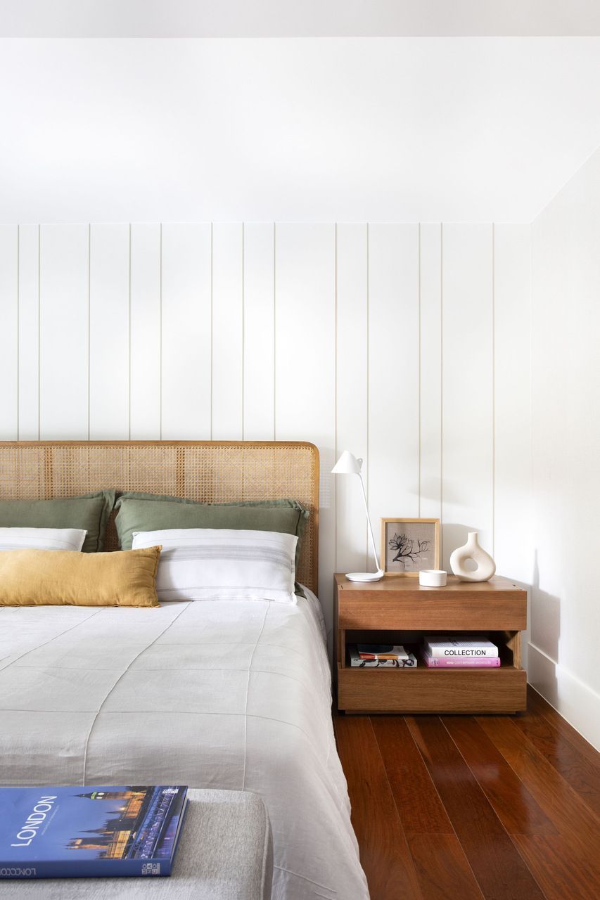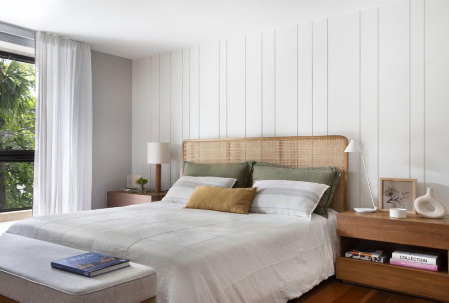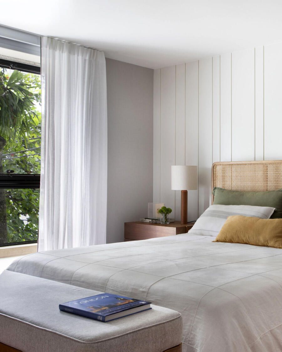 No quarto do morador, o piso de madeira maciça foi restaurado, e um painel branco foi instalado atrás da cama. As paredes receberam papel de parede neutro, e as cortinas foram confeccionadas em tecido leve, proporcionando aconchego ao espaço.