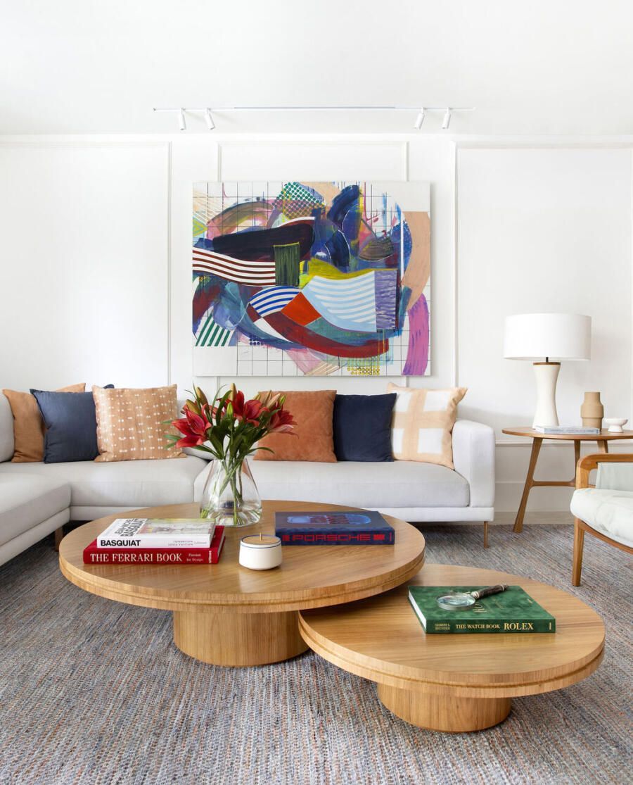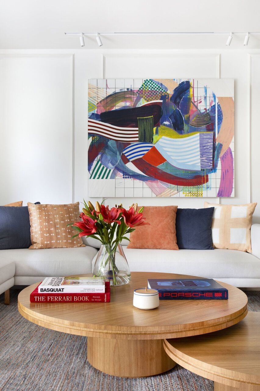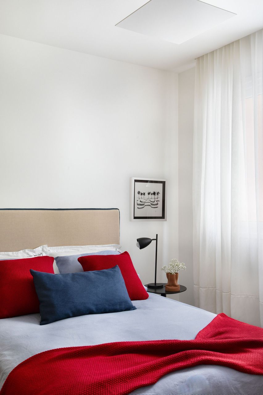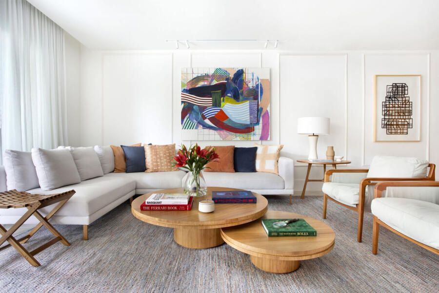O apartamento original apresentava divisões que comprometiam a iluminação natural e a sensação de amplitude. Para resolver esse problema, a arquiteta apostou em uma paleta de cores neutras, com tons claros predominando em todos os ambientes. Na área social, toques de cor foram introduzidos por meio de tapetes, almofadas e objetos decorativos. Nos quartos, as cores aparecem em detalhes das roupas de cama, enquanto, na cozinha, os armários em tom azul conferem personalidade ao espaço.