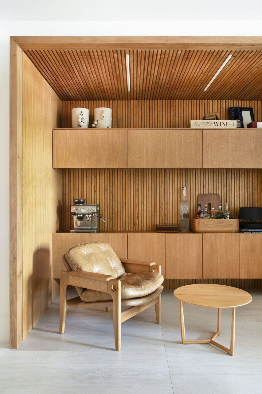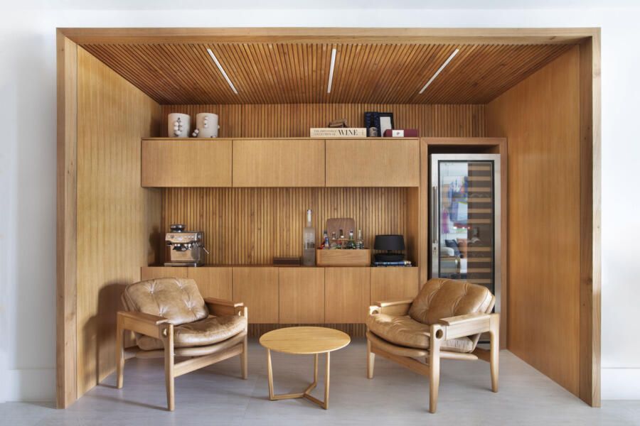 O principal pedido do morador foi a criação de um ambiente exclusivo para uma adega climatizada e a ampliação da suíte principal. Para atender a essa necessidade, a arquiteta aproveitou um recuo na área de jantar para instalar a adega e integrou dois quartos, resultando em uma suíte mais ampla com closet. Além disso, o banheiro social foi reformulado para um modelo canadense, atendendo tanto o closet quanto o quarto de hóspedes.