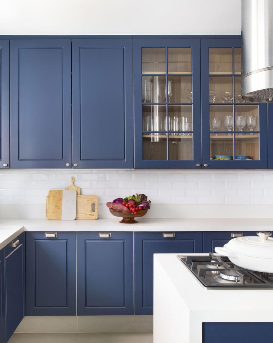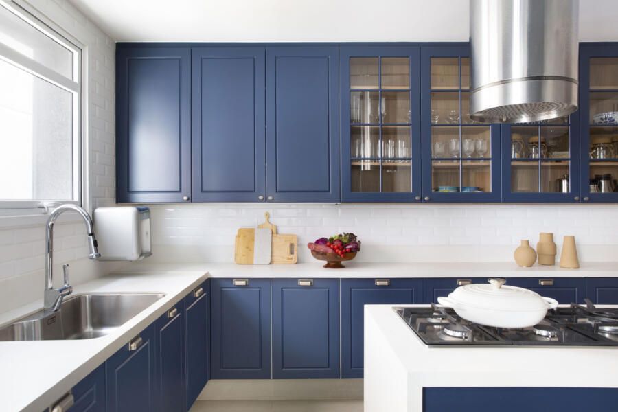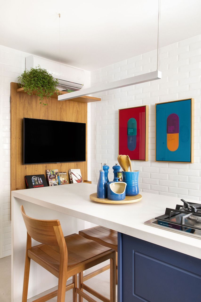 A escolha dos materiais foi essencial para garantir praticidade e beleza ao projeto. Na área social e varanda, a marcenaria foi executada em madeira natural, enquanto o piso recebeu porcelanato claro com aparência de pedra. Na cozinha, a bancada é de quartzo branco, e os armários ganharam pintura especial azul. As paredes foram revestidas com cerâmica branca retrô, trazendo um ar clássico ao ambiente.