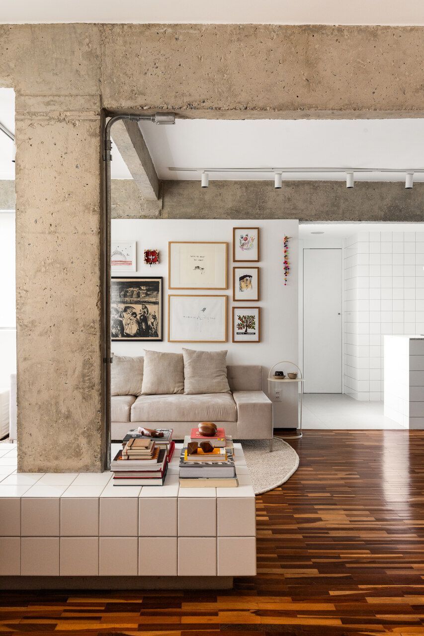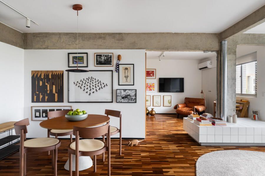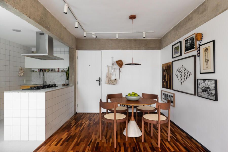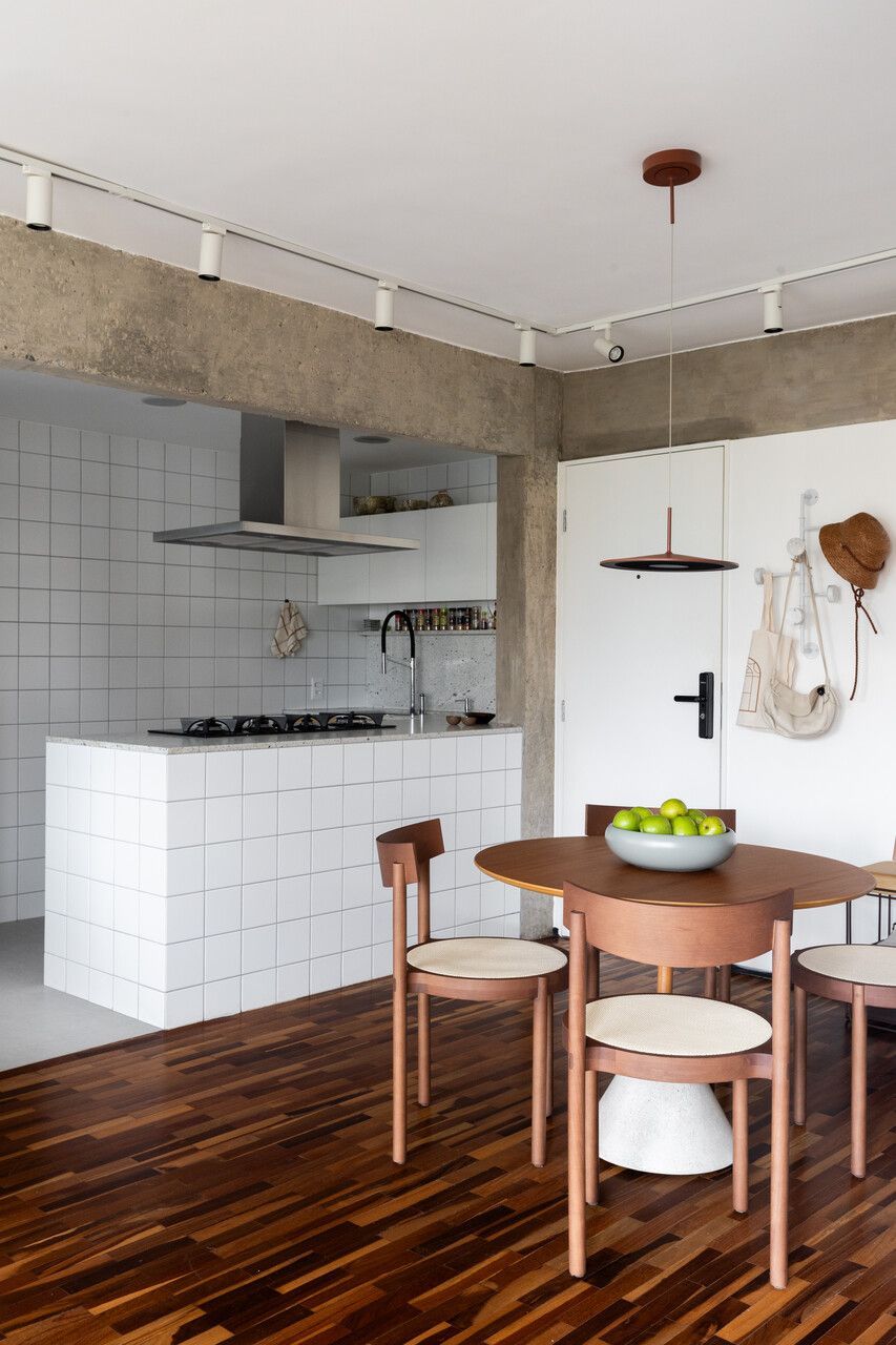 A planta original, bastante compartimentada — uma característica comum dos imóveis de dois quartos da região — representava um desafio para quem desejava mais integração e luz natural. A solução encontrada pelos arquitetos foi demolir diversas paredes, expondo vigas, pilares e tubulações e revelando a estrutura original do edifício, o que se tornou um dos principais elementos visuais do projeto.