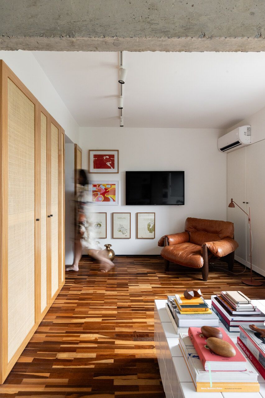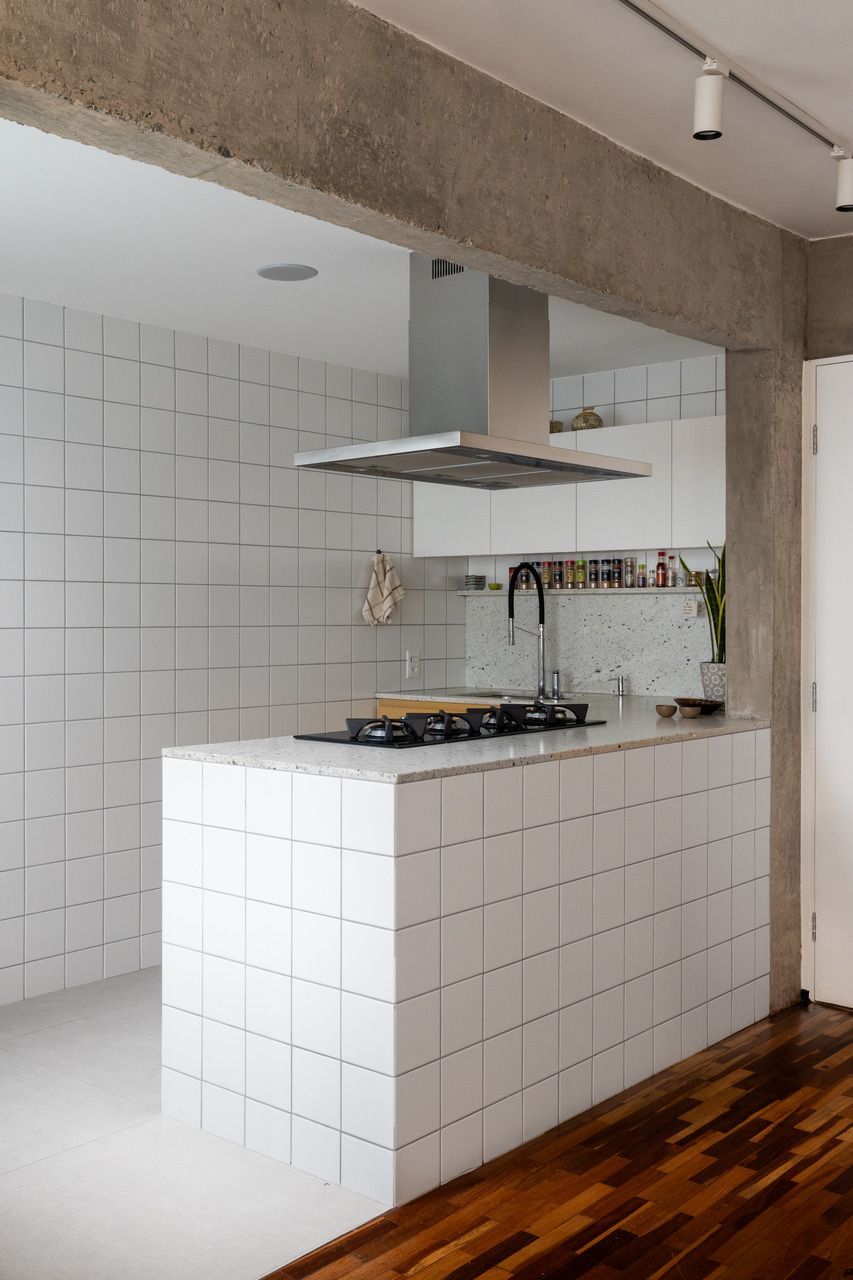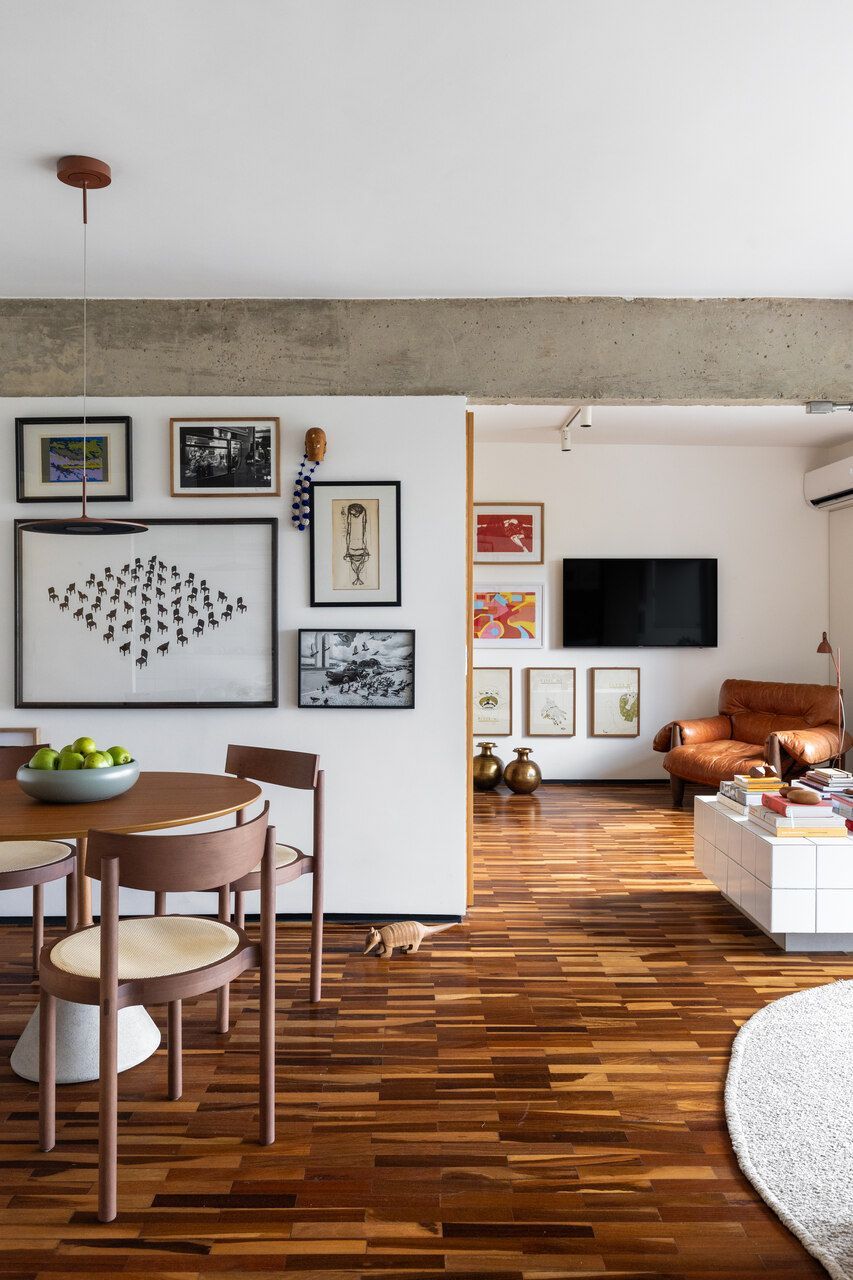 A planta original, bastante compartimentada — uma característica comum dos imóveis de dois quartos da região — representava um desafio para quem desejava mais integração e luz natural. A solução encontrada pelos arquitetos foi demolir diversas paredes, expondo vigas, pilares e tubulações e revelando a estrutura original do edifício, o que se tornou um dos principais elementos visuais do projeto.