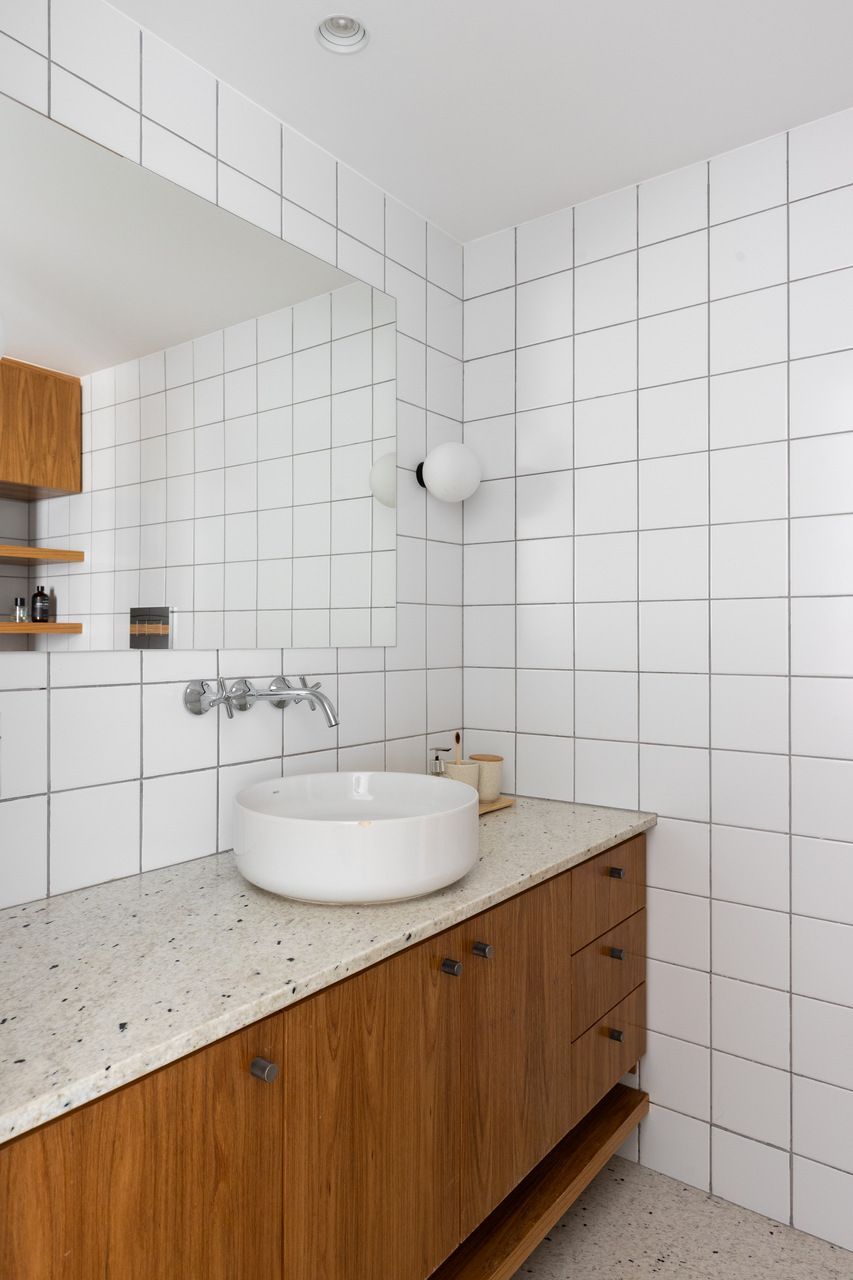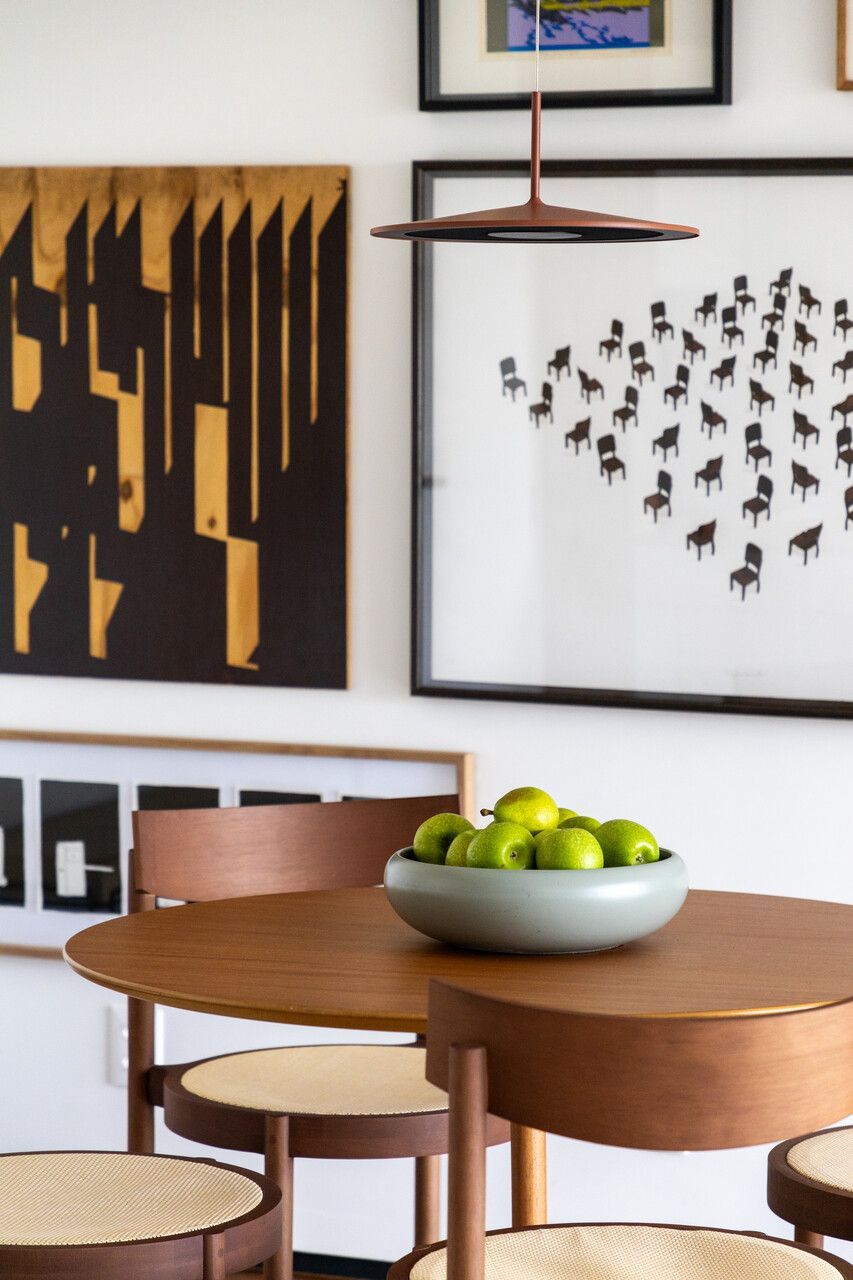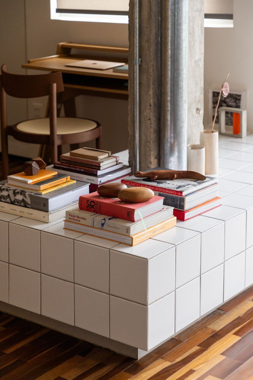 A madeira tem papel central na ambientação: ela aparece no piso — feito com tacos reciclados de demolição —, no mobiliário e na marcenaria da sala. Outro destaque é o uso de azulejos brancos 15×15 cm, típicos das construções mais antigas de Brasília, aplicados na cozinha, banheiros e em um aparador multifuncional na sala de estar, que também serve como banco e mesa.