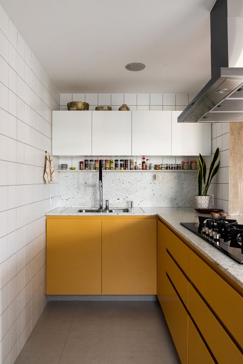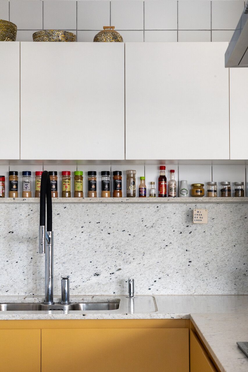 A linguagem visual do projeto parte de uma base branca que destaca o concreto aparente da estrutura. Detalhes em amarelo mostarda aparecem em pontos estratégicos, como nas portas inferiores dos armários da cozinha e no interior de um armário na sala, trazendo um toque de cor sem perder a sobriedade.