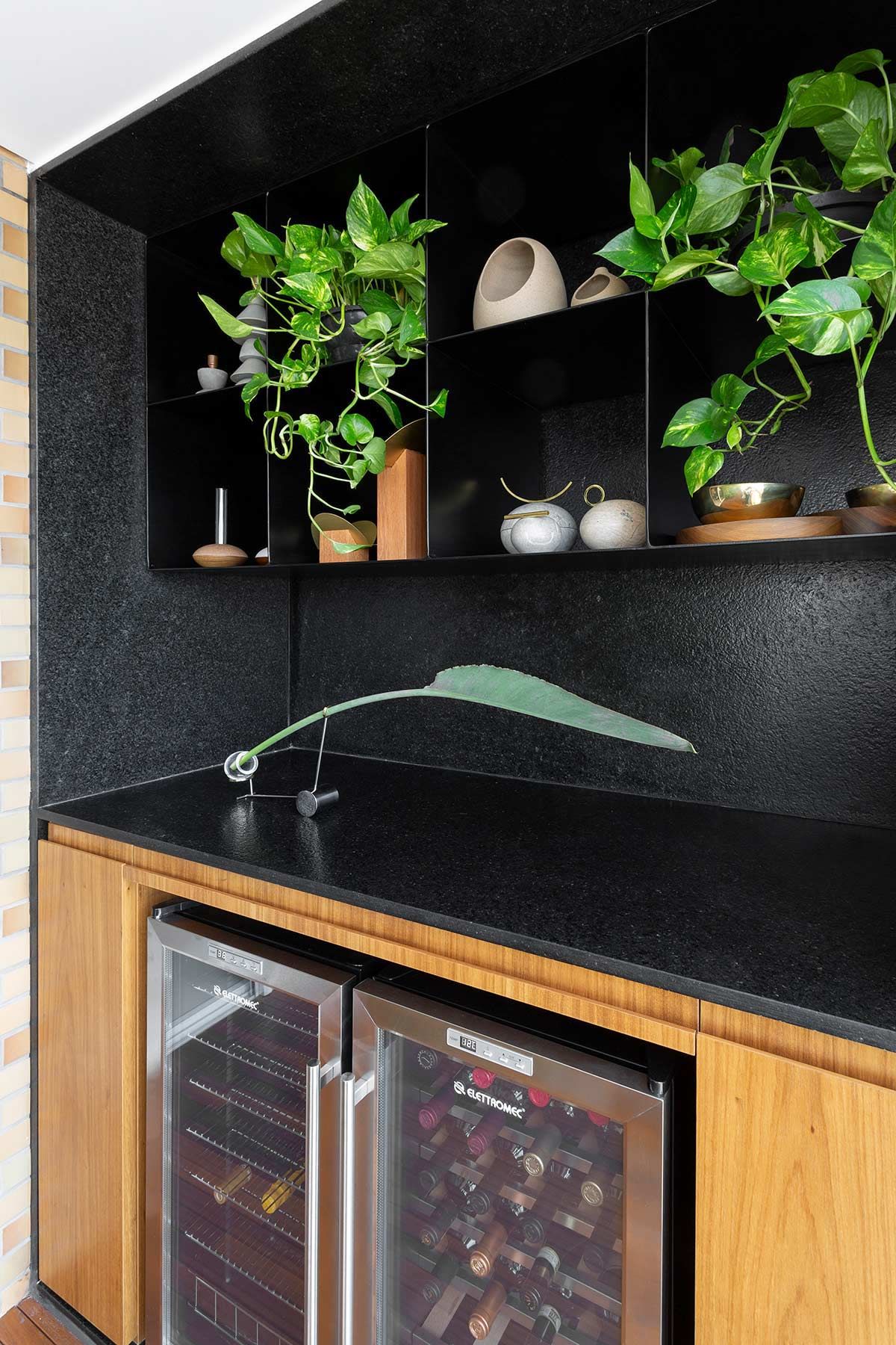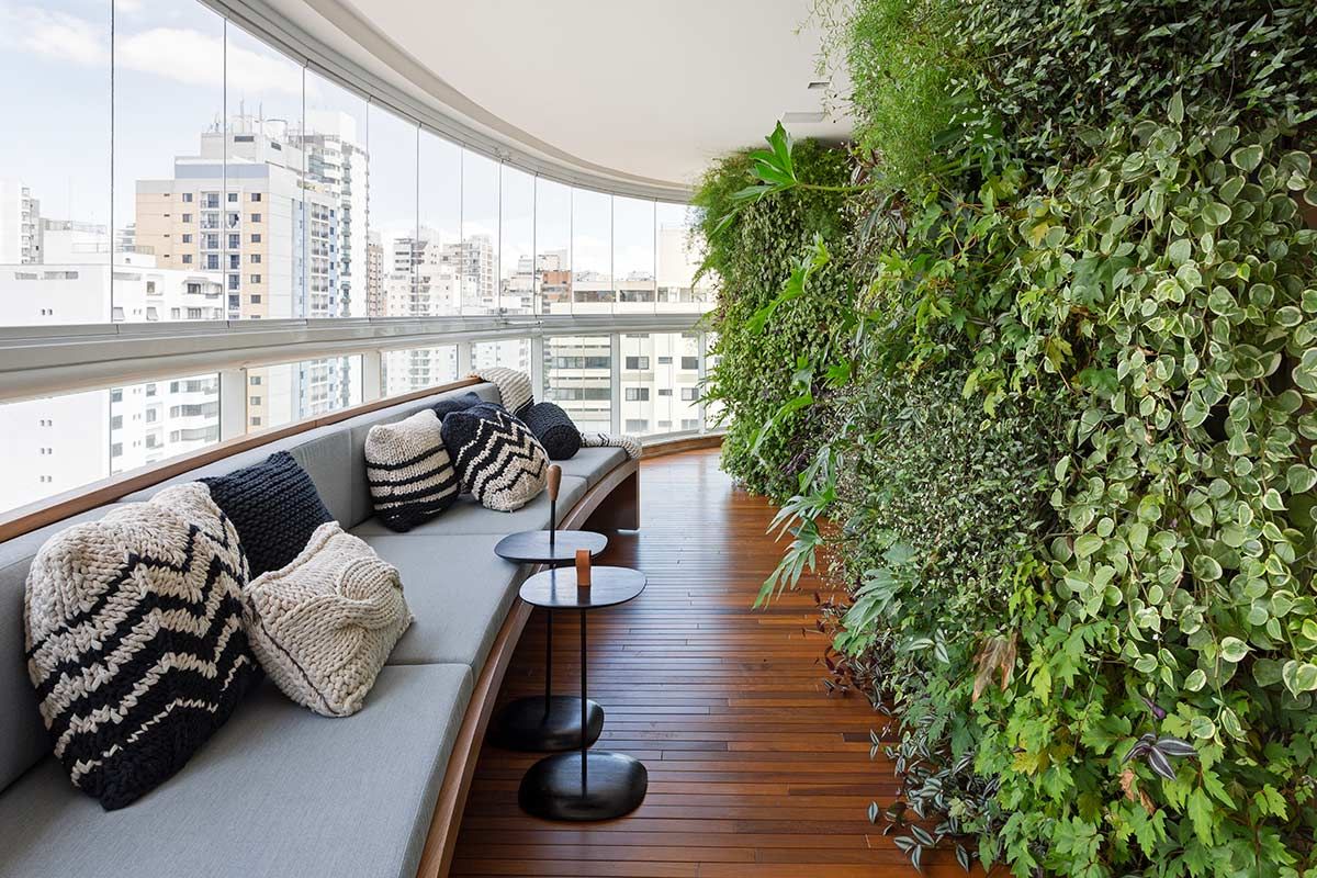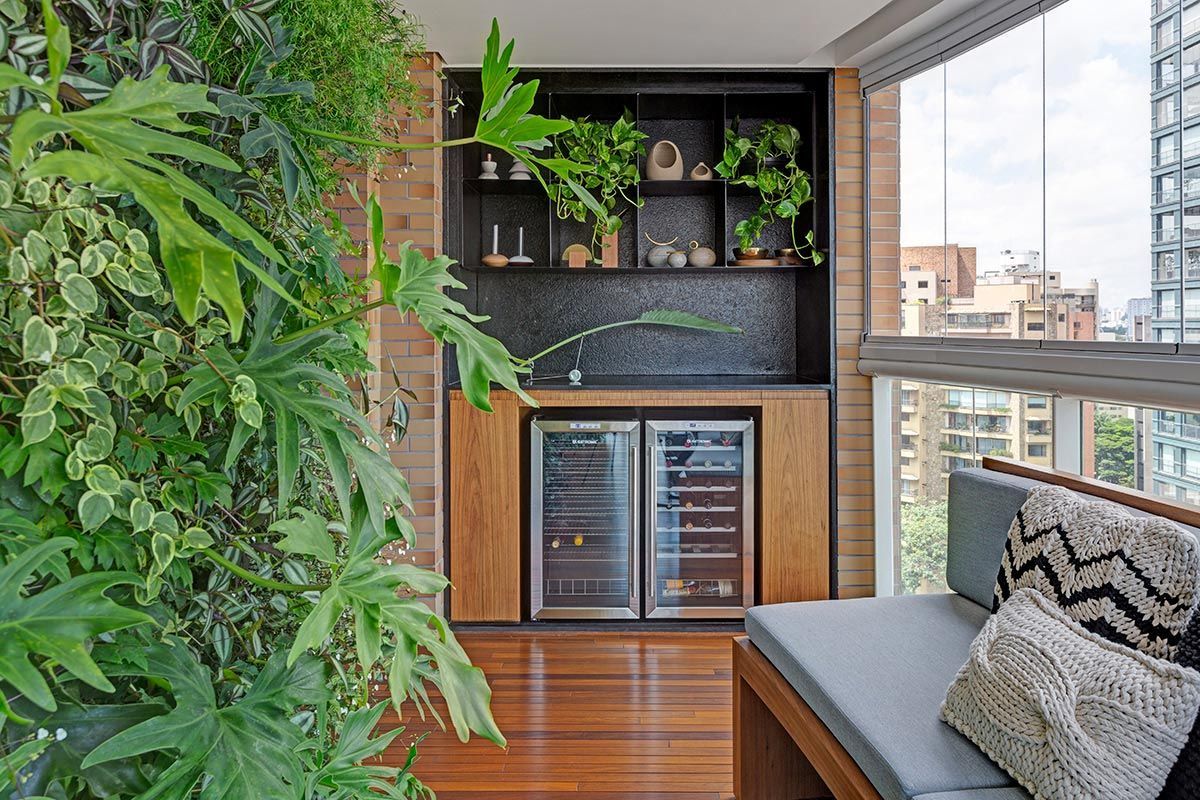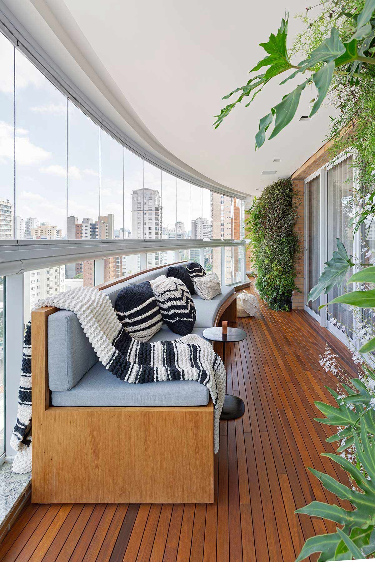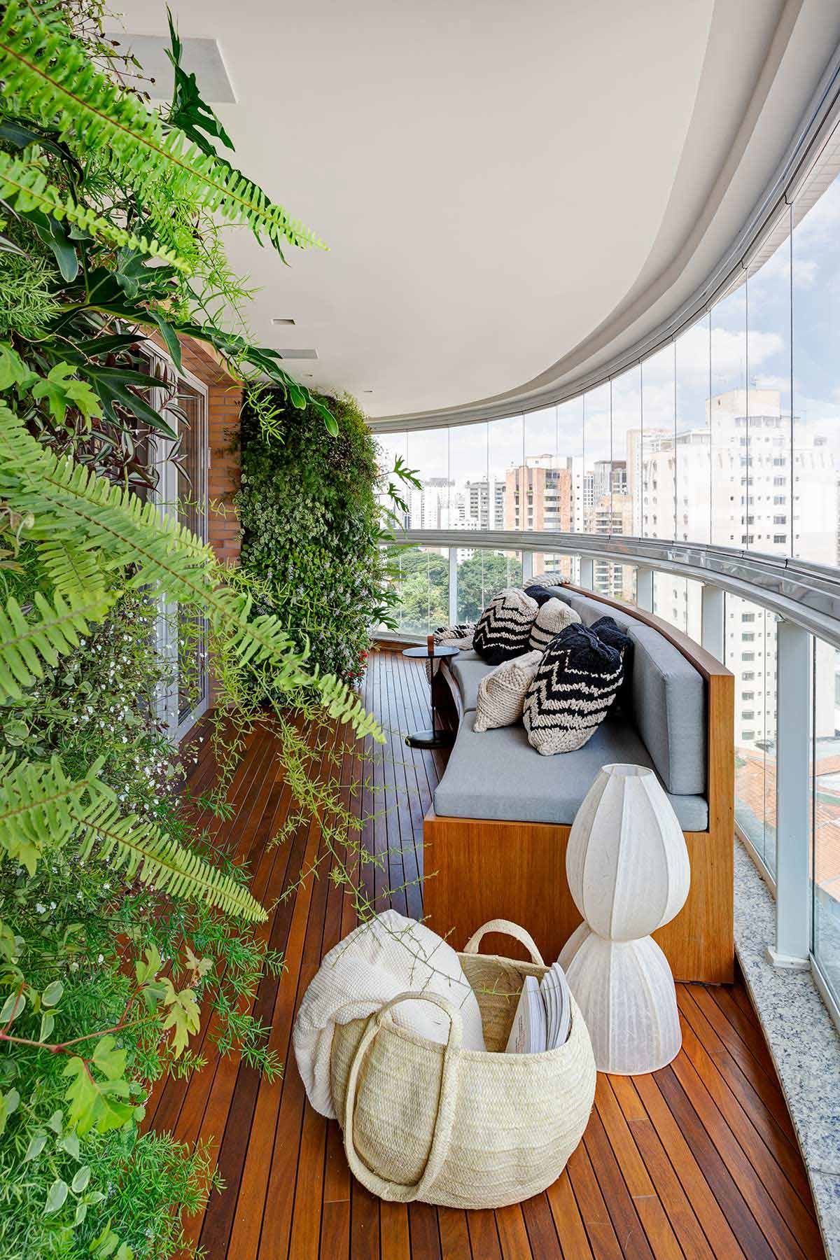O layout da varanda foi um desafio, por conta da fachada curva do edifício. Seguindo esse formato, os bancos foram feitos em freijó, complementados pelas almofadas e mantas feitas manualmente em tricô pela Srta. Galante, além de um jardim vertical recheado de plantas. Os dois terraços seguem a mesma linguagem, para serem vistos como um único ambiente. Como a churrasqueira era pouco utilizada, ela foi substituída por uma estante com adegas que deixou o espaço bem convidativo.