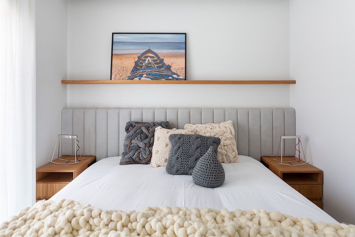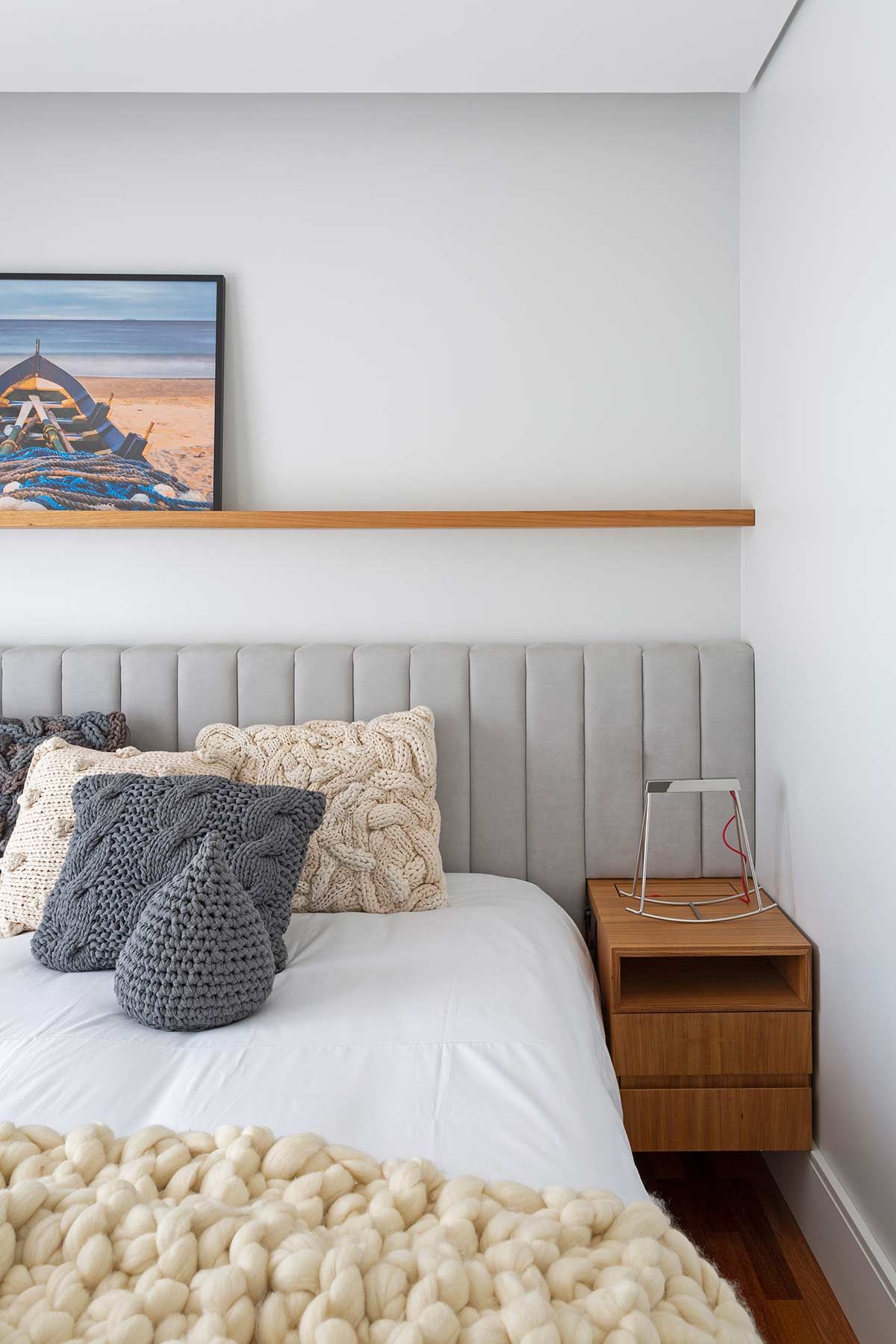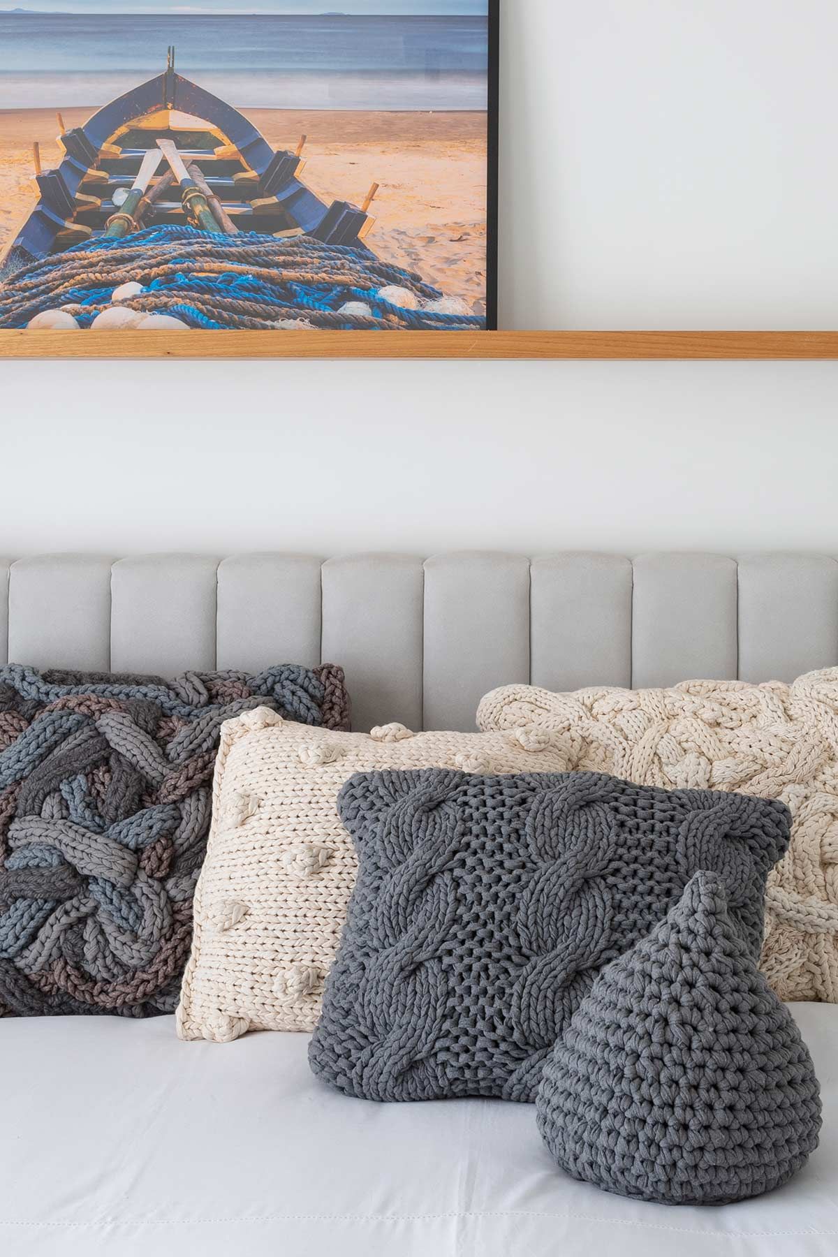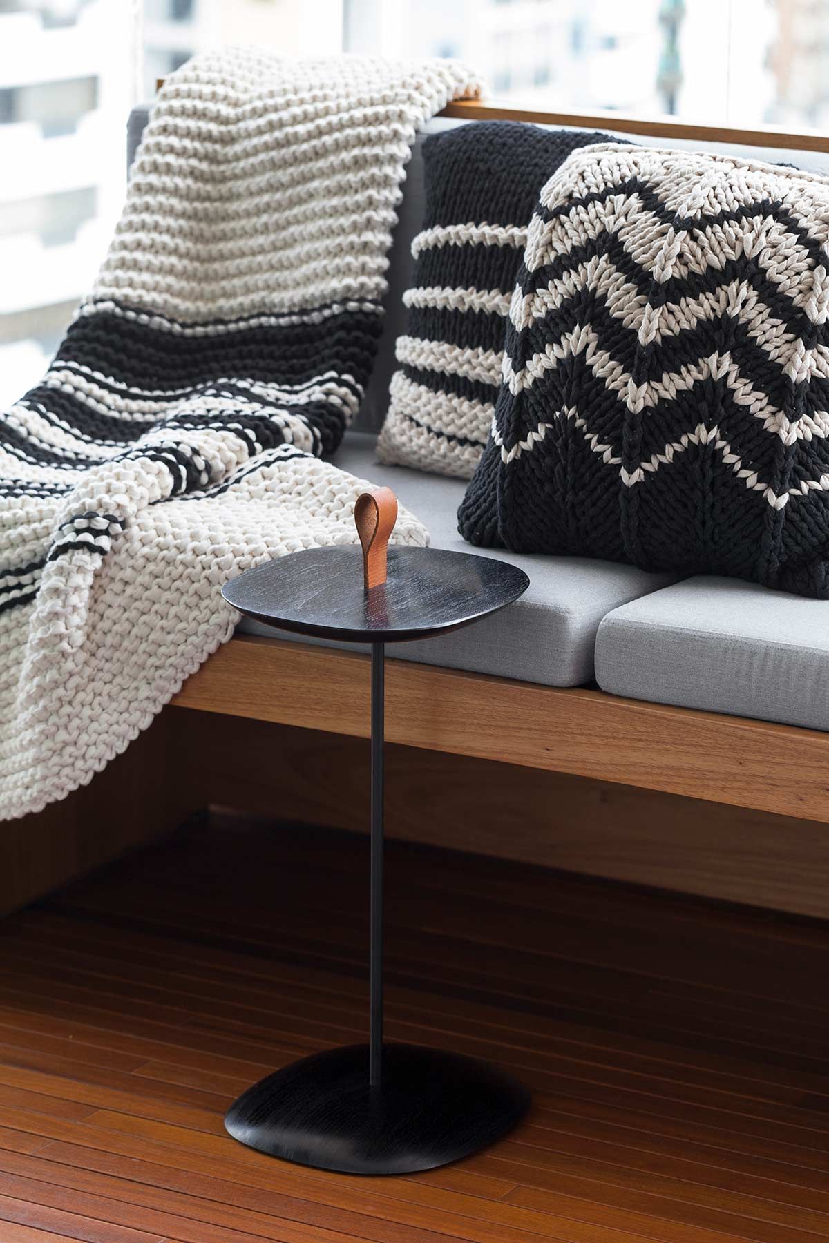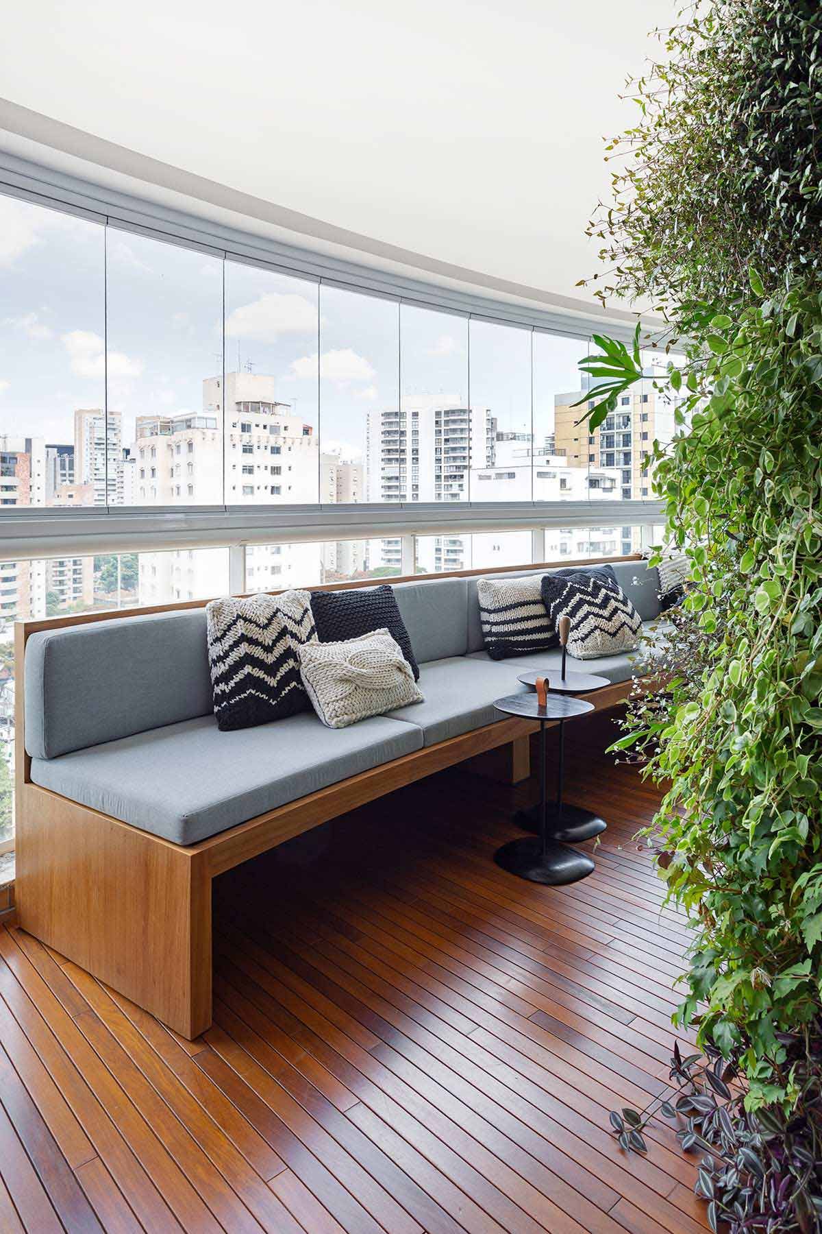 O layout da varanda foi um desafio, por conta da fachada curva do edifício. Seguindo esse formato, os bancos foram feitos em freijó, complementados pelas almofadas e mantas feitas manualmente em tricô pela Srta. Galante, além de um jardim vertical recheado de plantas. Os dois terraços seguem a mesma linguagem, para serem vistos como um único ambiente. Como a churrasqueira era pouco utilizada, ela foi substituída por uma estante com adegas que deixou o espaço bem convidativo.